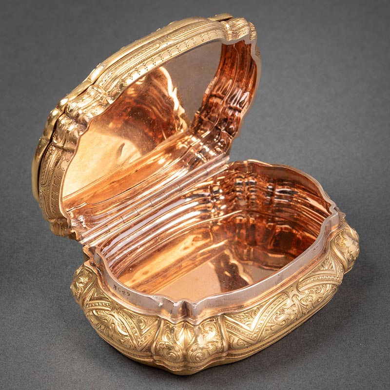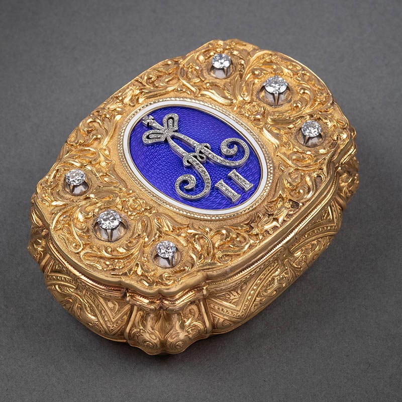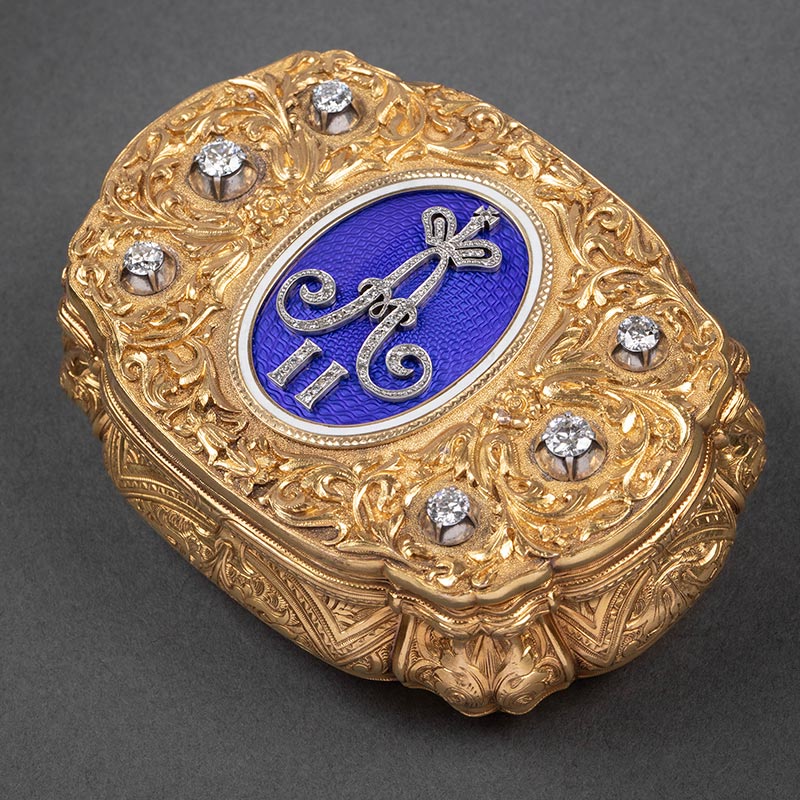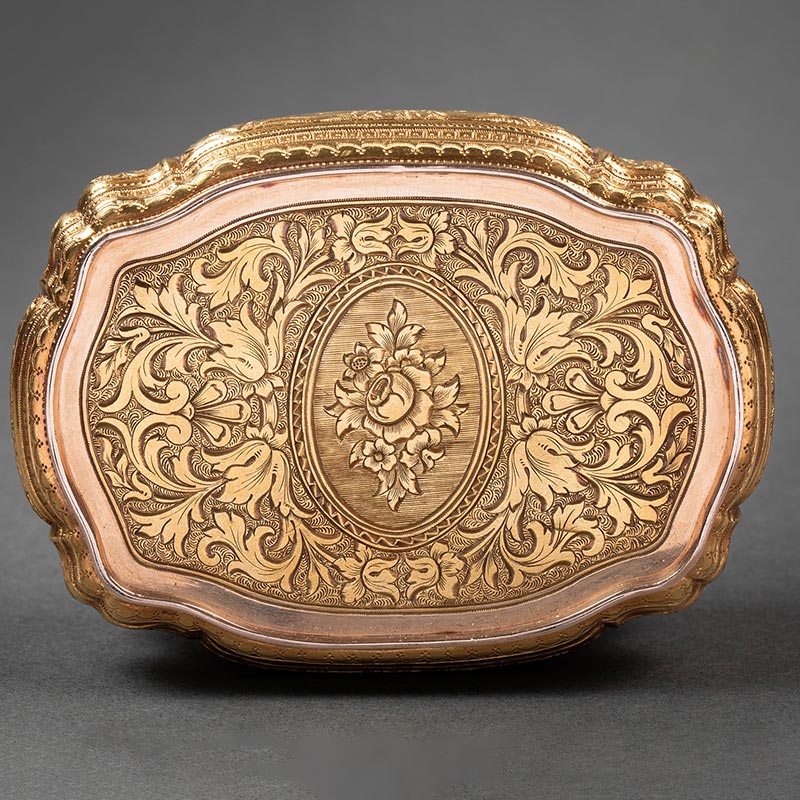 独角鹿西洋古董 19世纪下半叶德国出品沙皇亚历山大二世赠礼款花叶主题18K黄金及玫瑰金精雕装饰玑镂珐琅嵌钻石鼻烟盒