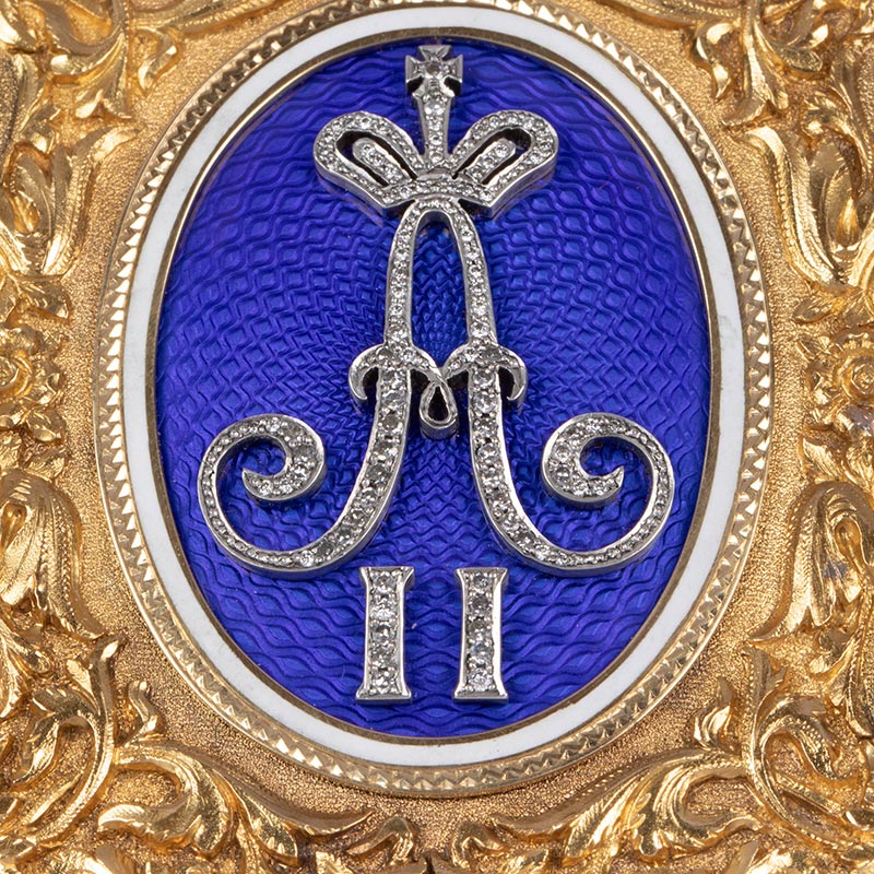 19世纪下半叶德国出品沙皇亚历山大二世赠礼款花叶主题18K黄金及玫瑰金精雕装饰玑镂珐琅嵌钻石鼻烟盒