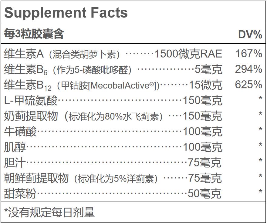 配方还添加了几种促进肝脏解毒的营养物质,包括维生素B6、B12、牛奶蓟、朝鲜蓟[6]和甜菜粉。这些营养成分可以发挥协同的肝脏解毒支持作用。