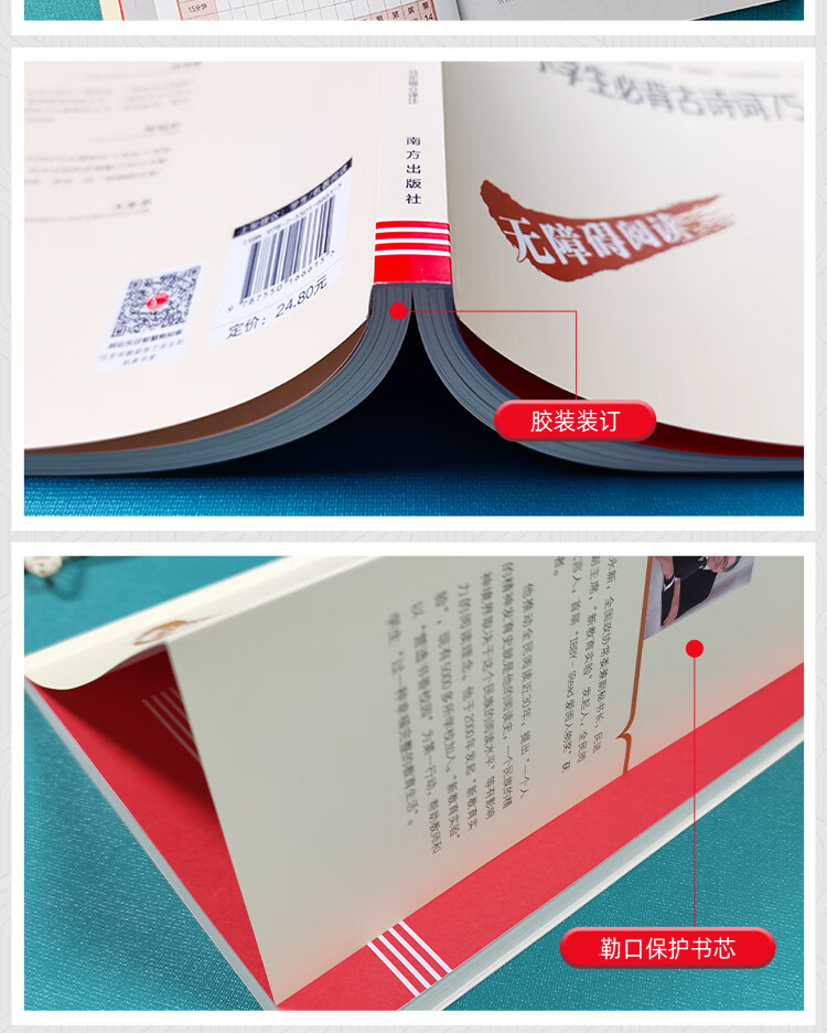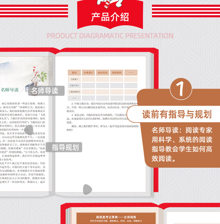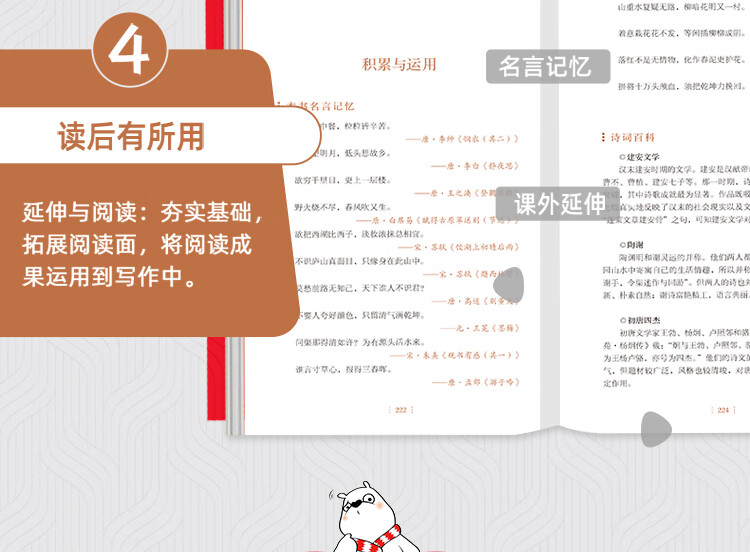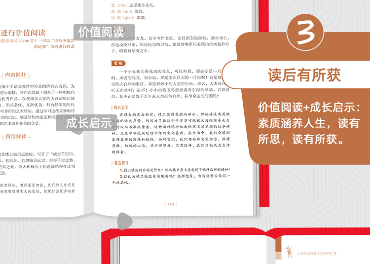 除正文以外,“名师导读”,用引导性的方式,介绍了作品内容及相关阅读规划;“如何进行价值阅读”对“诗句中蕴含的道理”进行了分析,总结提炼出价值点;章节前的引导语,结合古诗词内容进行阅读的引导;“作者简介”介绍了作者的基本情况,辅助读者理解作品,随文设置;“成长启示及要点思考”则对古诗词所蕴含的哲理进行了探析,并引导读者独立思考;“积累与运用”中的“诗词百科”和“诗歌类别”等栏目帮助读者进一步了解古诗词历史,理解作品创作背景。