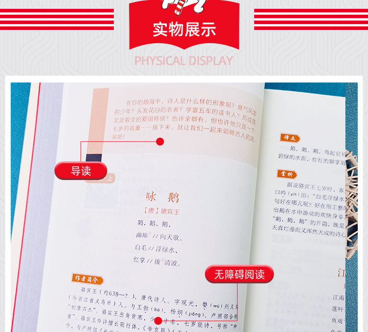 据说骆宾王七岁时,客人指着池塘中的鹅让他作诗,骆宾王脱口吟(yín)出:“白毛浮绿水,红掌拨清波。”客人连连赞叹。这两句好在哪儿呢?好在用工整的对仗、鲜亮的颜色、生动的动词,写出鹅在水中游动的欢快身姿。前两句则用声音带来一片勃勃生机。“鹅,鹅,鹅”的开篇,既是点题,也是拟声,正是孩童不事雕琢、天真烂漫而又浑然天成的诗心诗情。