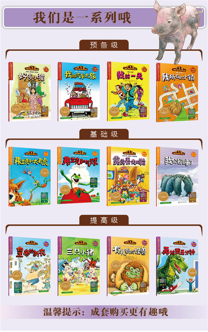 “儿童英语分级亲子共读绘本”系列共包含12个分册,采用国际通用Guided Reading Level分级法分为“预备级”“基础级”“提高级”3级,为不同年龄段和对应英语水平孩子精心设计,每个级别包含4个分册,每个分册讲述一个生动有趣的故事,用词及语句长度难度适合对应级别能力水平。