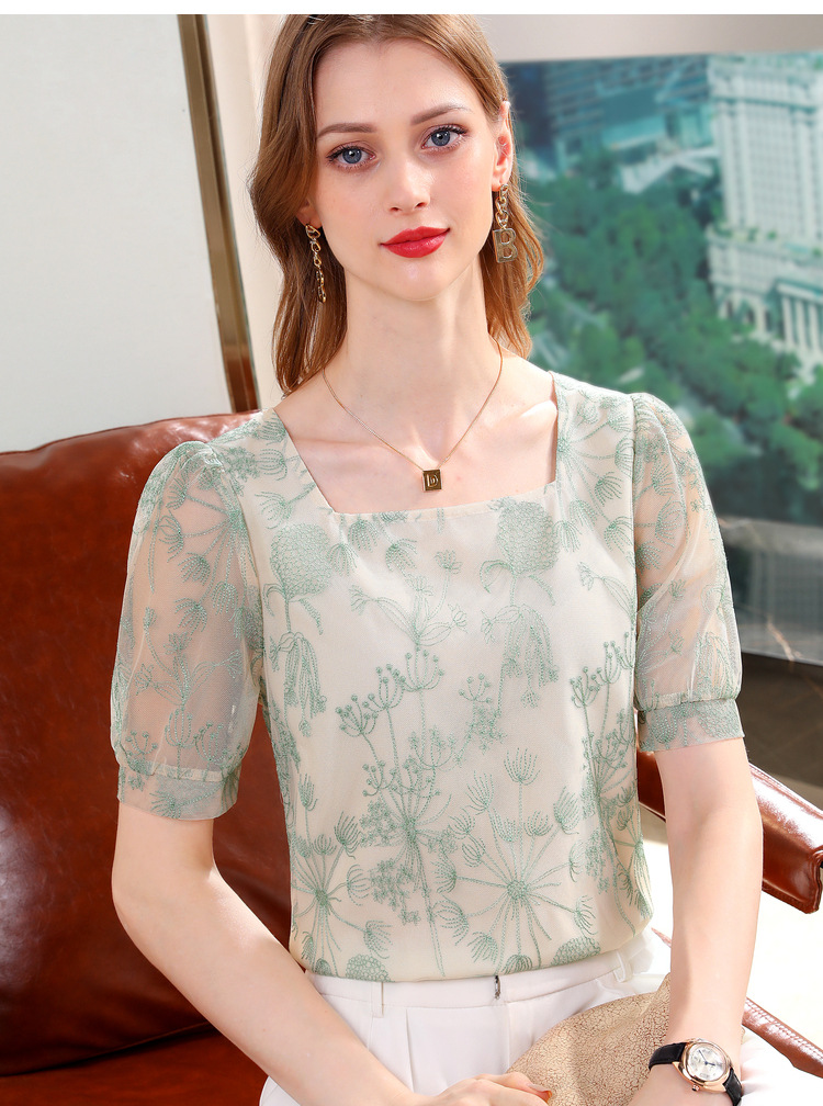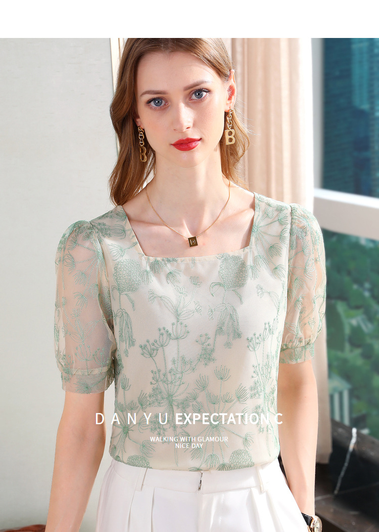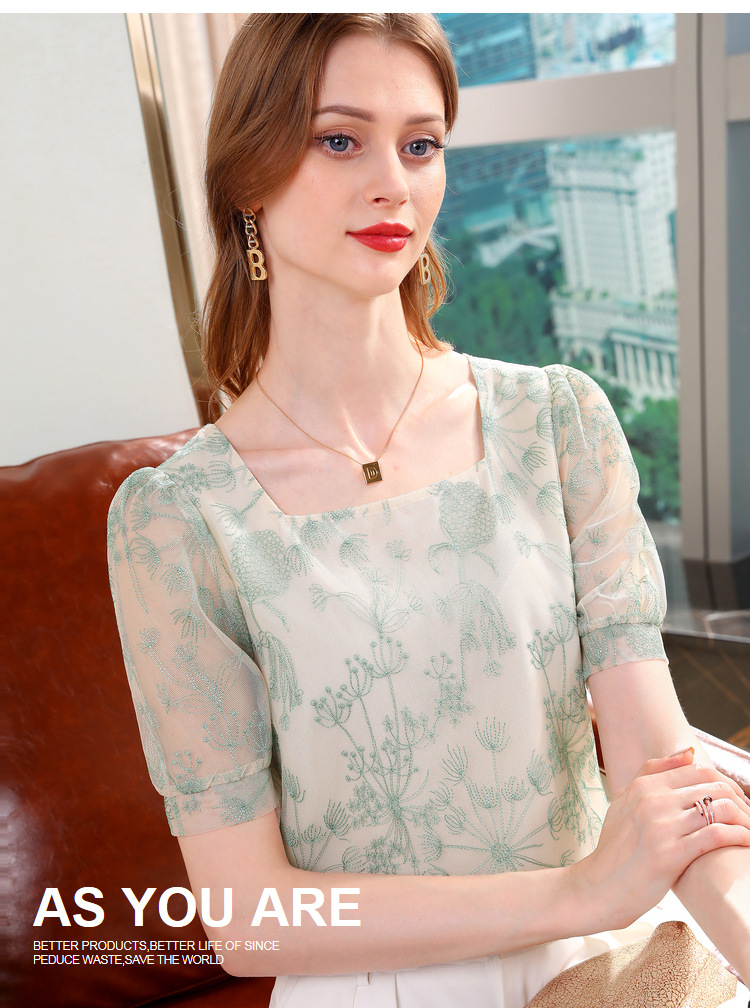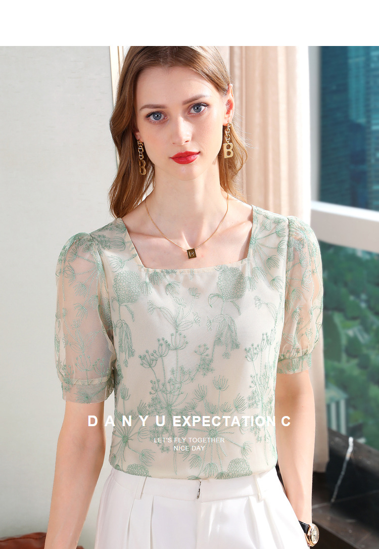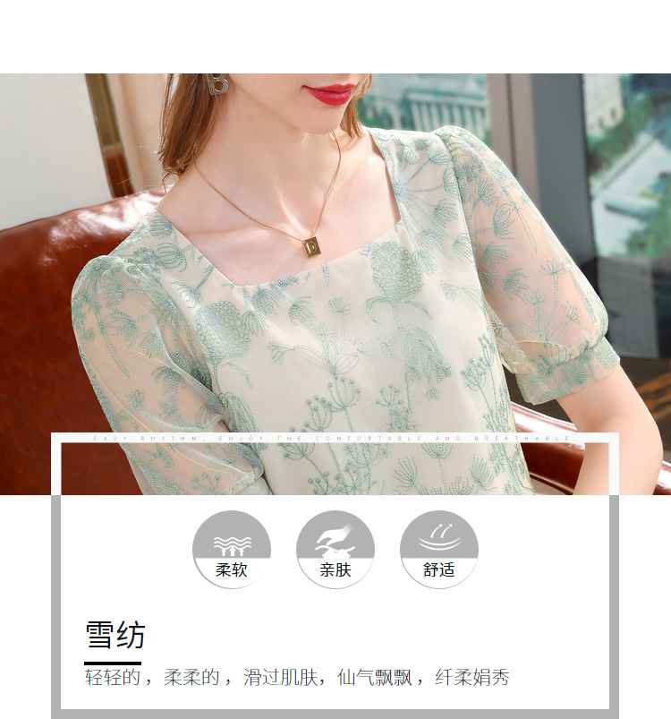 短袖雪纺衫,刺绣雪纺洋气小衫法式方领泡泡袖上衣SG-T2X0074