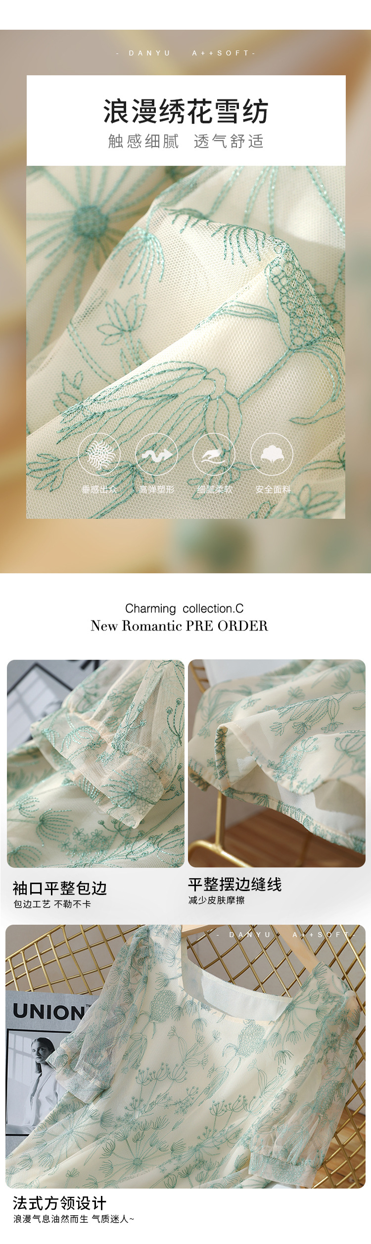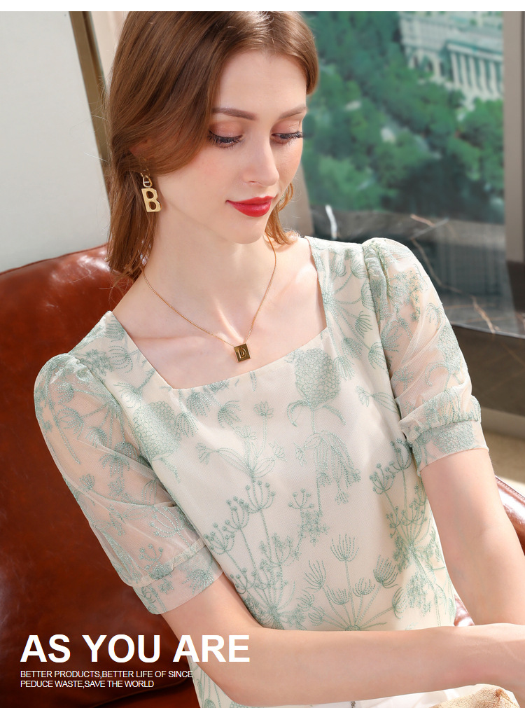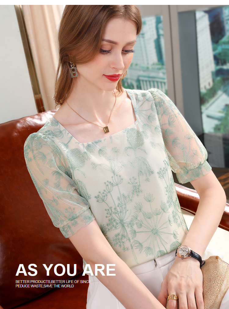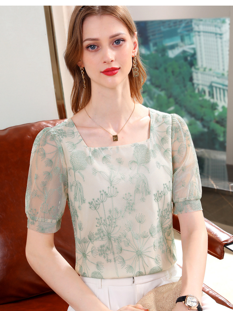 短袖雪纺衫,刺绣雪纺洋气小衫法式方领泡泡袖上衣SG-T2X0074