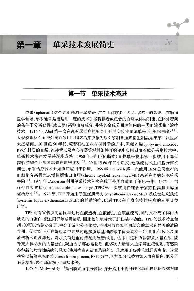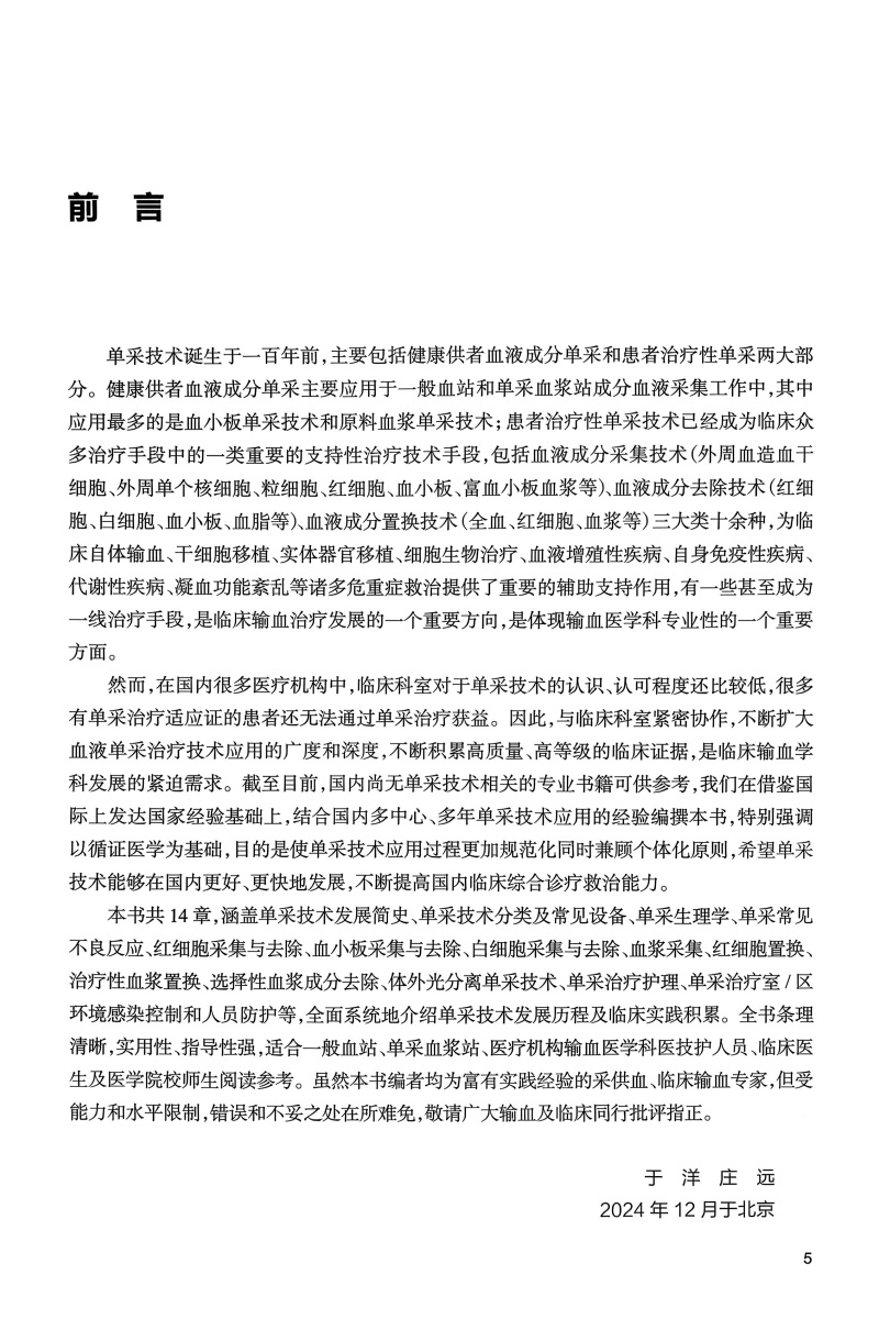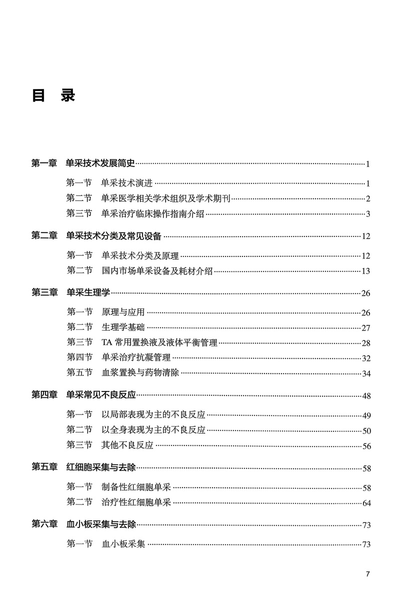 以单采技术为主线,围绕每一类技术的前言、工作原理、适应症和禁忌症、采集量、去除量或循环量计算、操作技术要点、疗效评估进行阐述,力求理论联系实际,使读者在充分掌握技术原理的同时,增强对实际操作的全面理解。本书计划分为十八个章节,内容包括单采技术发展简史、国内市场主要单采设备简介、单采生理学、外周血干细胞/免疫细胞采集、自体成分血采集、原料血浆采集、供者血小板采集、红细胞置换、血浆置换、淋巴血浆置换、全血置换、半全血置换、选择性血浆成分去除、红细胞去除、血小板去除、白细胞去除、光分离单采(置换)技术、单采护理。适用读者人群血站、单采浆站、输血科技术人员以及输血医学相关医学生、研究生。