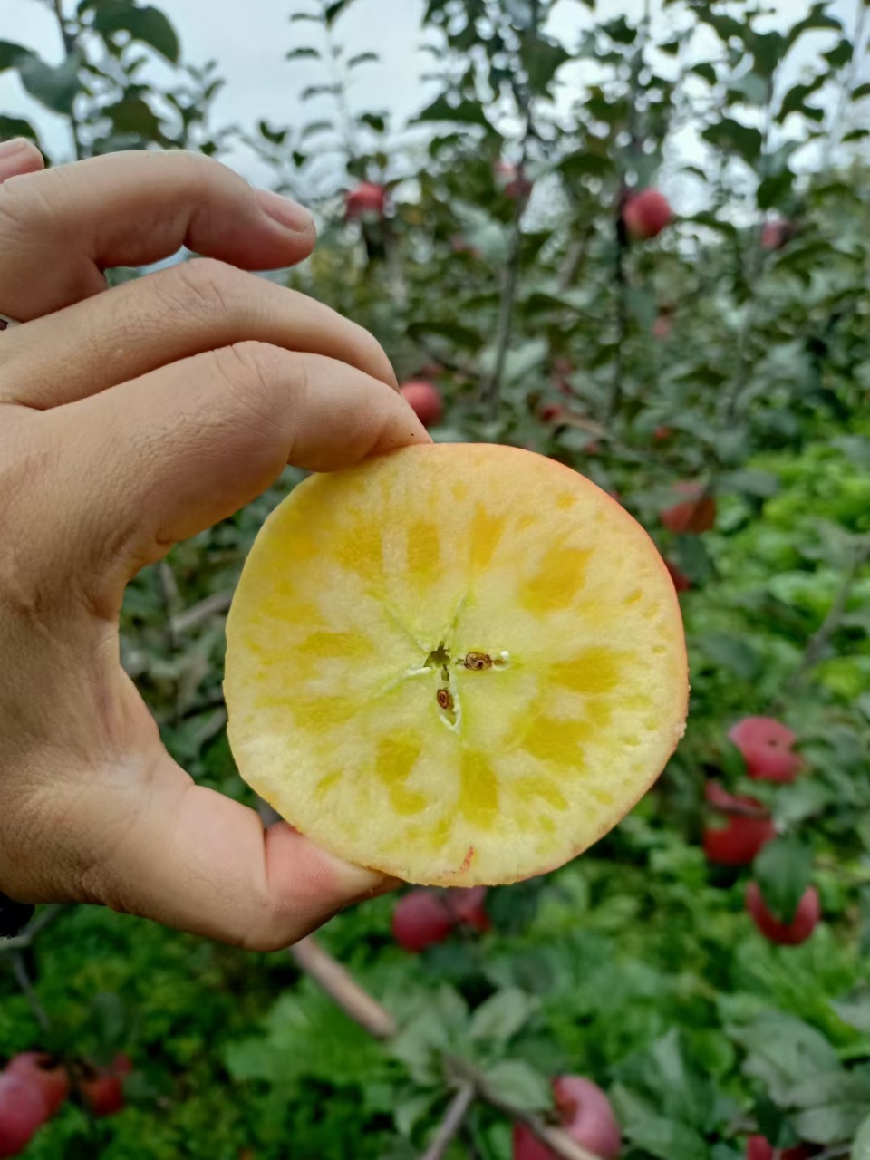 高海拔区域昼夜温差大、光照充足、土壤肥沃,使苹果含糖量高,糖度在18度左右口味特别甜; 冰川雪水浇灌、沙性土壤栽培等特性,使苹果的果核部分糖分堆积成透明状,形成了“糖心”苹果。