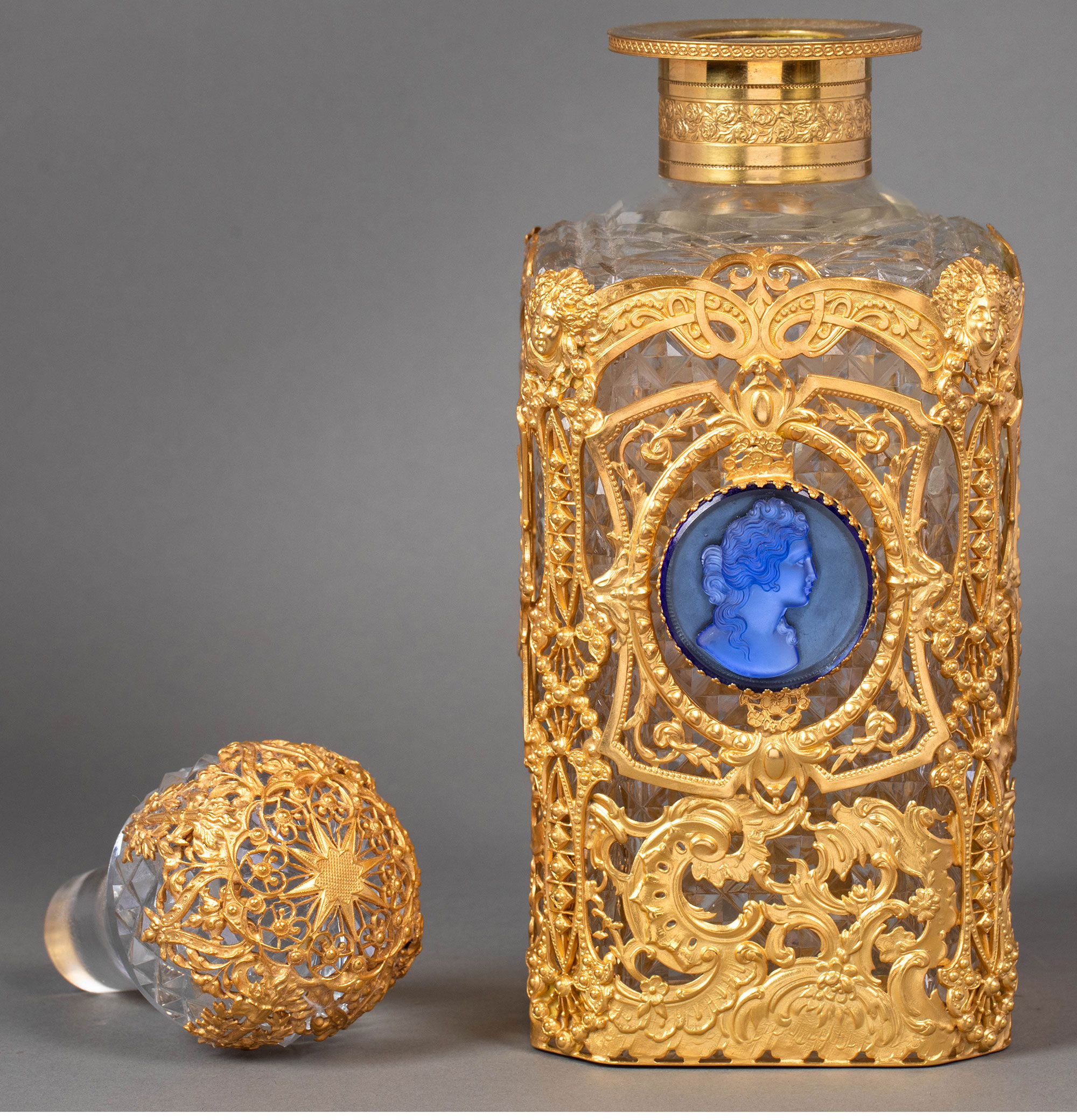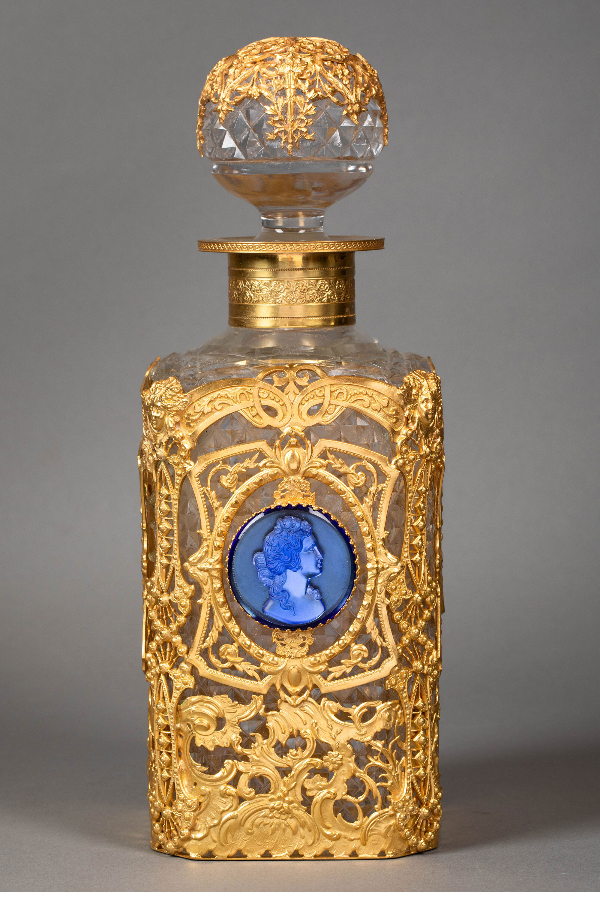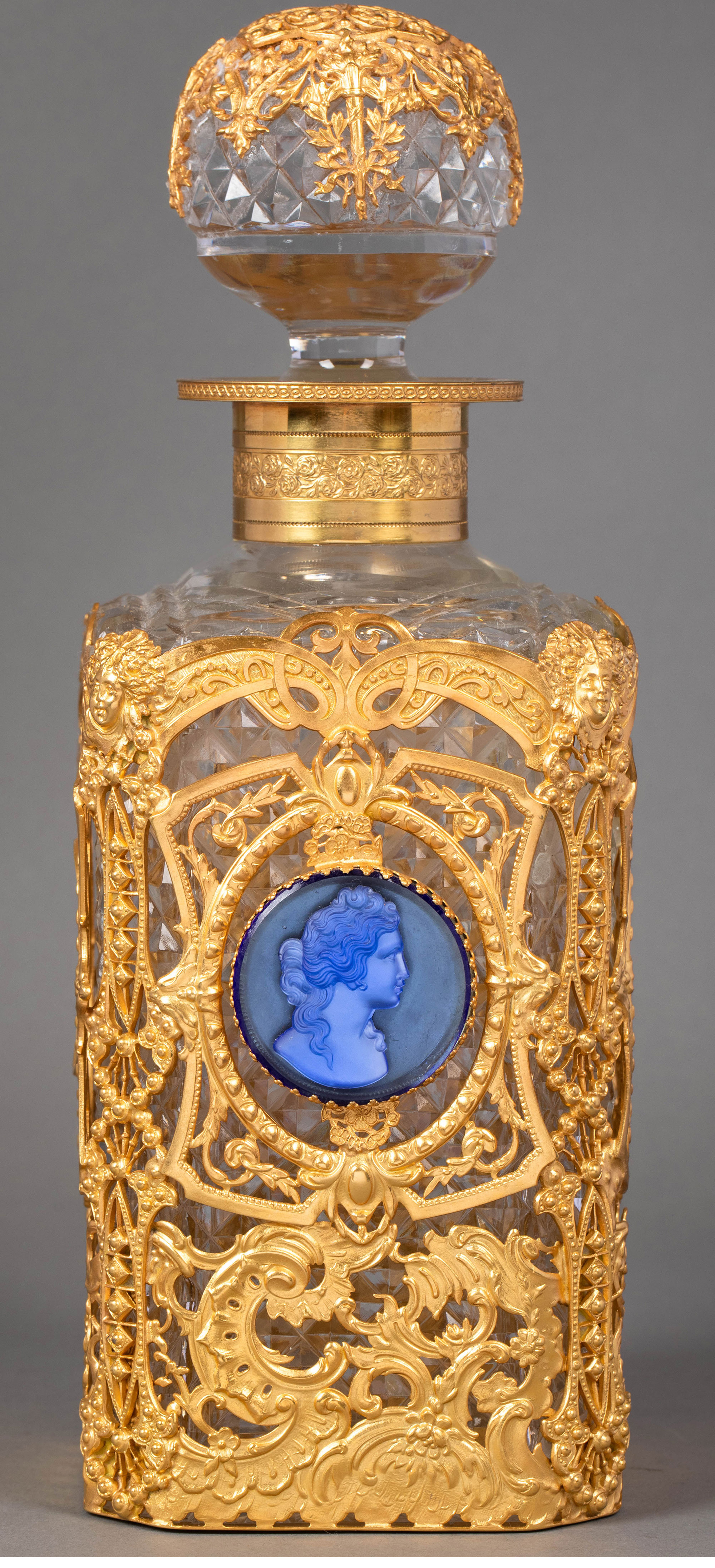 19世纪末法国出品新古典主义风格铜鎏金雕饰古典女子肖像卡梅奥装饰水晶烈酒瓶