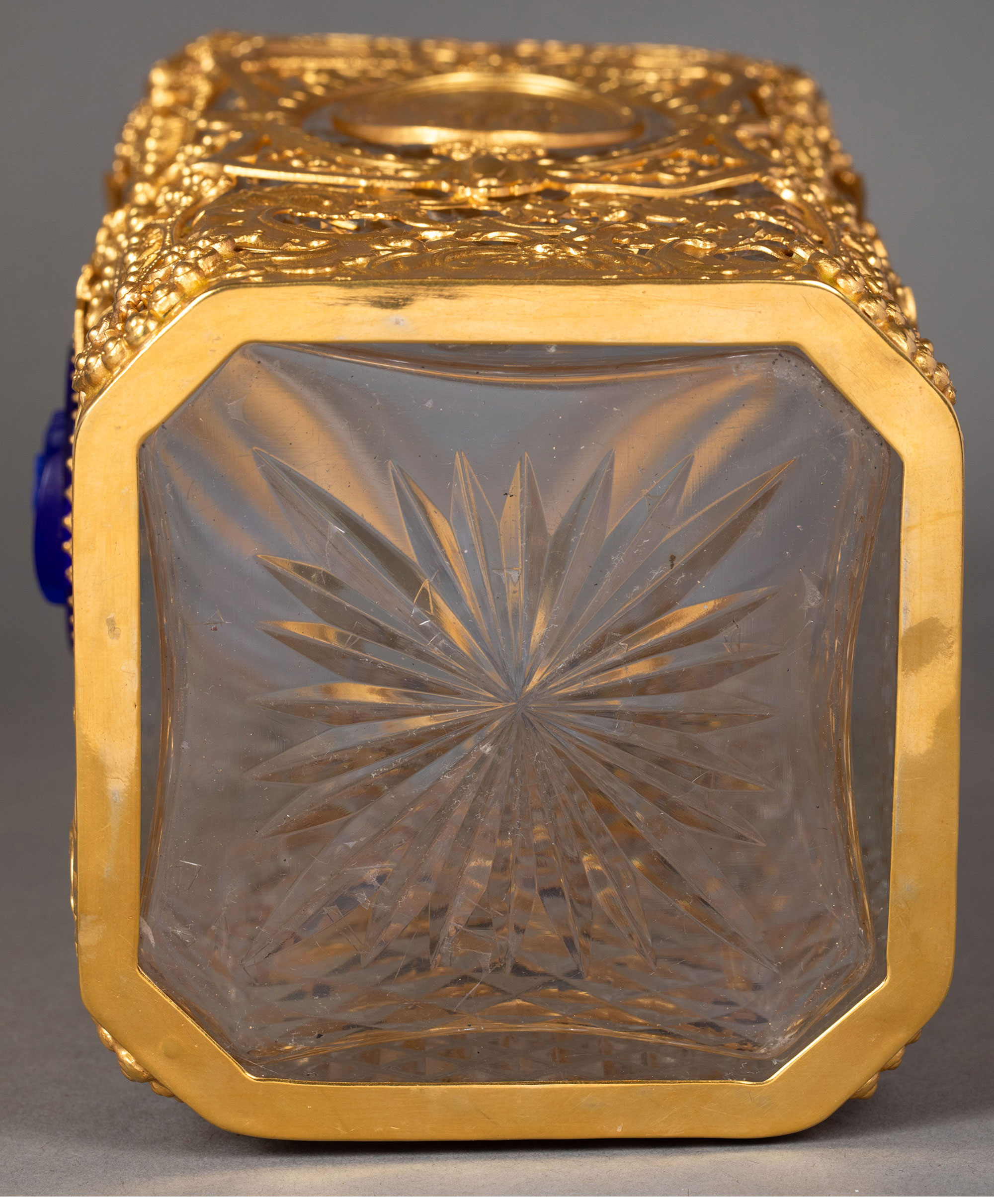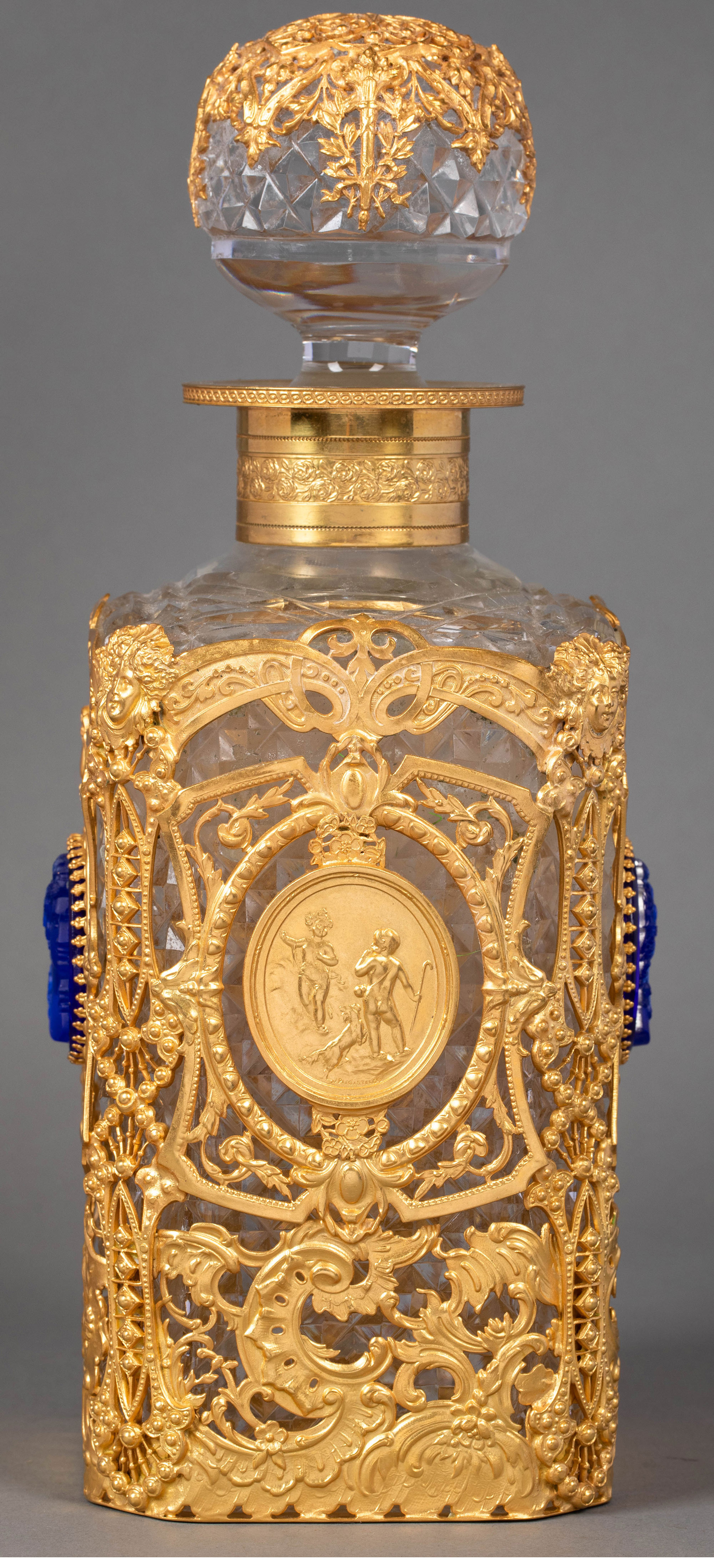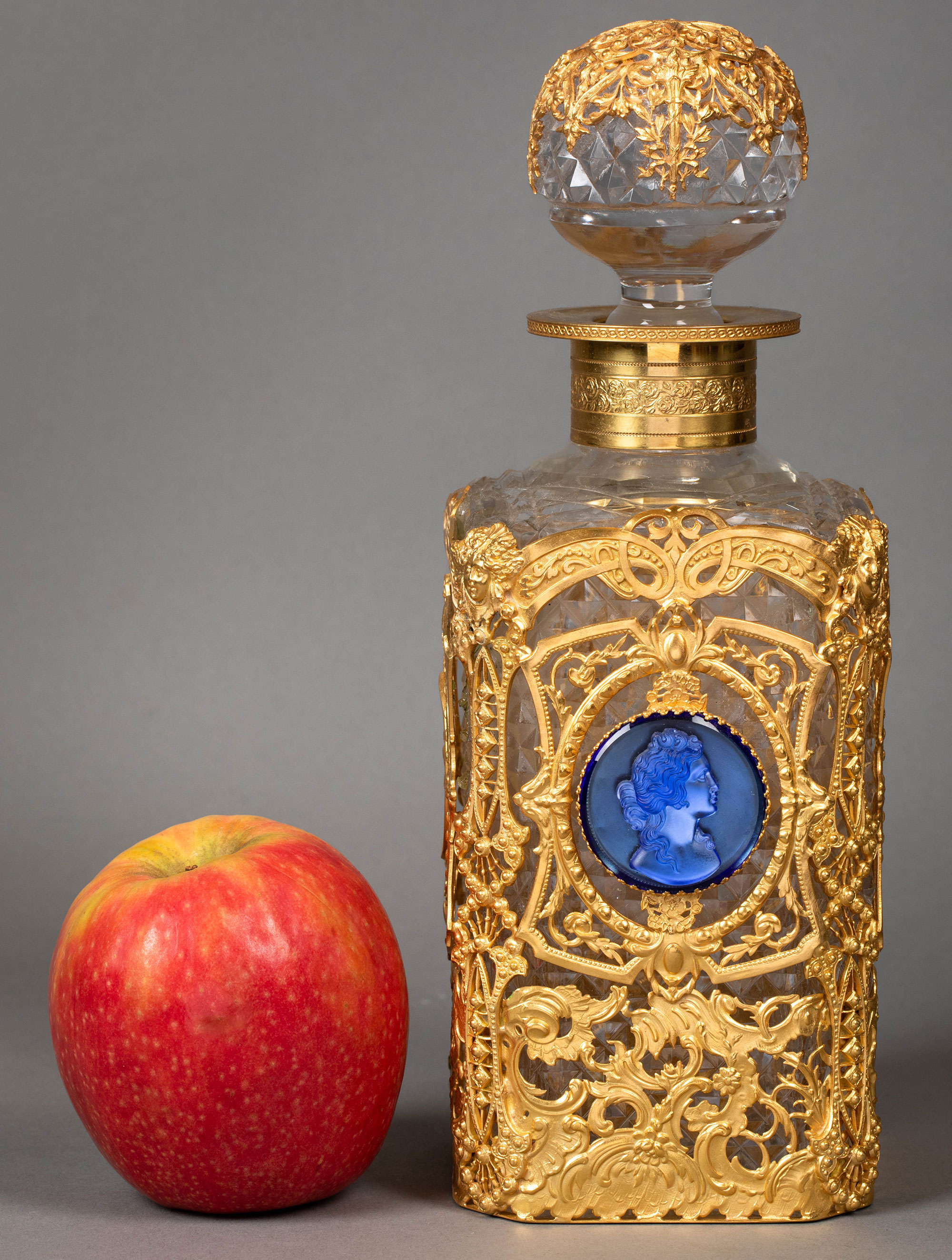 19世纪末法国出品新古典主义风格铜鎏金雕饰古典女子肖像卡梅奥装饰水晶烈酒瓶