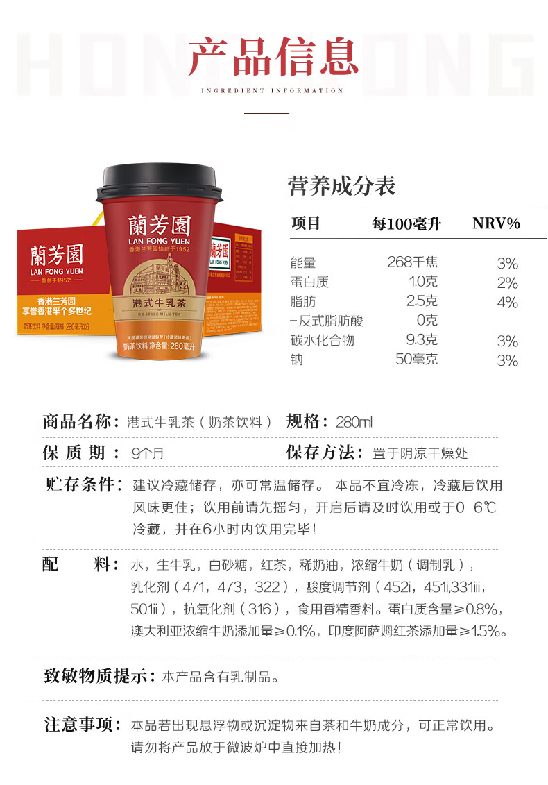 蘭芳園 LAN FONG YUEN 香港兰芳园正宗港式牛乳奶茶280ml*6杯装