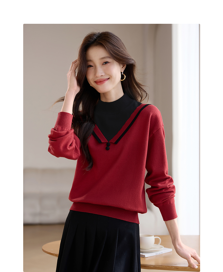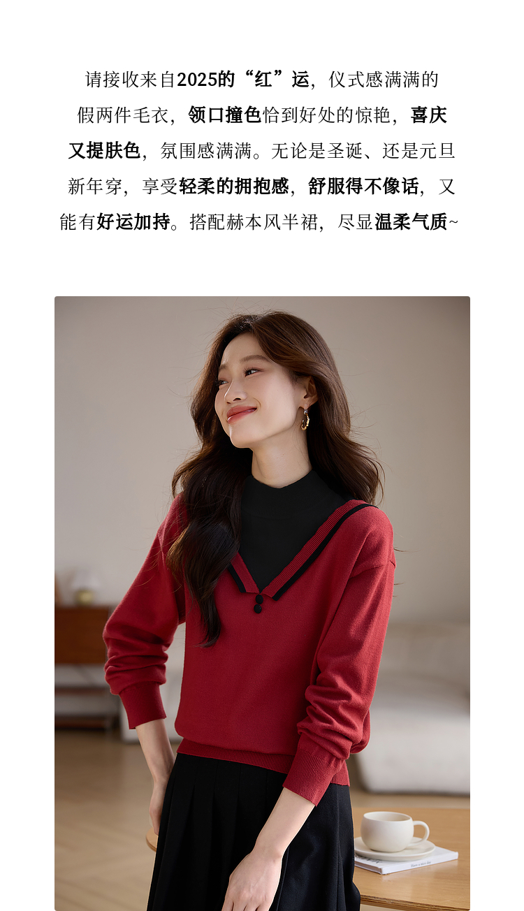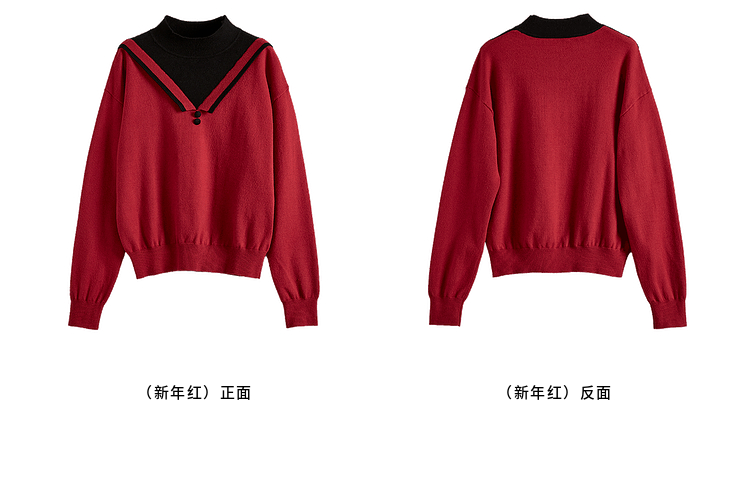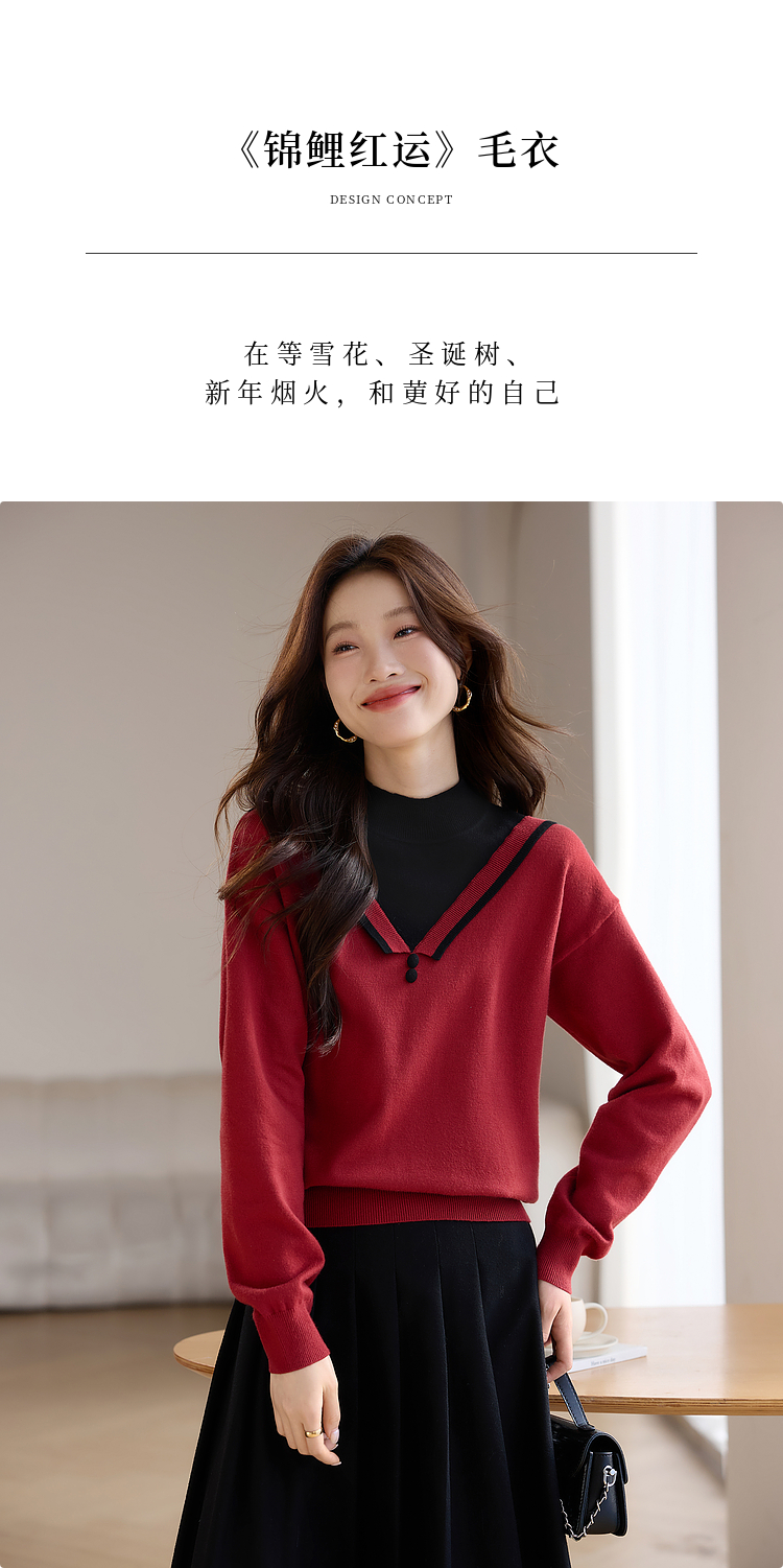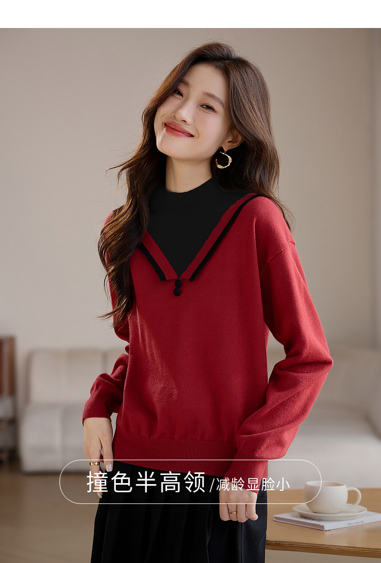 【1件75折】熙世界假两件针织打底衫女秋冬套头宽松撞色半高领拼接圣诞红毛衣