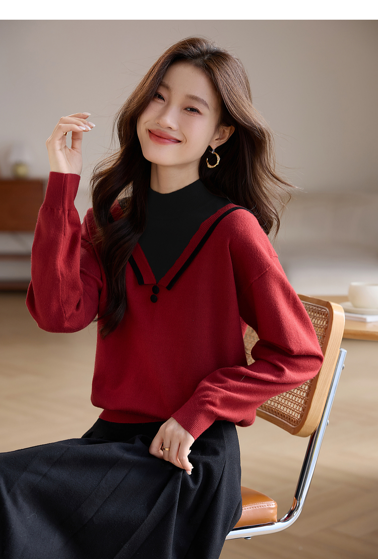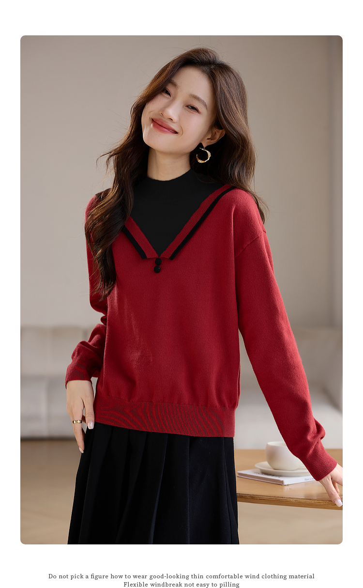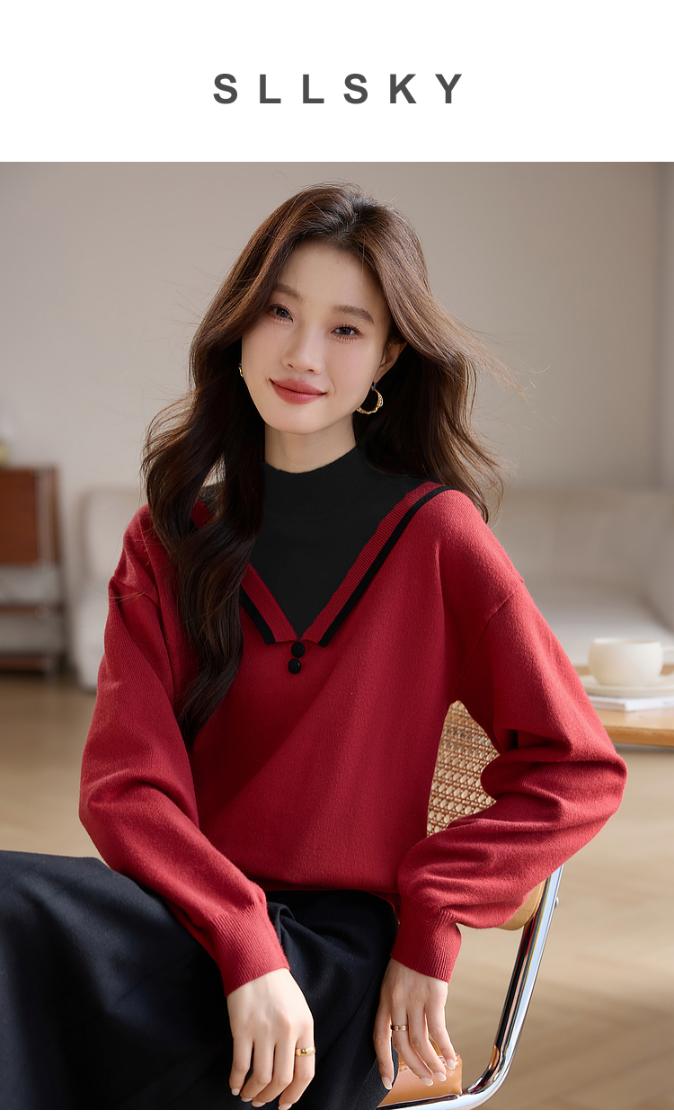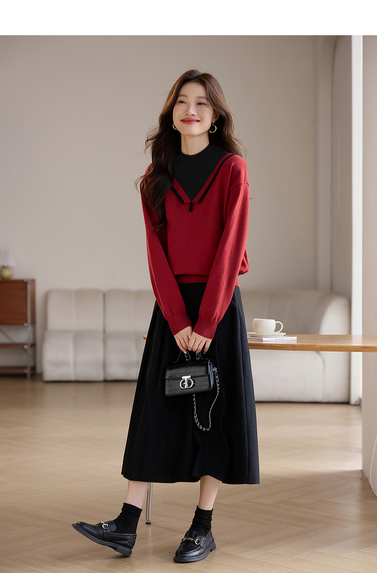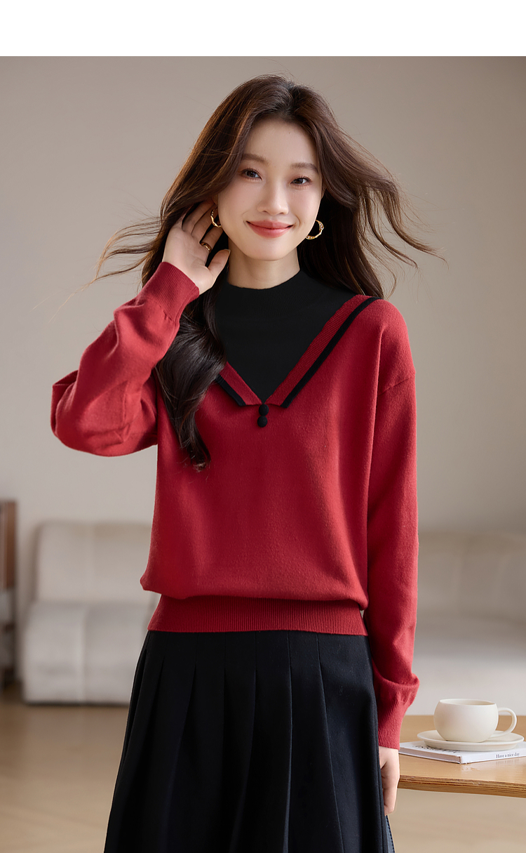 【1件75折】熙世界假两件针织打底衫女秋冬套头宽松撞色半高领拼接圣诞红毛衣