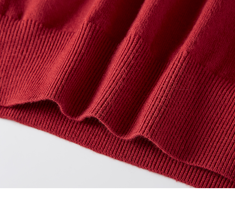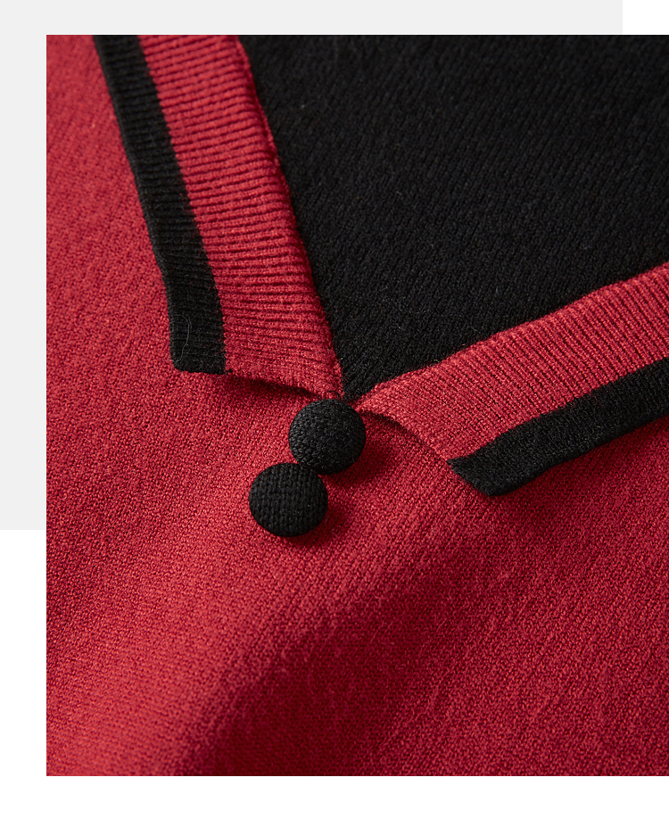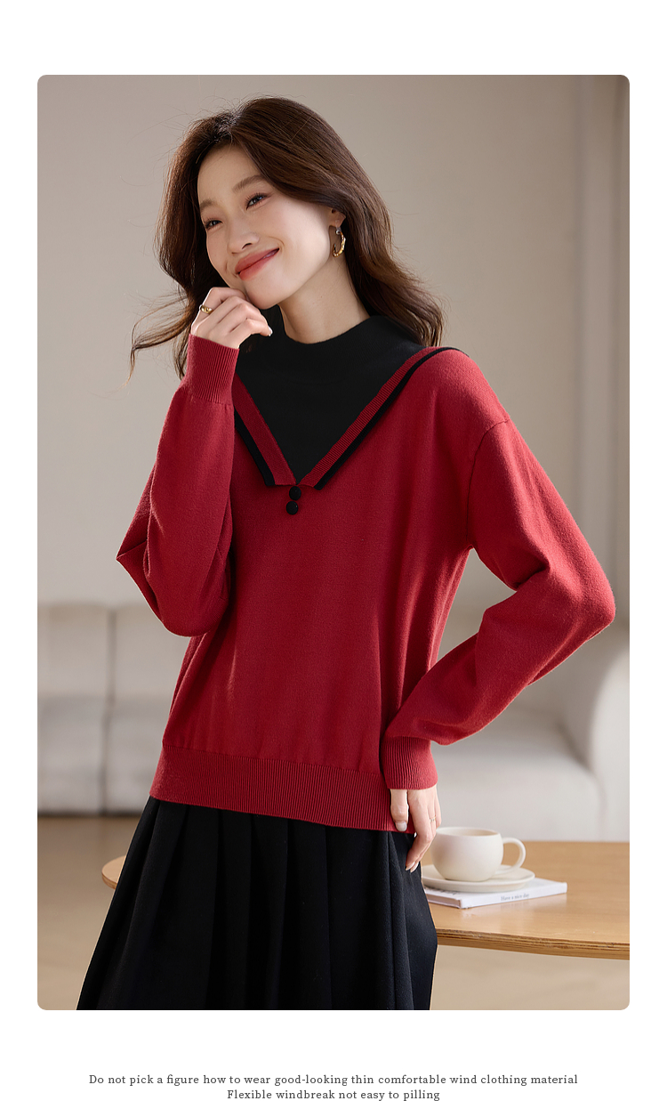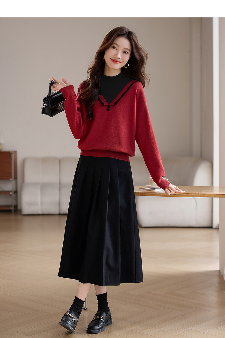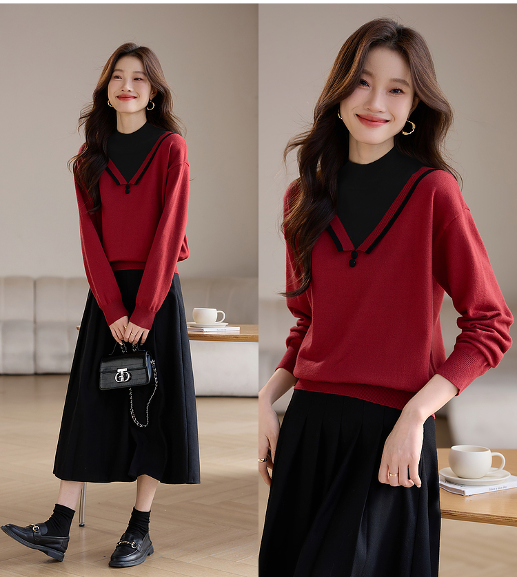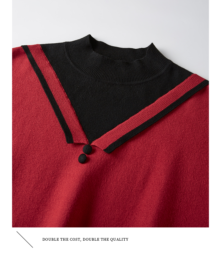 【1件75折】熙世界假两件针织打底衫女秋冬套头宽松撞色半高领拼接圣诞红毛衣