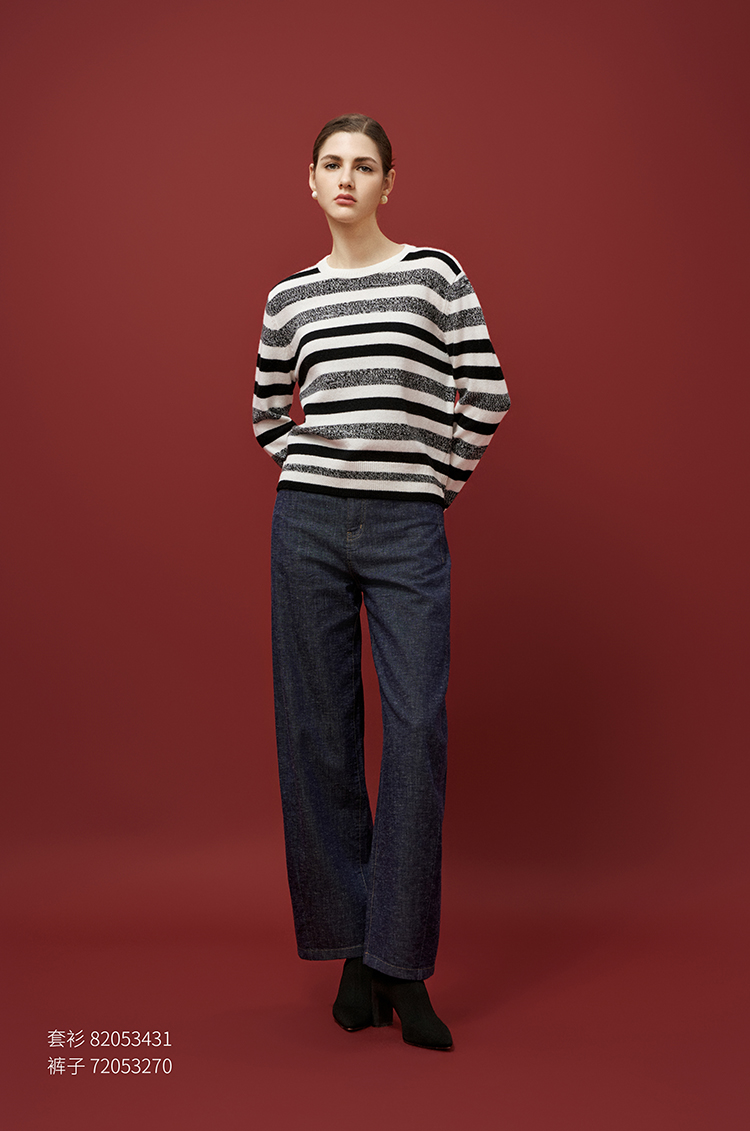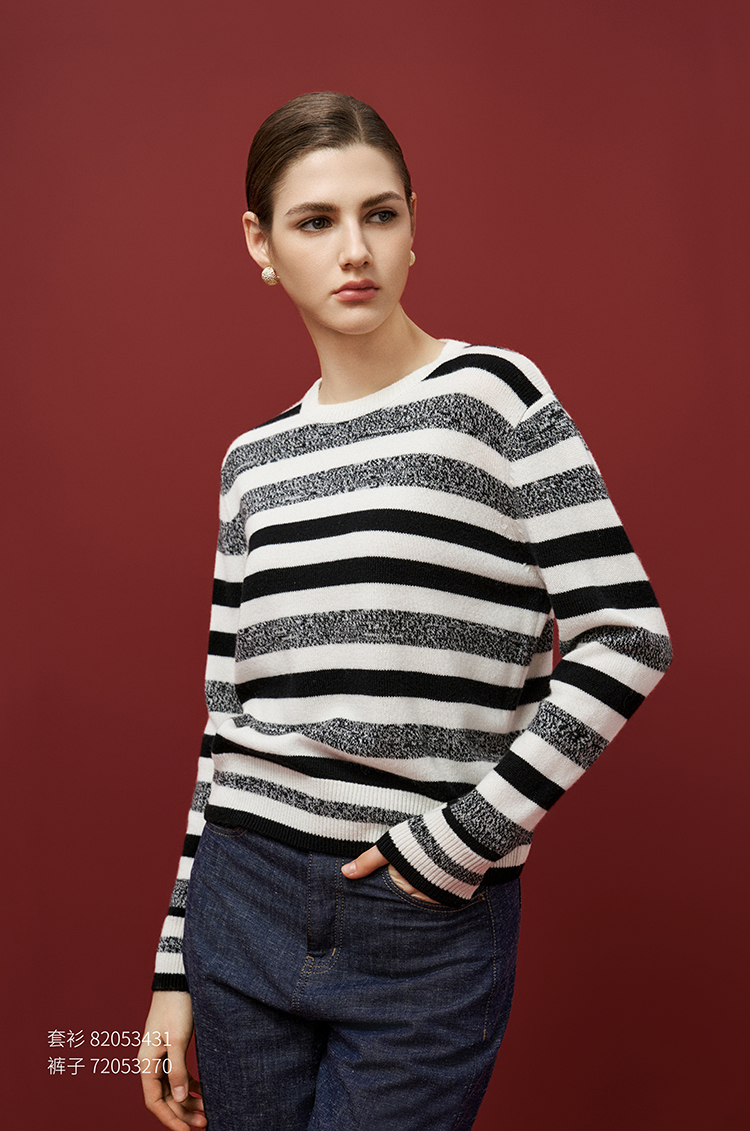 【条纹羊绒套衫】羊绒世家秋冬新品女士100%山羊绒圆领套衫舒适保暖毛衣