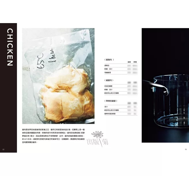 本書詳細列出各種肉類的部位、重量、不同口感,例如:一分熟~三分熟;軟嫩、多汁;軟到可以用叉子撕開;具纖維感…等,以及與其相對應的加熱溫度和時間,分為: