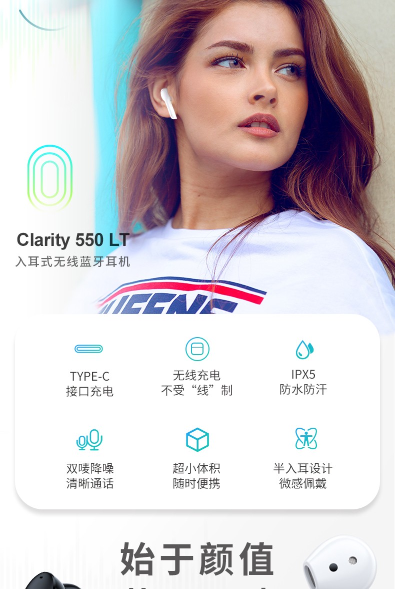 魔声Clarity 550LT无线蓝牙耳机智能入耳侦测跑步运动游戏通话快充耳机支持无线充电轻盈小巧黑色