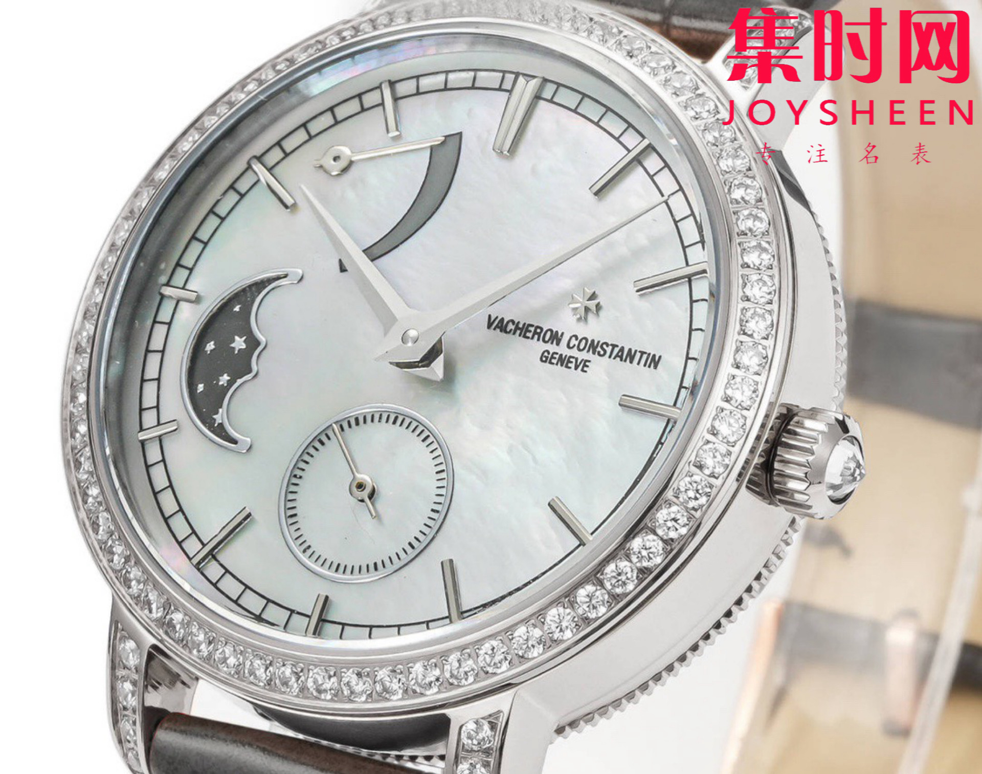 白色珍珠贝母表盘之上配备了高级腕表所有复杂功能当中诗意的月相盈亏显示功能。