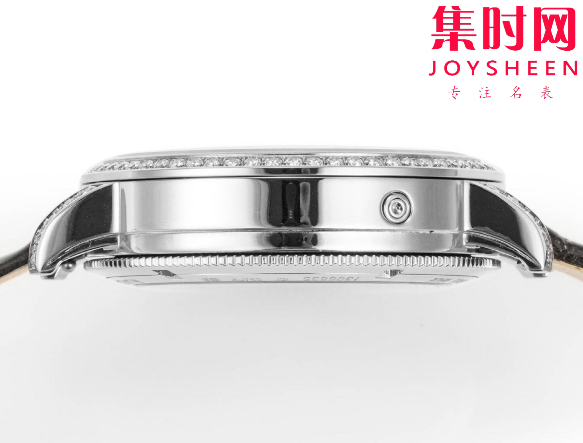 圆形白金表壳,表圈、表耳和表冠镶嵌了总重约1.2克拉的81颗美钻
