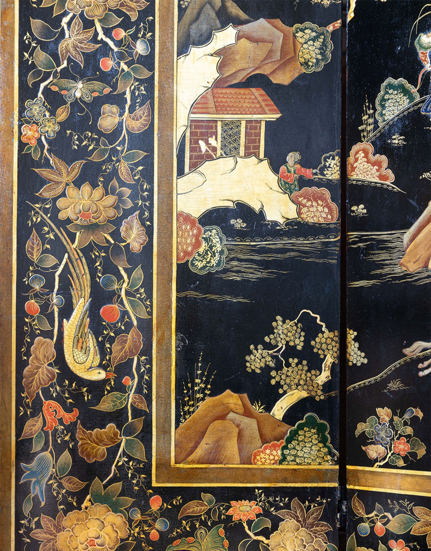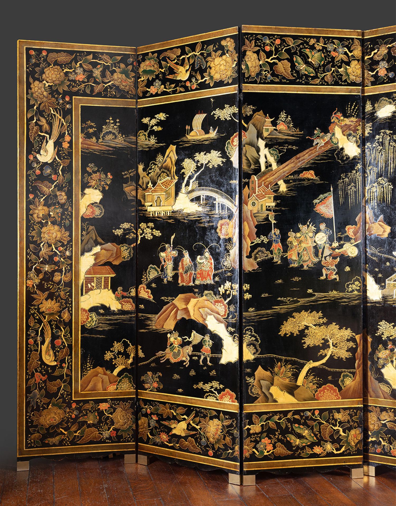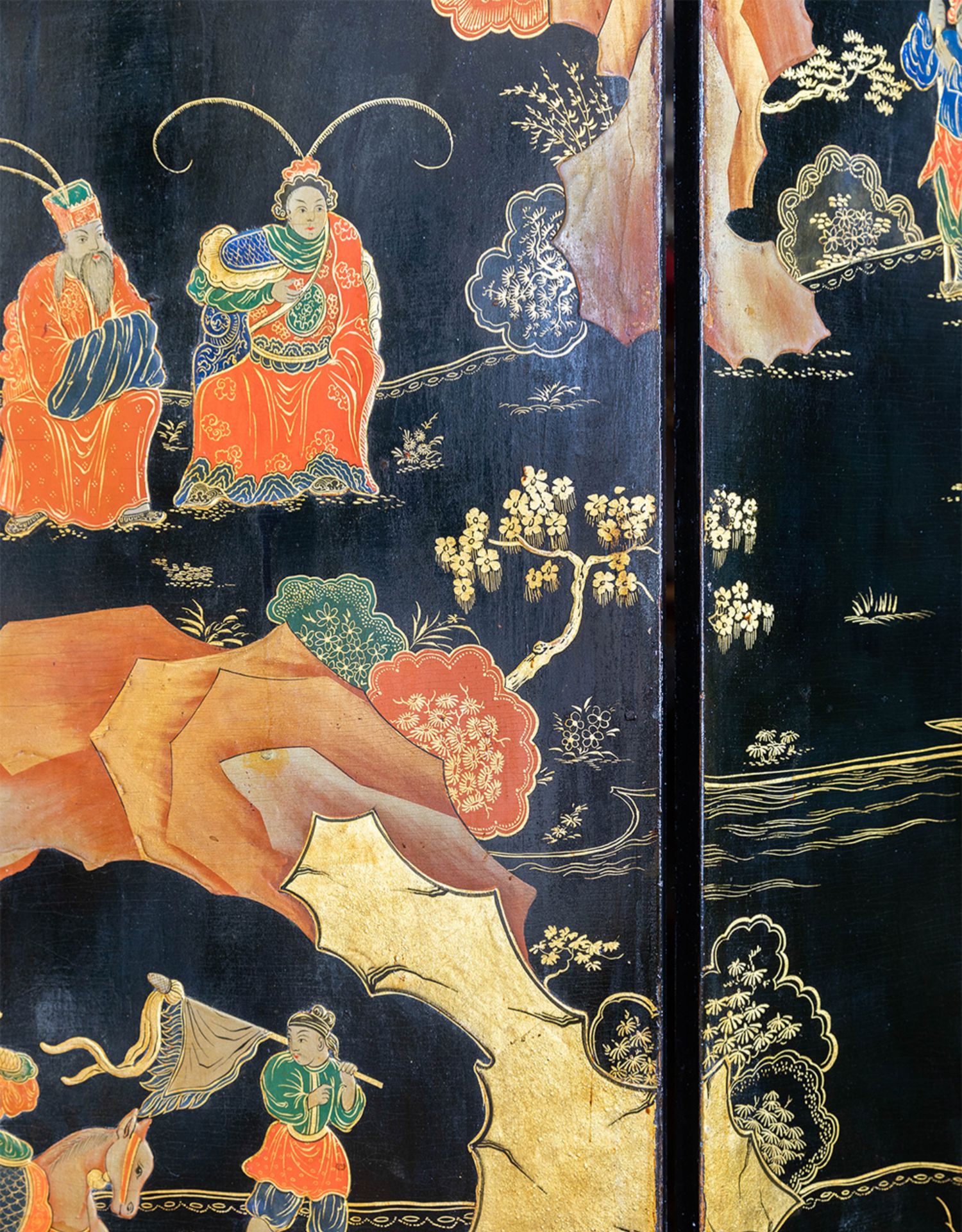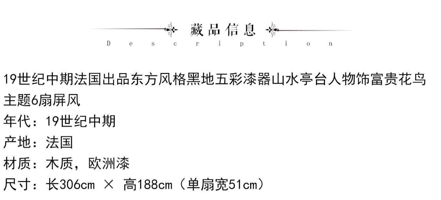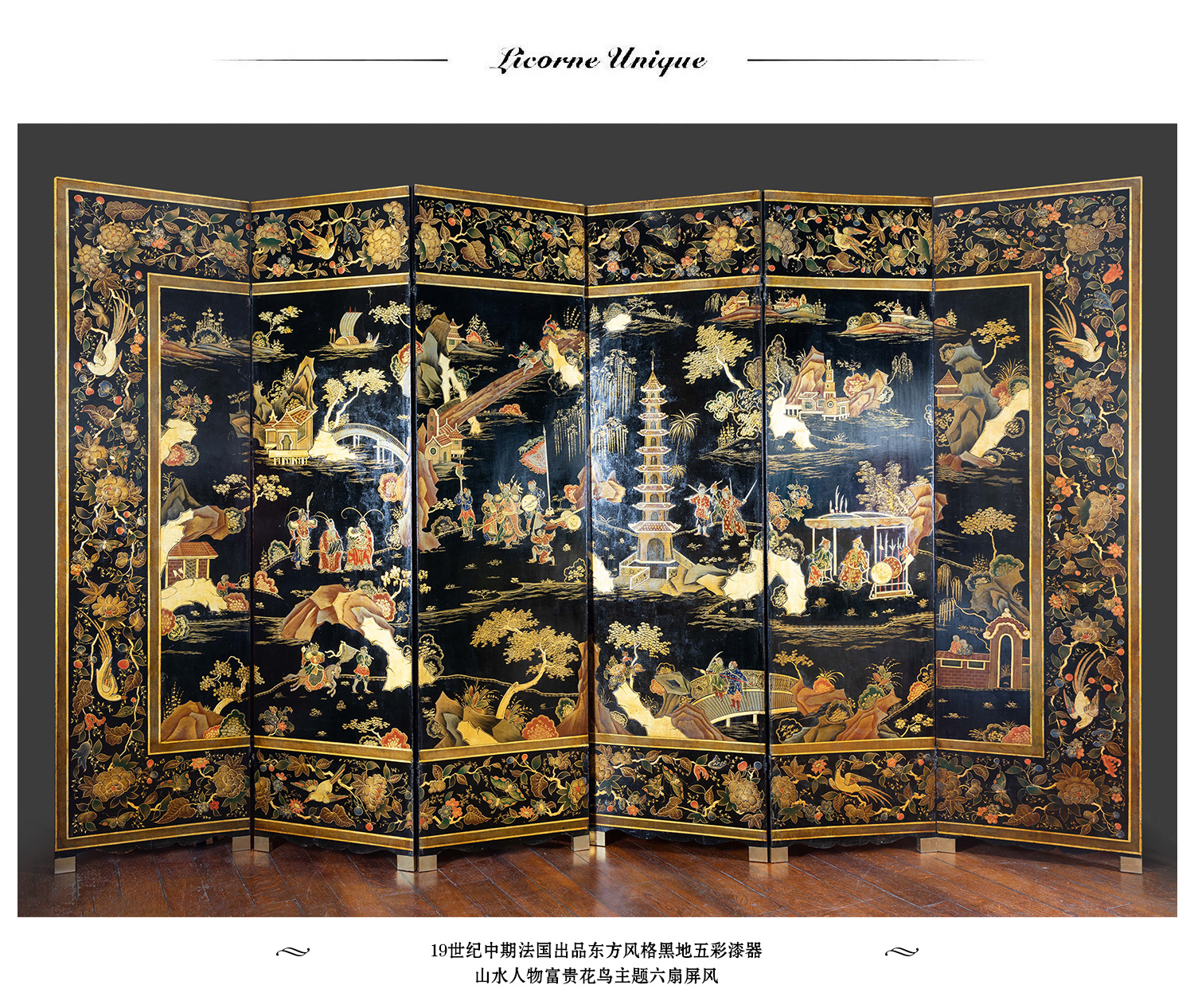 独角鹿西洋古董法国东方风格黑地五彩漆器山水亭台人物六扇屏风