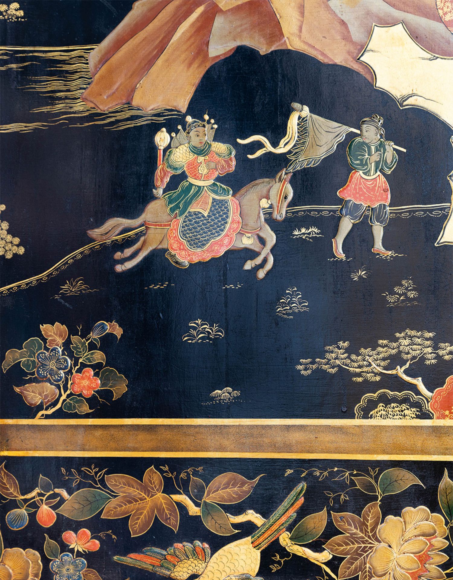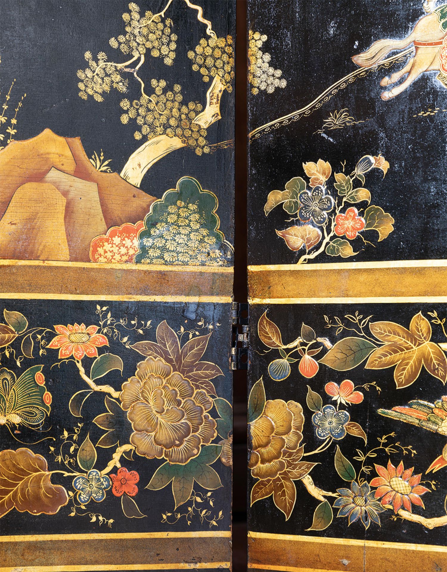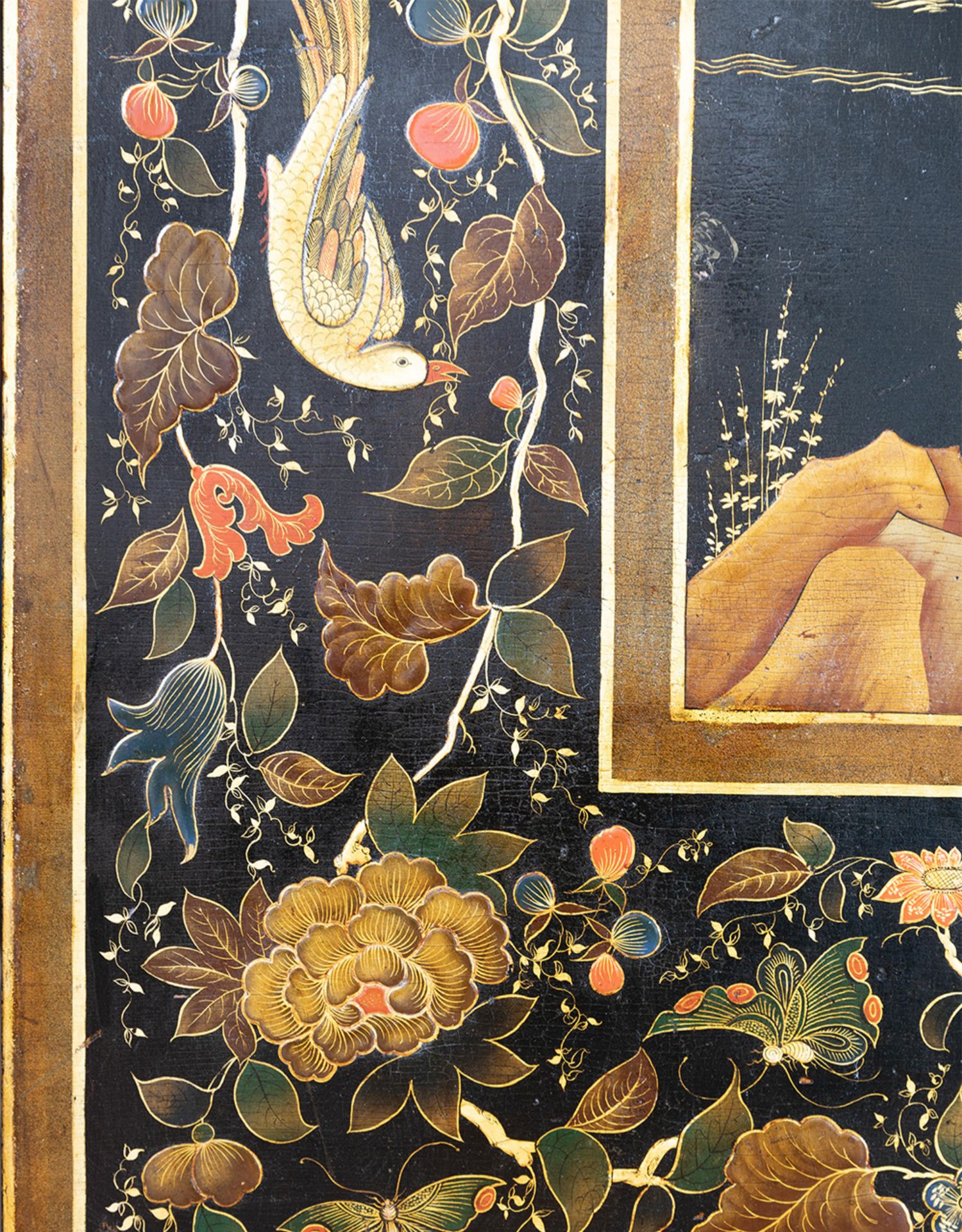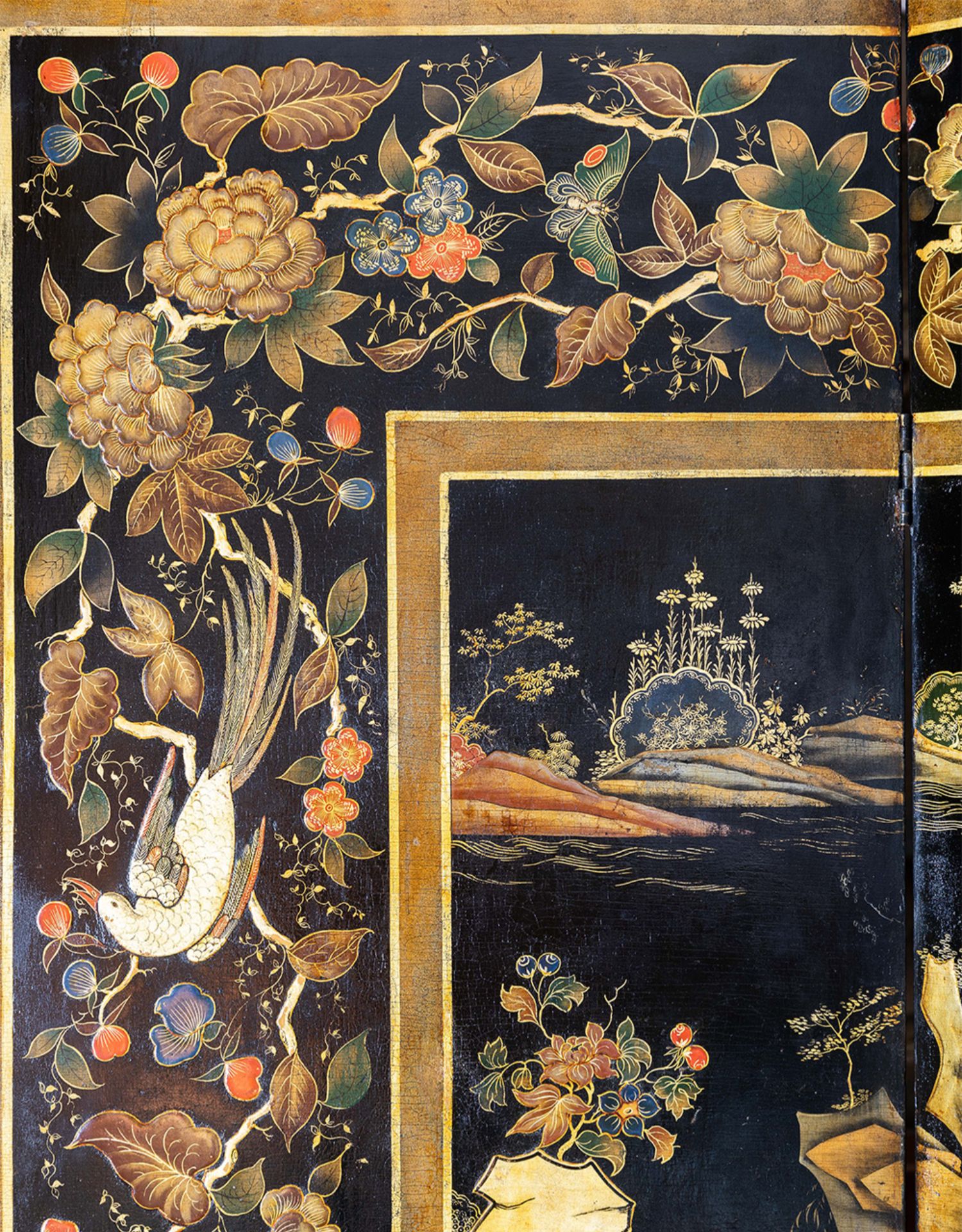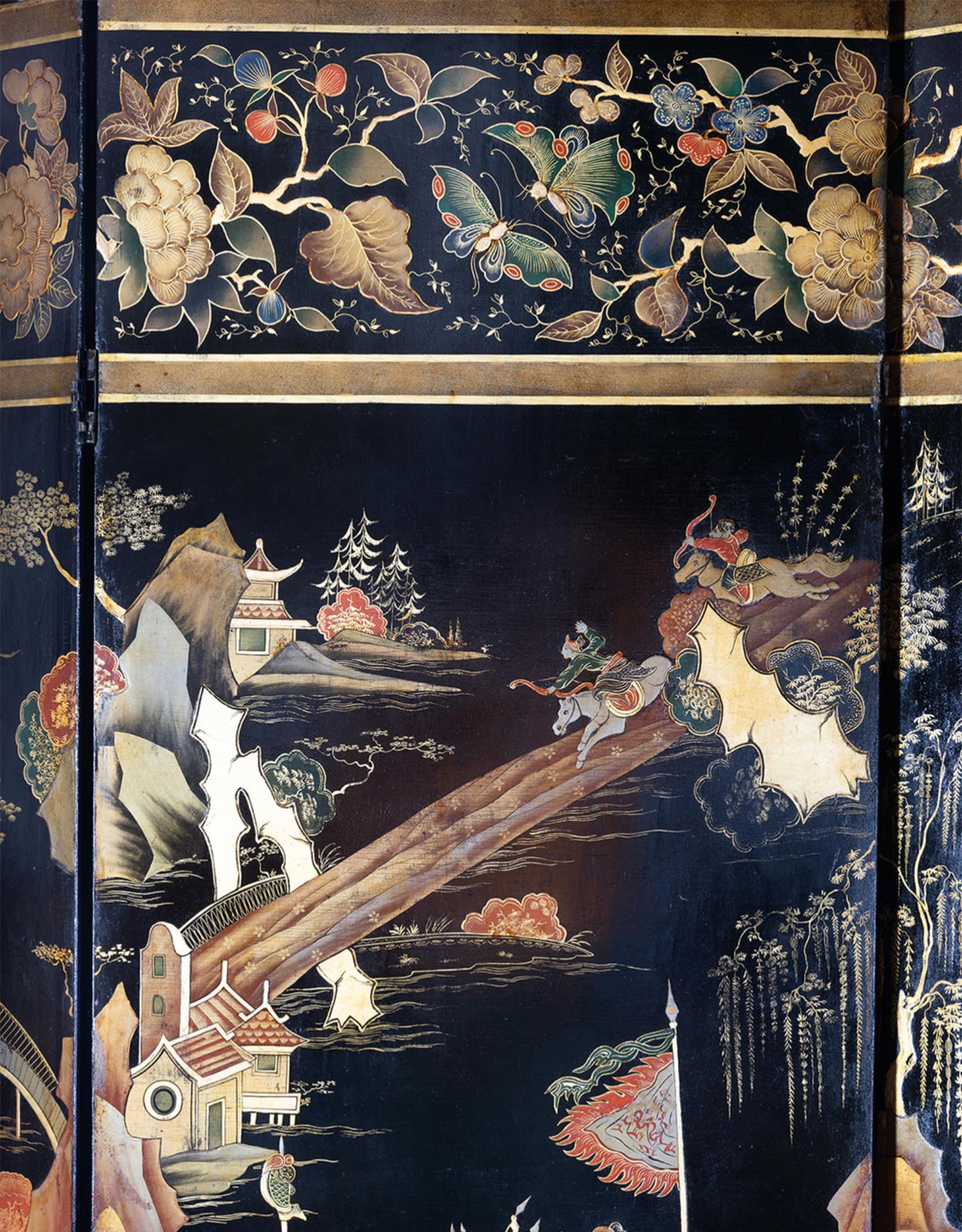独角鹿西洋古董法国东方风格黑地五彩漆器山水亭台人物六扇屏风