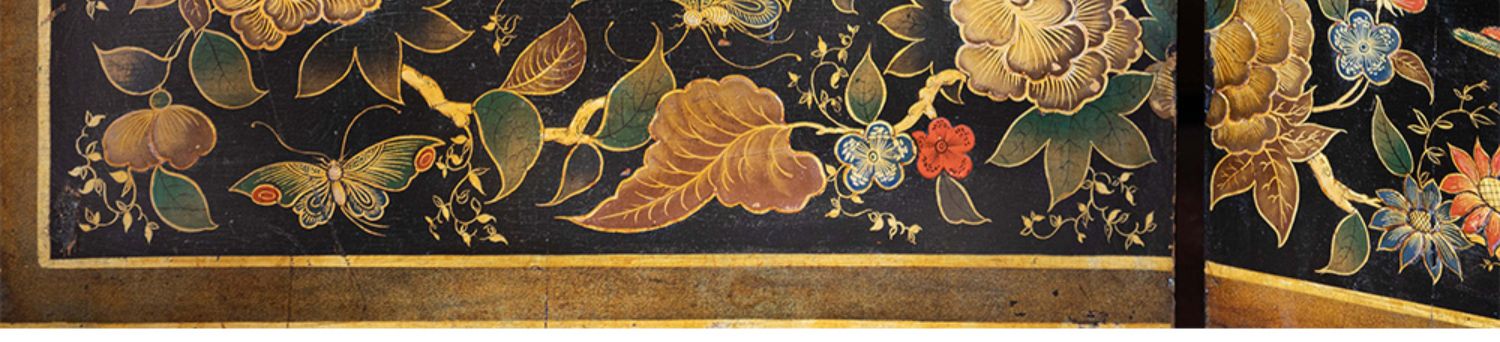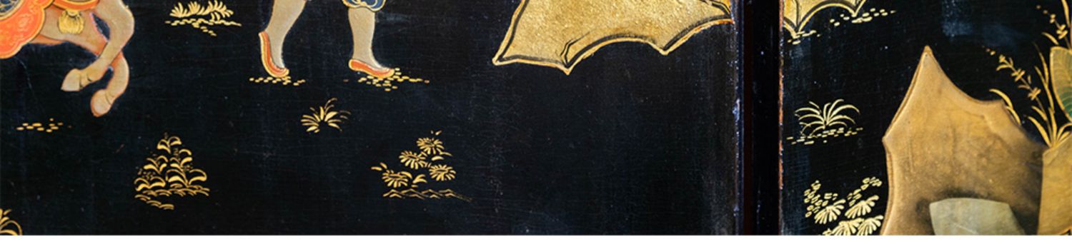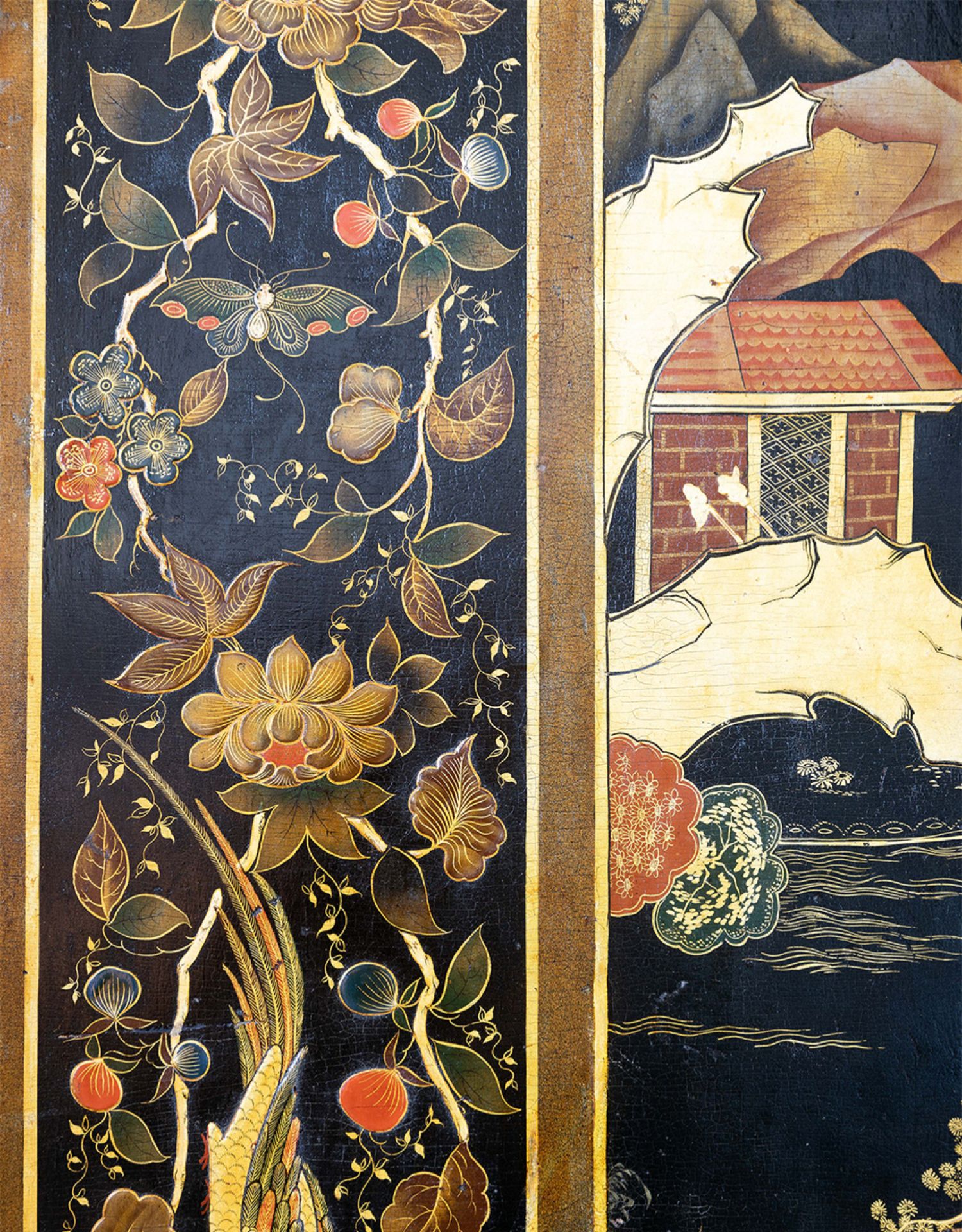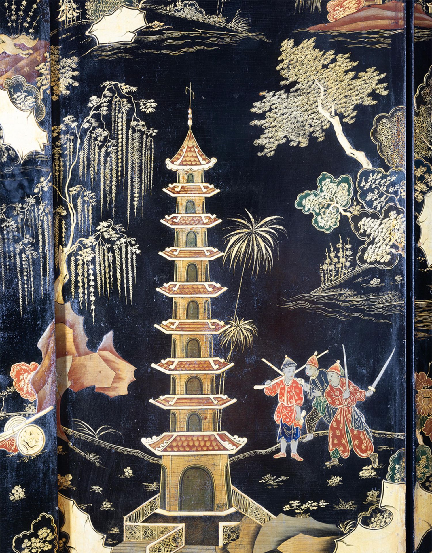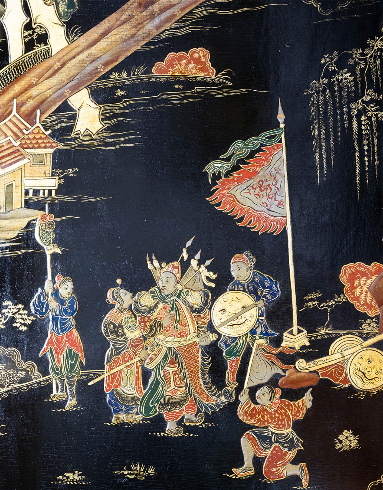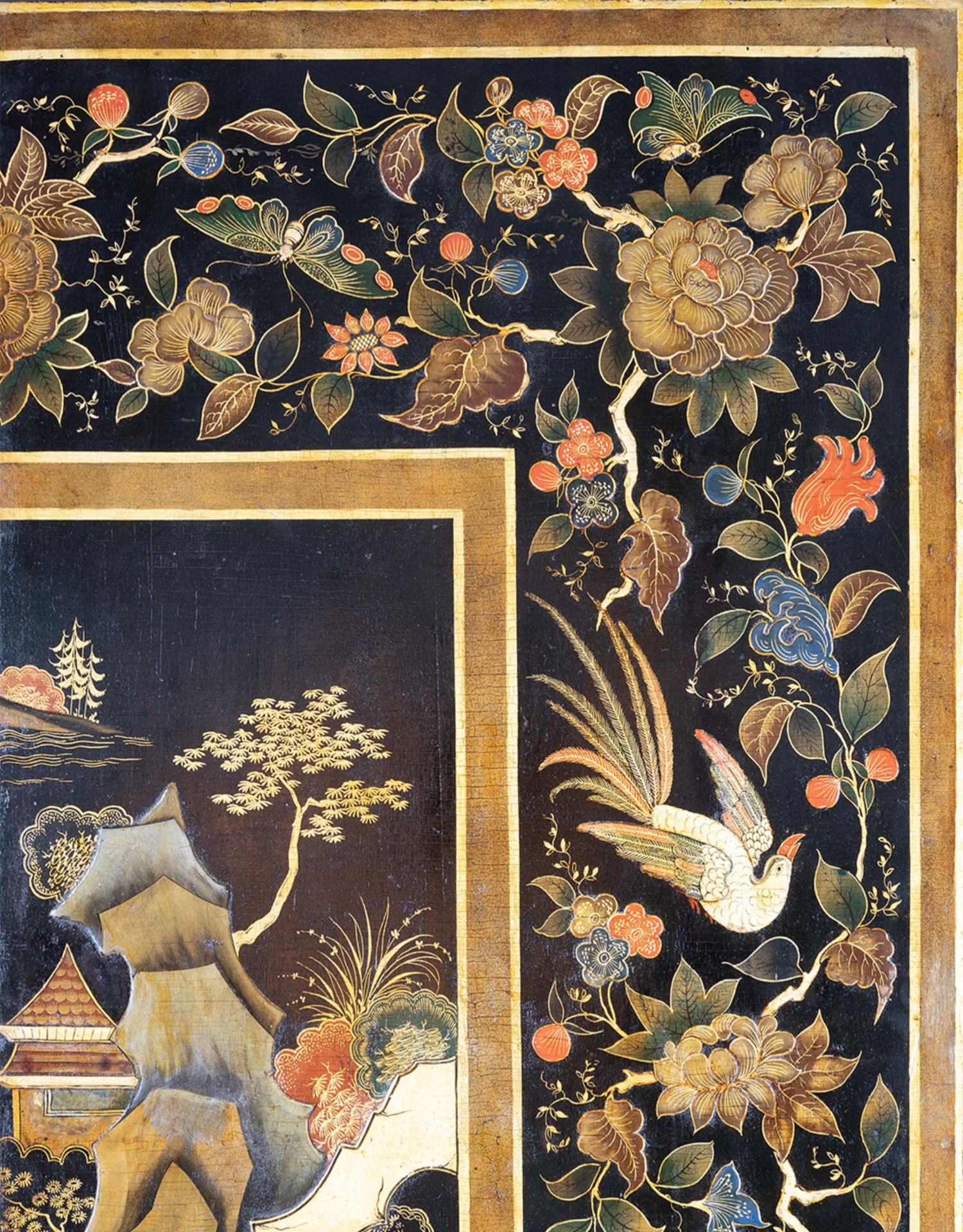 独角鹿西洋古董法国东方风格黑地五彩漆器山水亭台人物六扇屏风