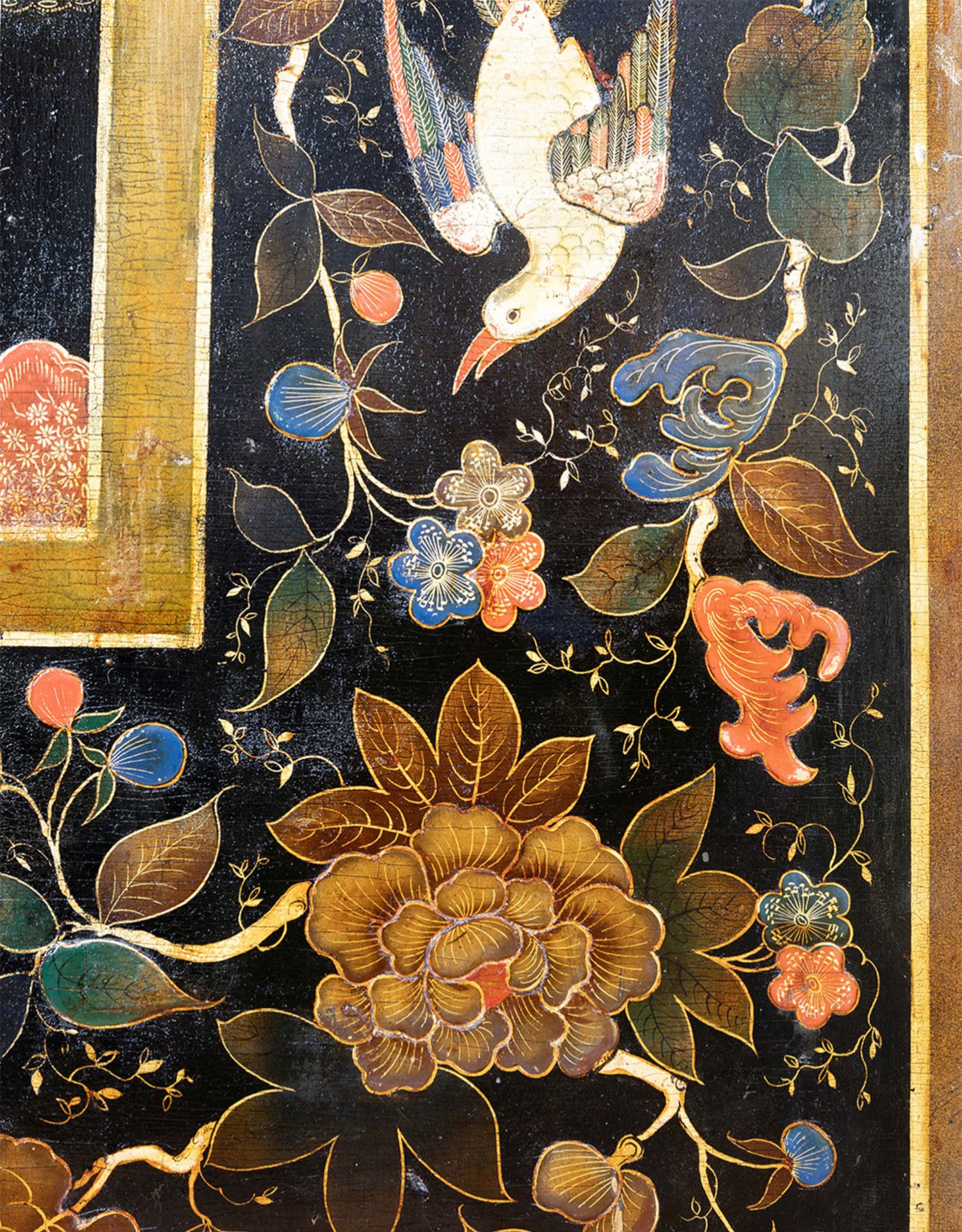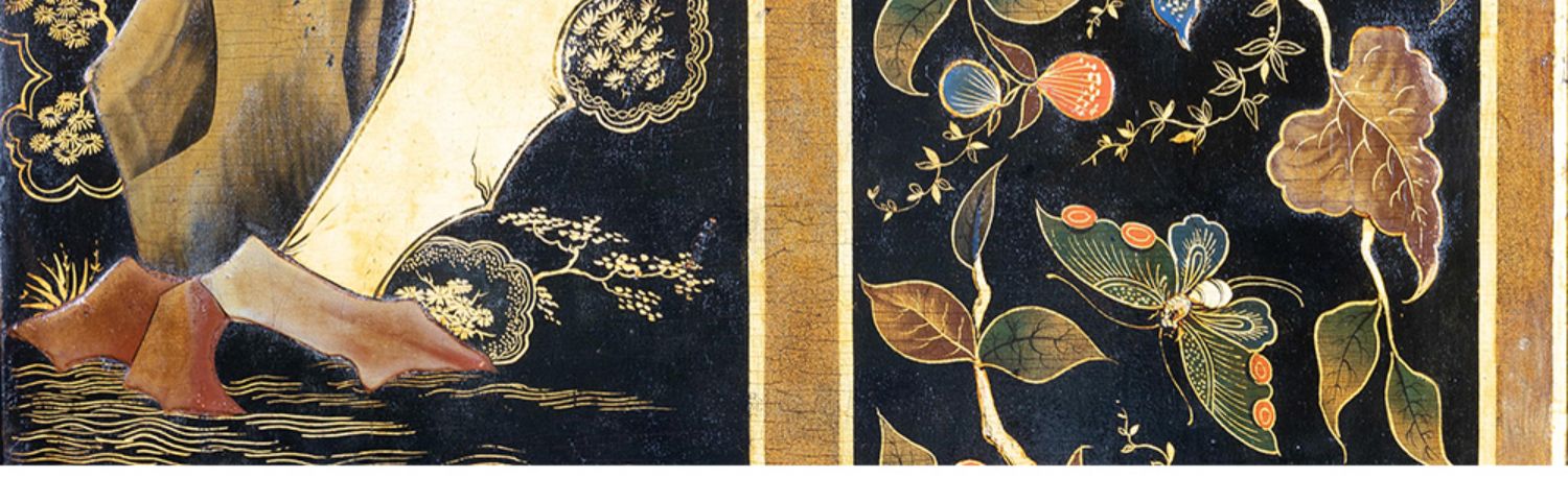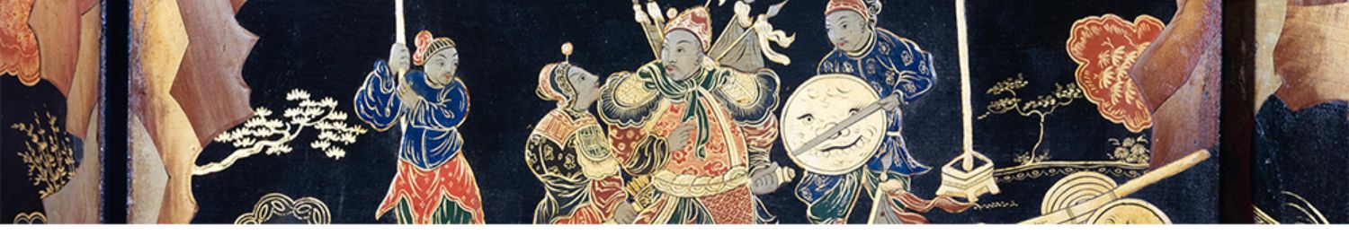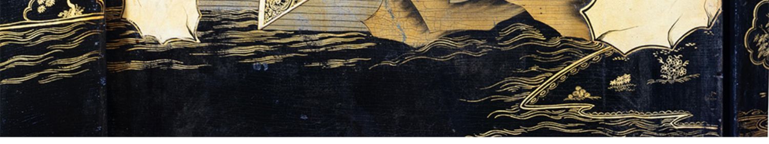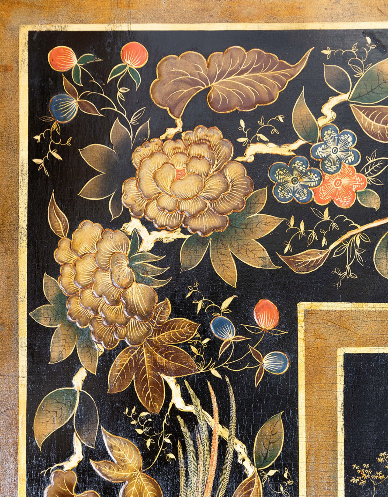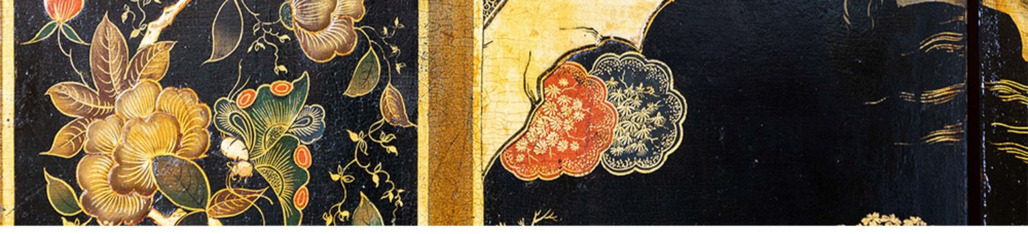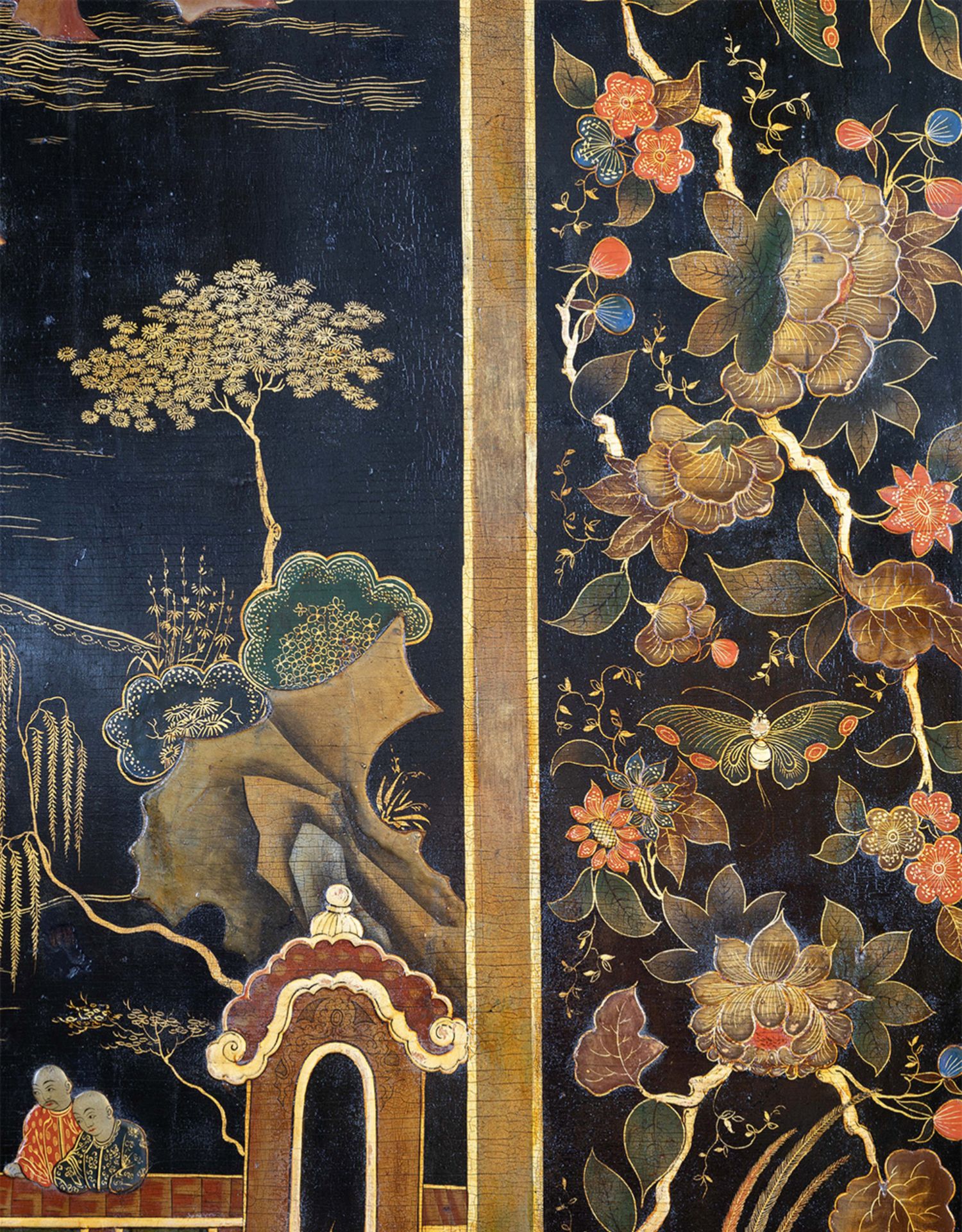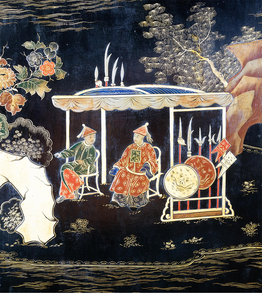 独角鹿西洋古董法国东方风格黑地五彩漆器山水亭台人物六扇屏风