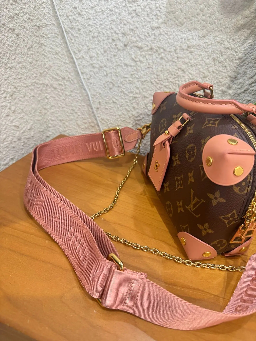 【商品详情】正品二手 LV Souple 粉皮拼老花 粉肩带 软盒子🗃️98新 20*14 配件:肩带 链条。粉粉嫩嫩少女心