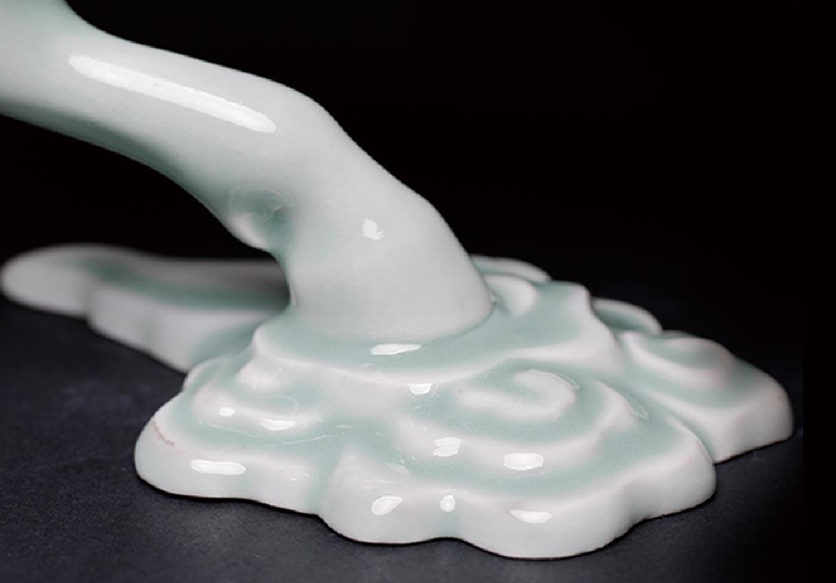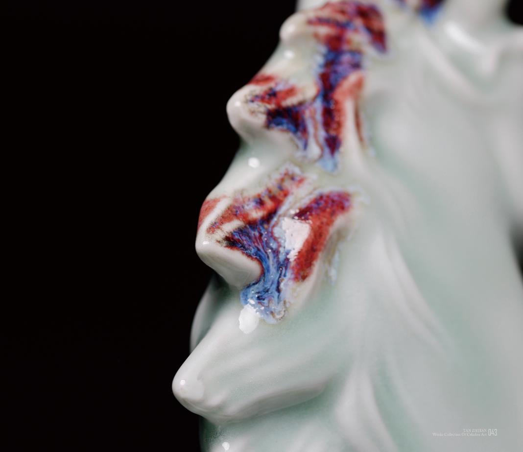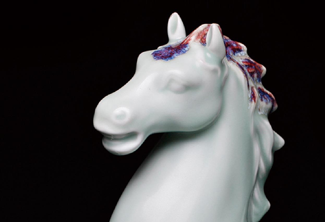 此器脱胎于汉代知名青铜器马踏祥云,马头细致生动,躯体起伏表现出马的肥硕和健壮,形象矫健俊美,别具风姿,昂首嘶鸣,躯干壮实而四肢修长,脚蹄轻捷,三足腾空,飞驰镶嵌,一足踏青云,而瓷器有别于青铜器的铸造技艺,踏云造型烧制难度更是几倍于浇筑的青铜件,但瓷器的温润淡雅更添加了此器出尘的气质,是浪漫主义精神和高超技术技巧的结晶。