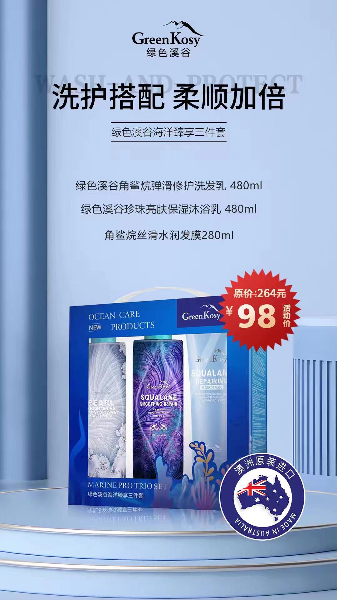 绿色溪谷角鲨烷洗护三件 小 套组 角鲨烷弹滑修护洗发乳480ml+珍珠亮肤保湿沐浴乳480ml+角鲨烷滋养修护发膜280ml