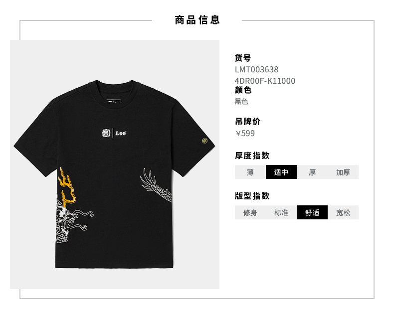 Lee宫廷文化“龙随型动”潮服22秋冬新品舒适男短袖T恤LMT0036384DR00F97W000