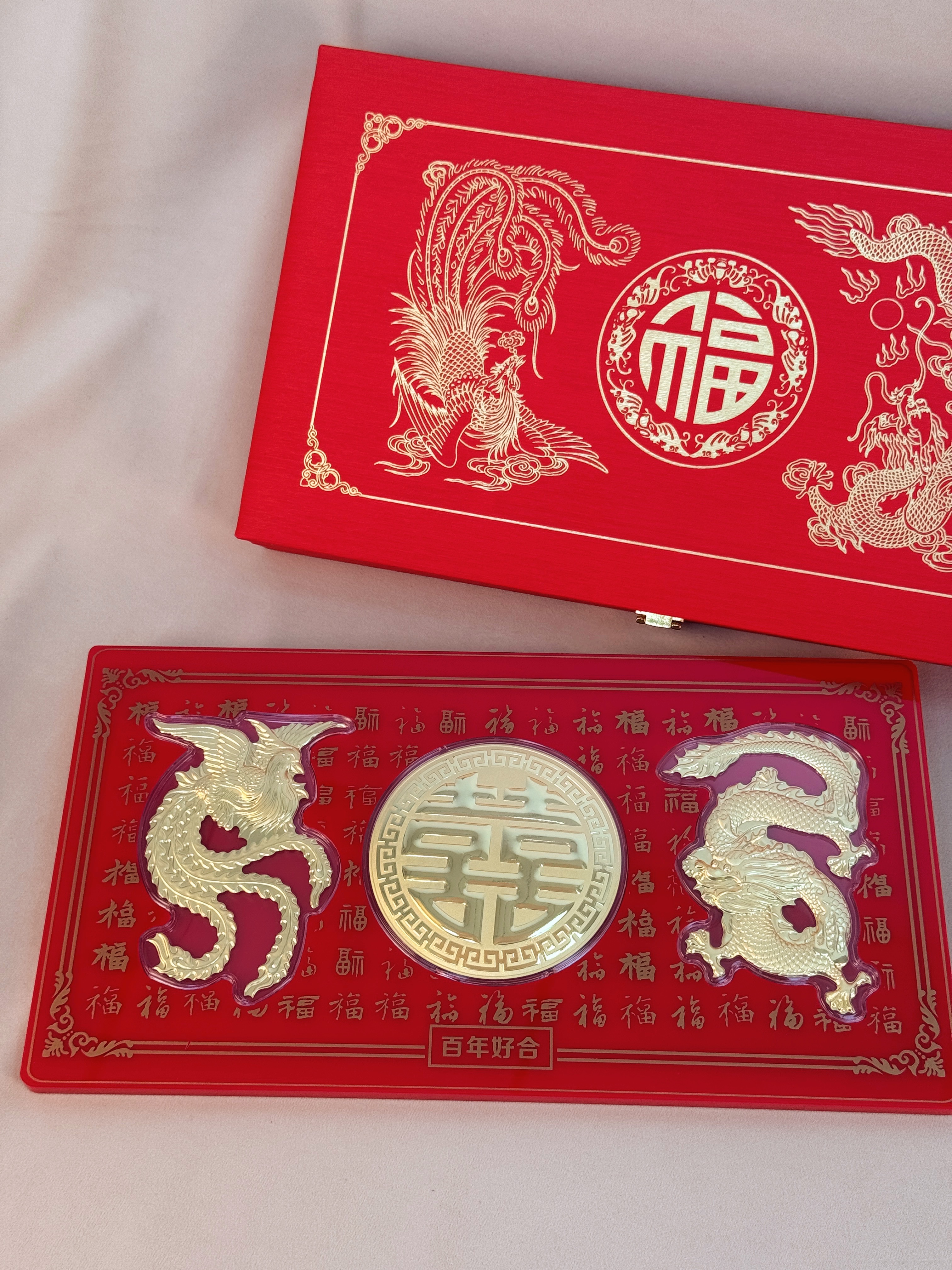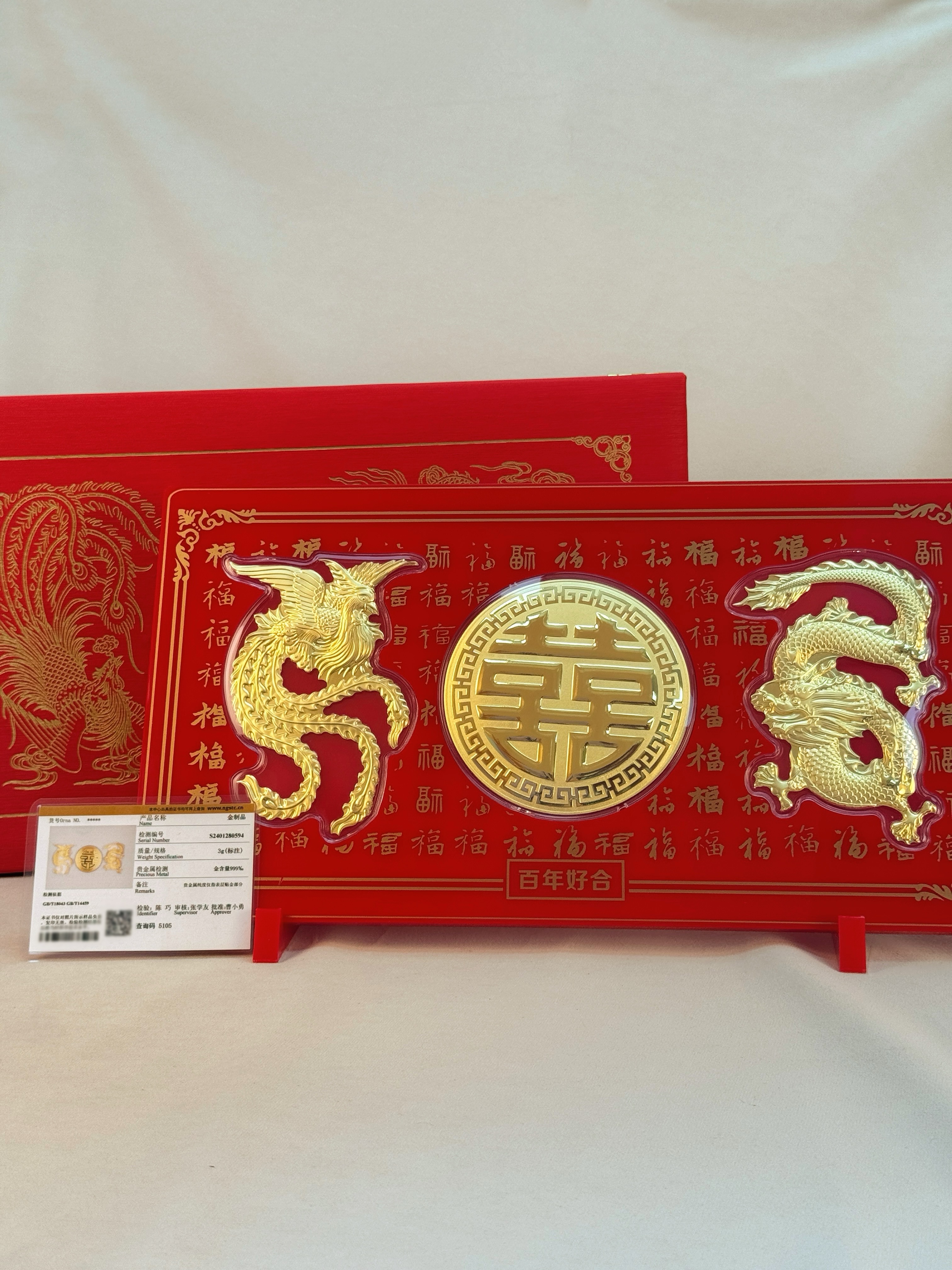 【现货】足金999龙凤双喜百福礼盒婚庆陪嫁嫁妆订婚百年好合摆件礼盒【金重约3g】【一物一证书】