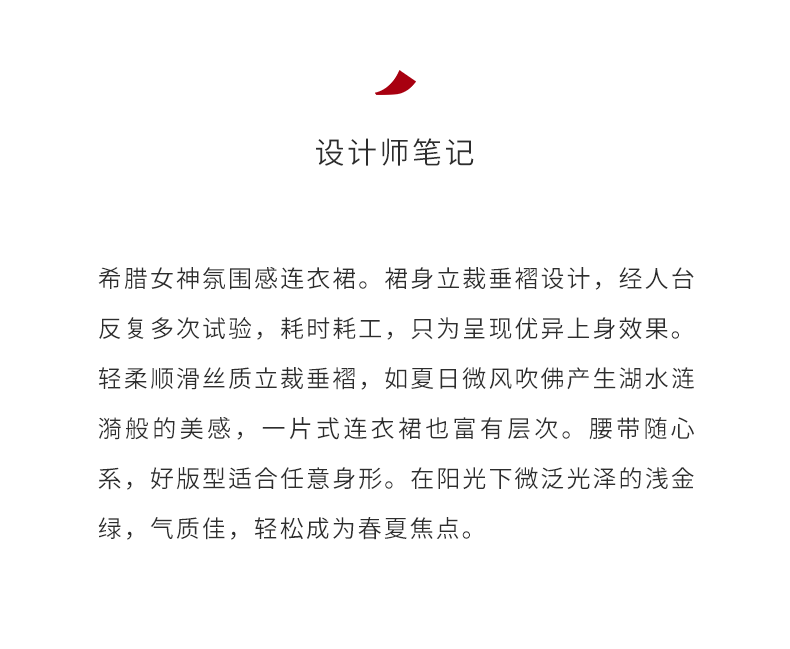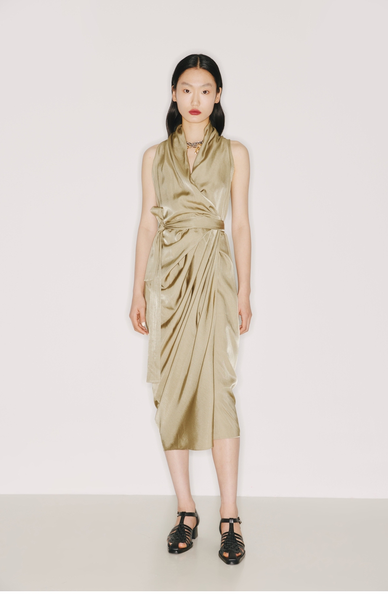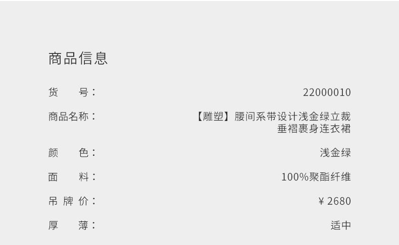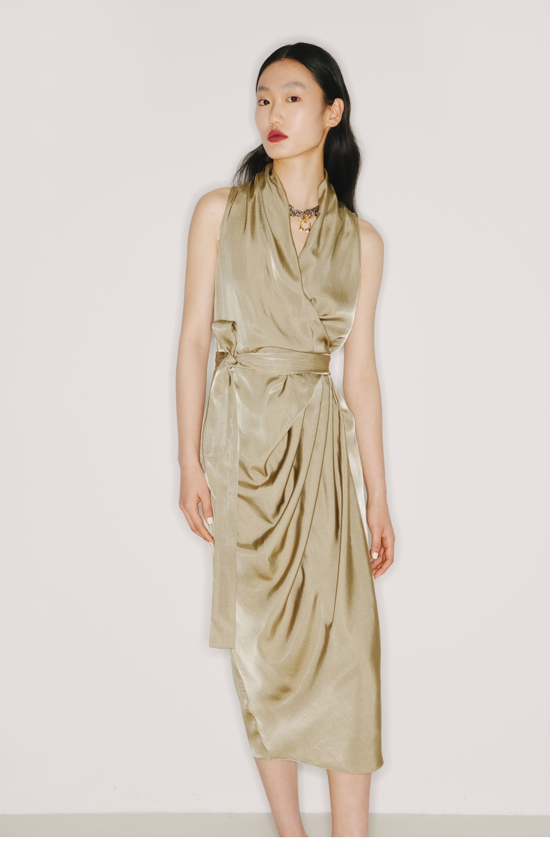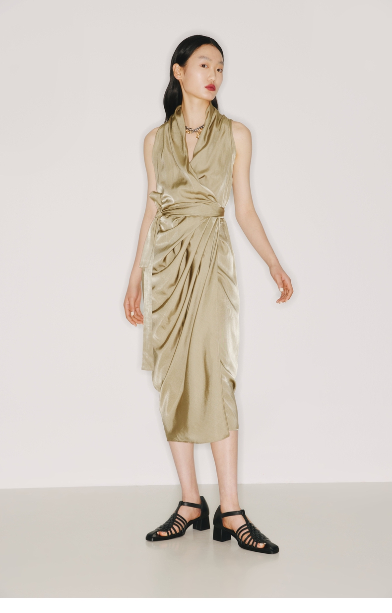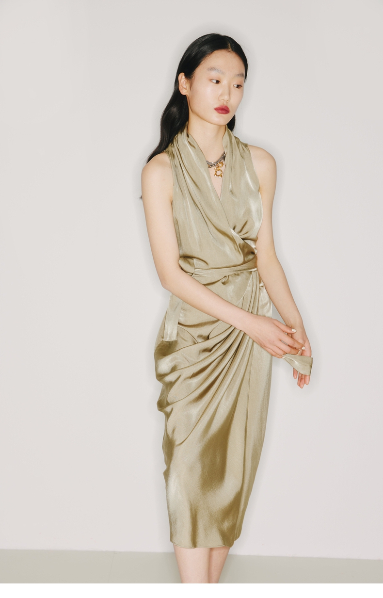 【雕塑】腰间系带设计浅金绿立裁垂褶裹身连衣裙/22000010