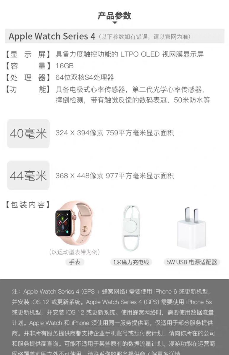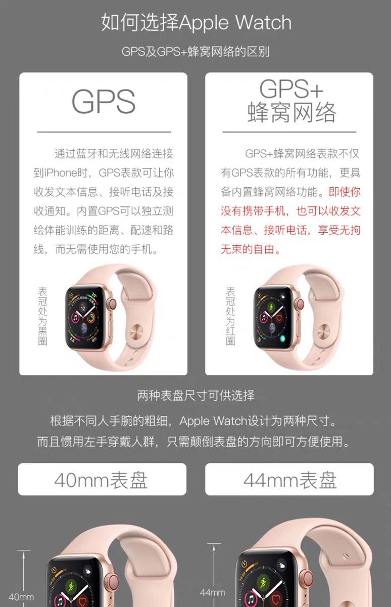 有40cm和44cm ,尺寸上主要看人体重。 大多数男士选择44cm 。颜色主要热卖是三种,黑色 ,粉色, 白色 。还有其他银色➕海贝色,不锈钢表带等,有需要的联系下客服问价。4代版本有,基本款GPS和蜂窝➕GPS两种,看个人需求。如果你是带款式,小编认为基本款GPS够了。