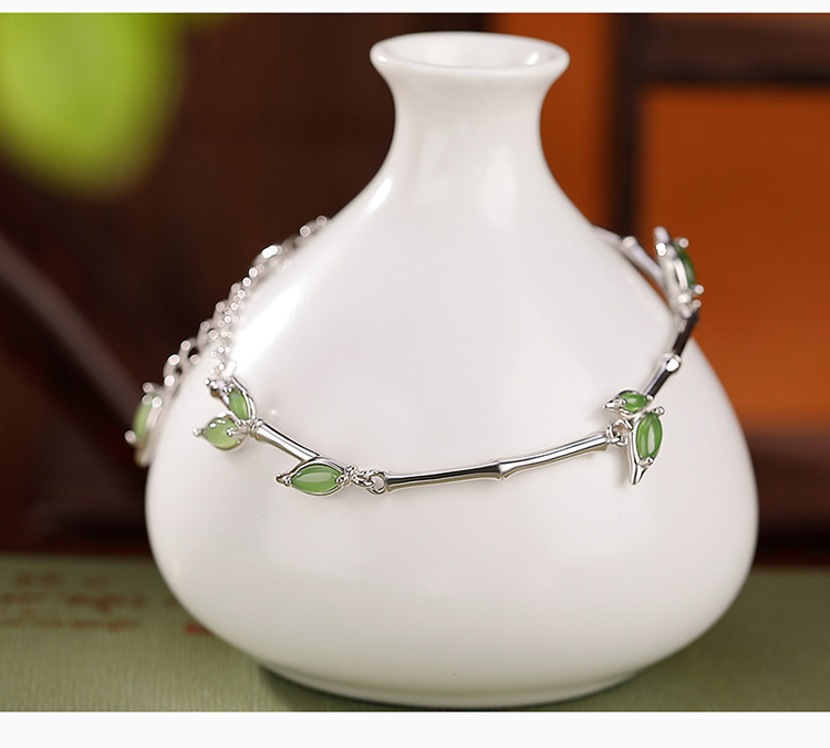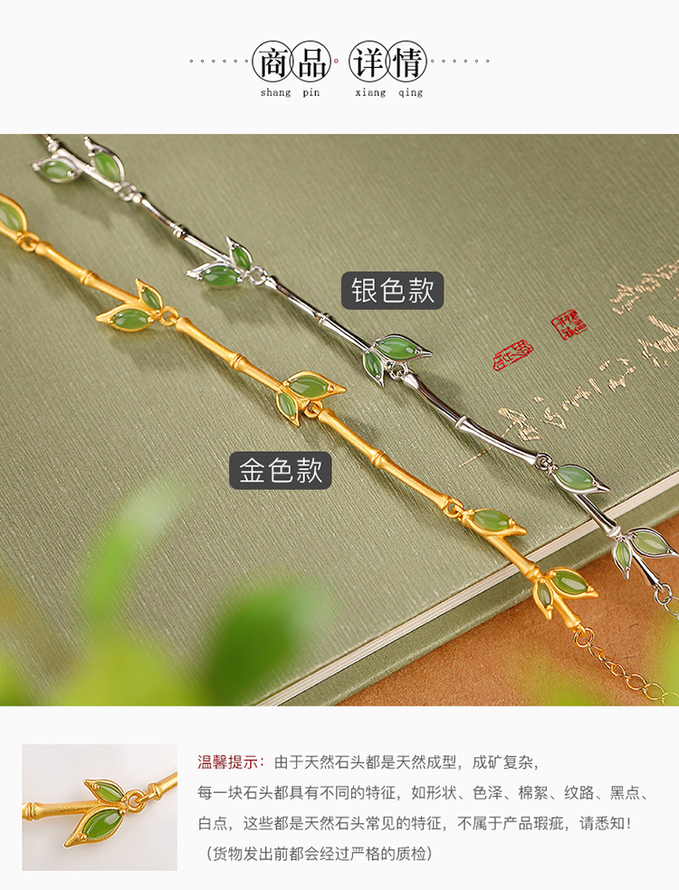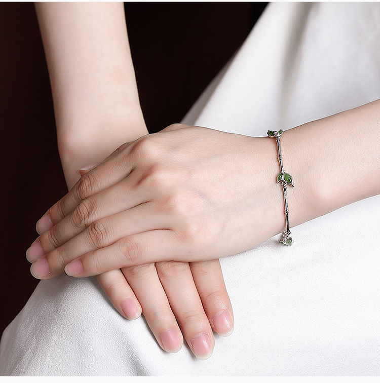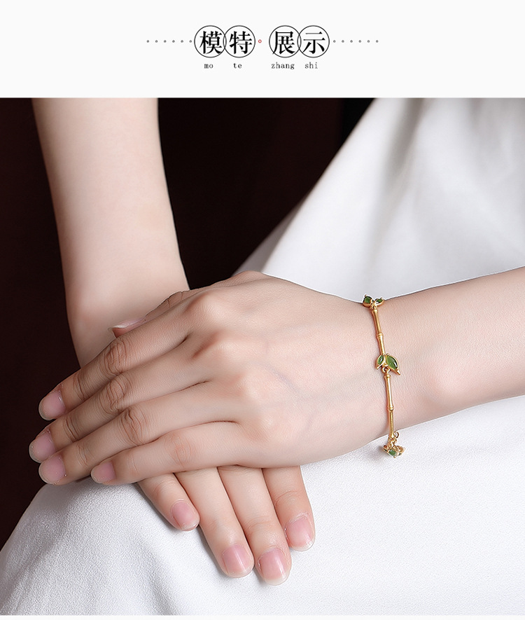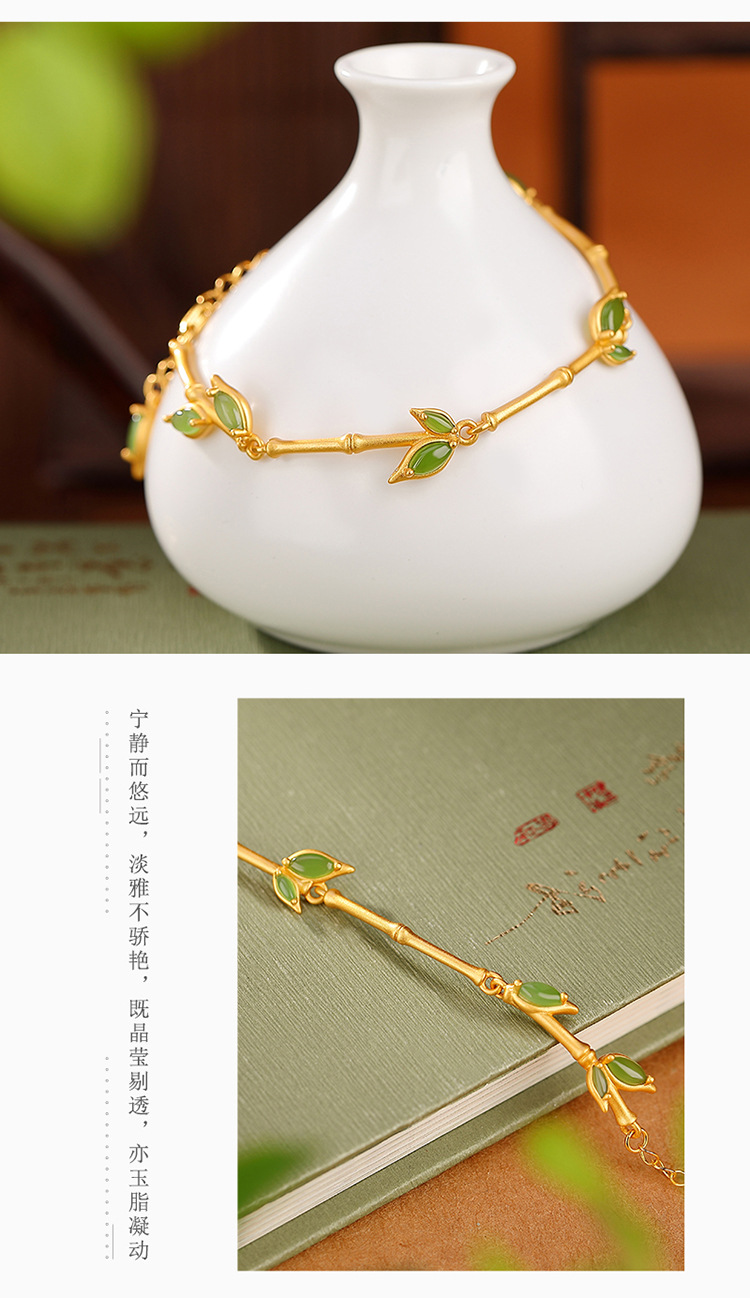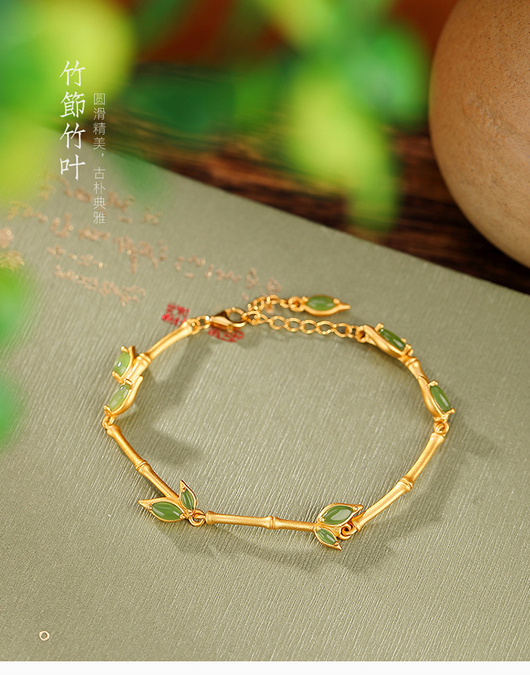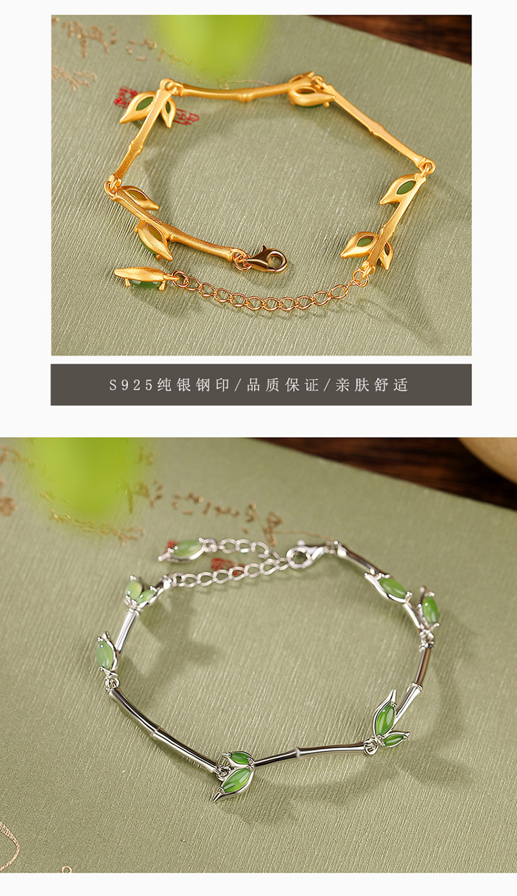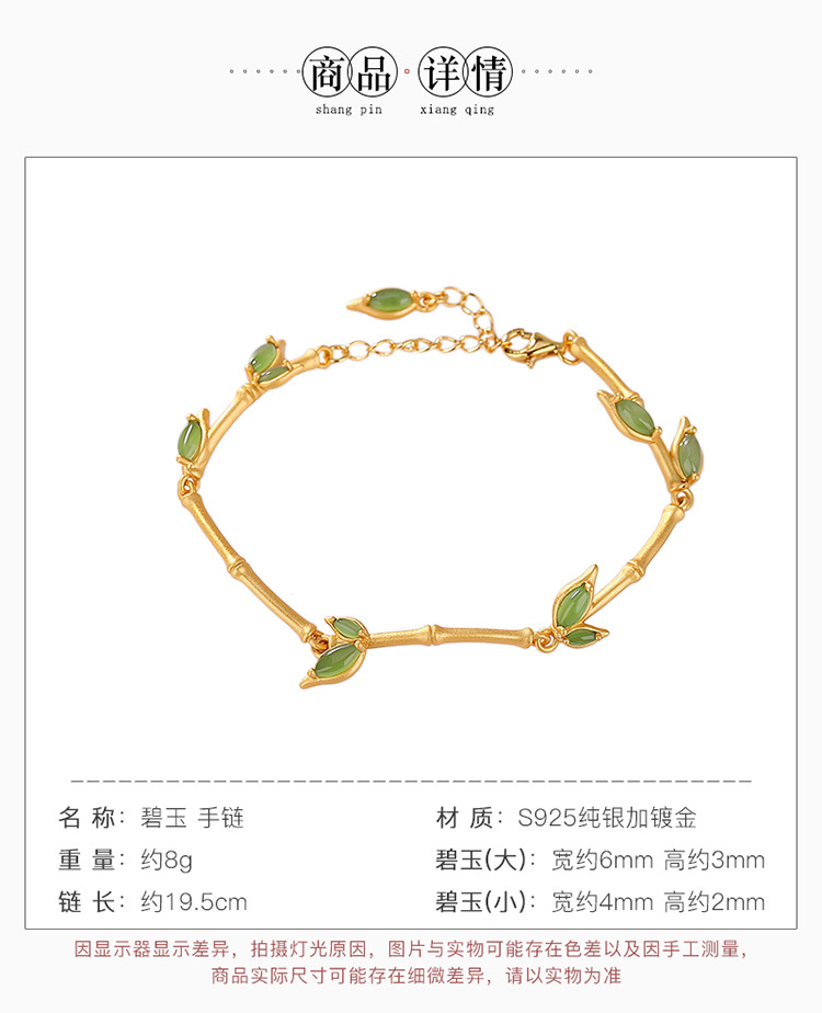 S925纯银镀金和田玉碧玉,竹节竹叶手链百搭古风气质手环CW-266