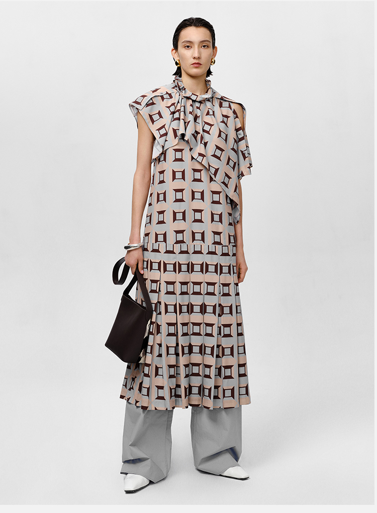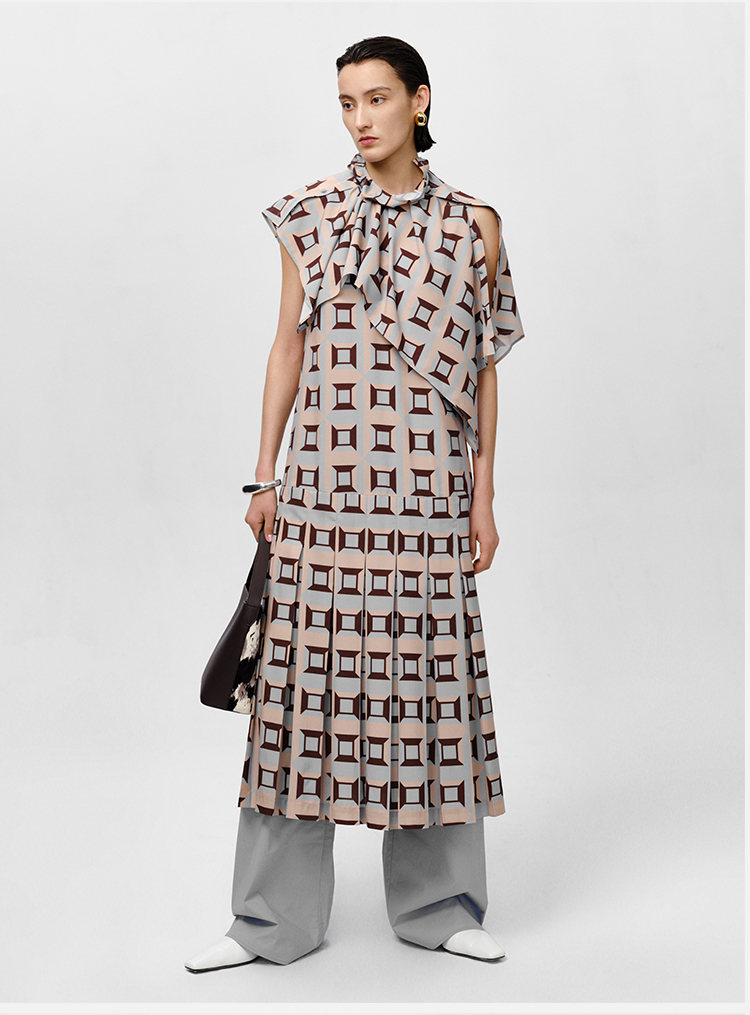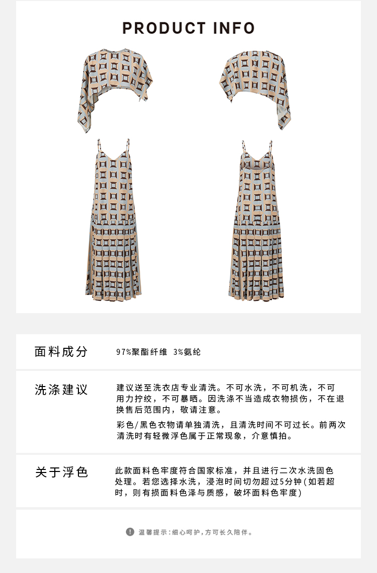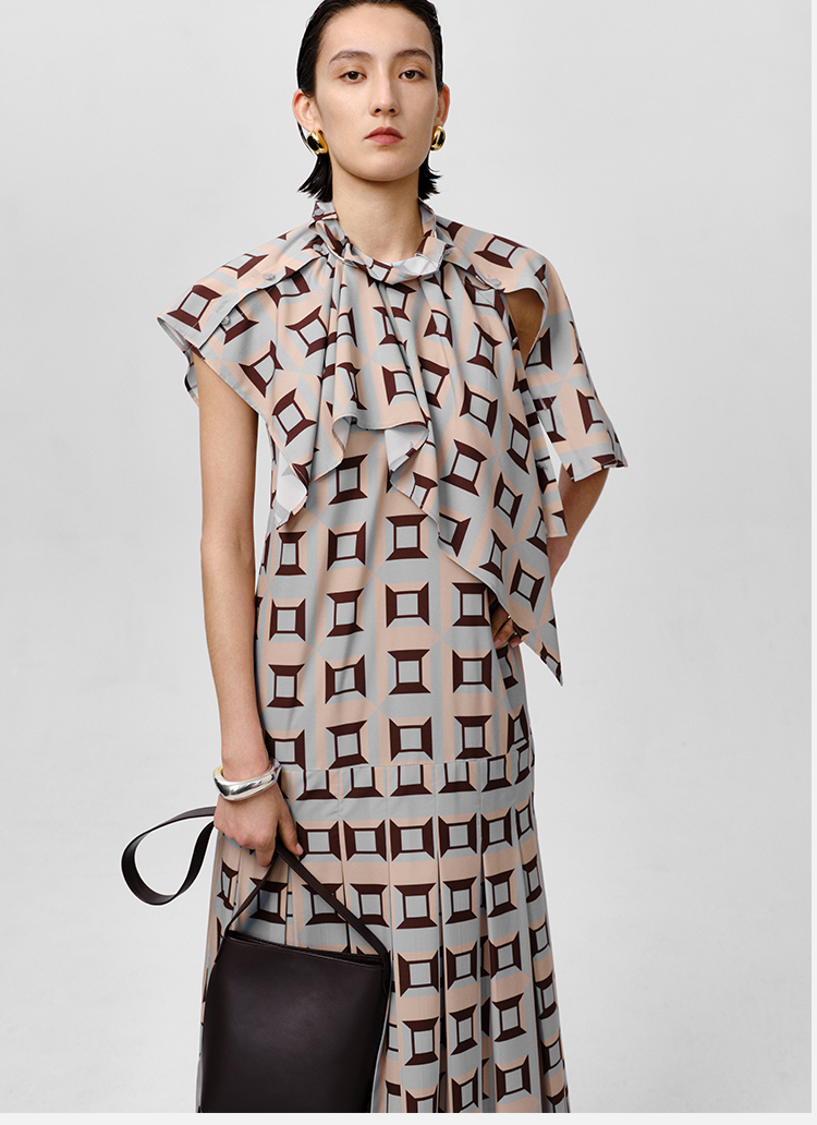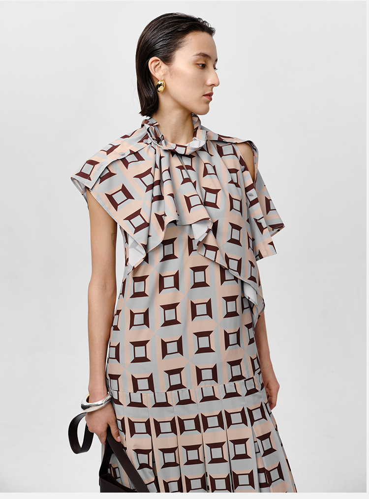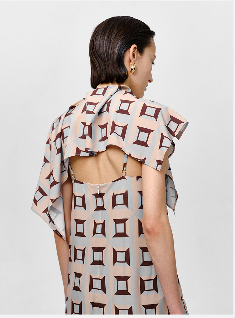 HIDEMI “我们做印花”经典几何设计感廓形印花缎面分体可拆卸斗篷式连衣裙 黄蓝