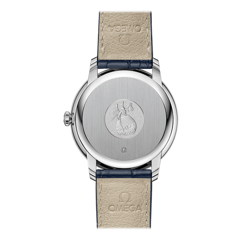镜面材质 | 蓝宝石水晶玻璃 | 表盘 | 精钢表壳 经蓝色PVD处理的太阳光芒射线表盘,环绕“轨道式”分钟圈。腕表的6点位置设有日历窗,欧米茄品牌标识、间隔出现的罗马数字与弧面形小时刻度,以及指针均采用镀红色18K金制成。 密底 |
