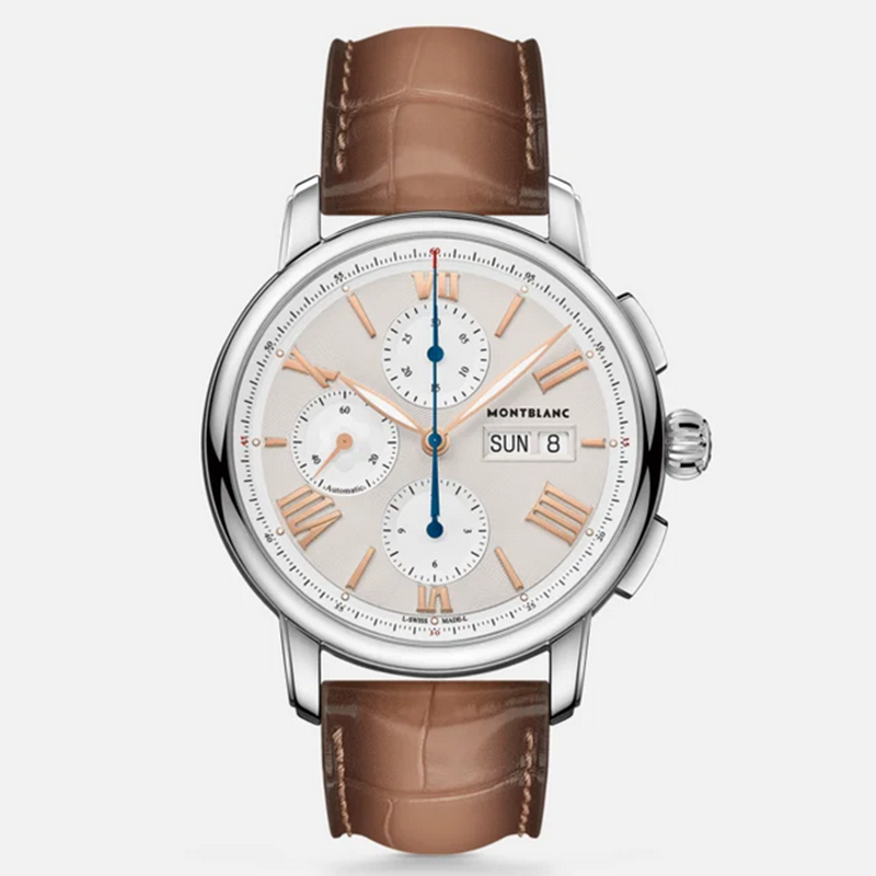 镜面 材质 | 穹形蓝宝石水晶玻璃表镜,防反射涂层 | 表盘 | 精钢表壳 象牙色熊猫表盘搭配银白色计时盘和外缘,饰有放射状万宝龙六角白星玑镂雕刻图案,镀18K玫瑰金夜光柳叶形时针、分针,镀18K玫瑰金夜光小秒针,蓝钢计时指针 日期星期显示 计时 精钢表冠,浮雕万宝龙六角白星标识 |