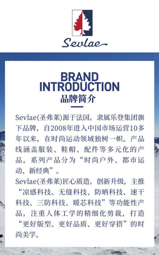 Sevlae(圣弗莱) 品牌源于法国,自2008年进入中国市场运营10多年以来,在时尚运动领域独树一帜。产品线涵盖服装、鞋帽、配件等多元化的产品,产品分为“都市轻户外、都市轻运动、经典传承”三大系列;其中都市轻户外精心打造“都市假日、商务旅游”两个产品主题,都市轻运动精耕“高尔夫、跑步运动”产品主题;经典传承主力打造“时尚校园与联名系列”两个产品主题 产品研发上不断持续迭代升级, Sevlae(圣弗莱) 品牌推出“冰感科技、防晒科技、无缝科技、抗菌速干科技、石墨烯+90绒暖芯科技”等功能性产品,注重人体工学的精细化剪裁,尽显都市轻运动、都市轻户外及商务典雅的穿衣美学 Sevlae(圣弗莱) 研发的系列产品深受广大时尚运动爱好者的喜爱,并先后荣膺中国登山协会、中国路虎俱乐部战略合作伙伴,2012年签约中国国家登山队队长王勇峰为品牌代言人,2019年诚邀盛一伦出任圣弗莱品牌明星代言人。并获评为全球最具投资潜力泛户外品牌、中国年度体育品牌商业价值百强、年度最佳责任品牌。