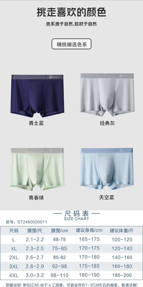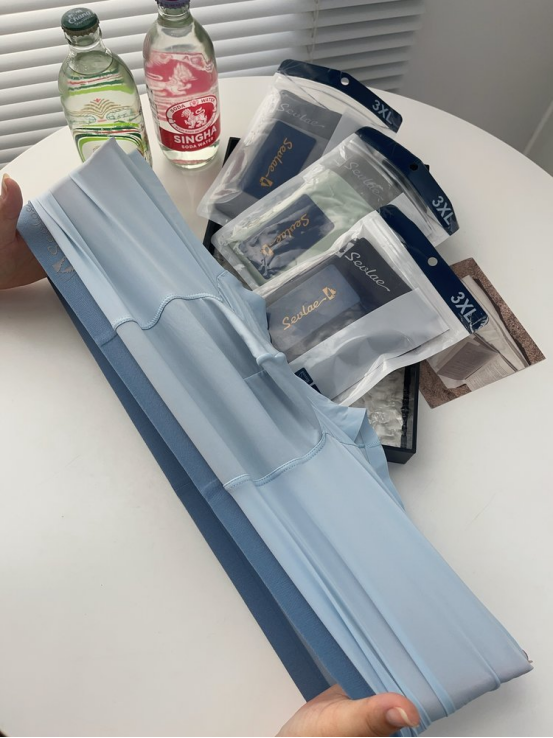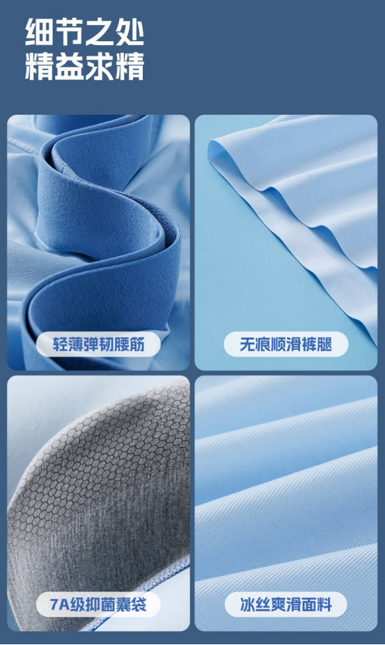 7A抑菌十120支冰丝十0.1cm轻薄=夏日王炸内裤 不再被浑身黏腻所困扰 每天都清清爽爽~ 真的好爱 裤衩子千千万万,最爱这条 冰凉透气又干爽柔软的男士内裤!!! 一片式裁剪工艺不会夹pp 抗菌透气裆部,不卡裆 裤腿无痕压线,不卷边 侧边无缝,无膈应感!总之真的舒服!!!