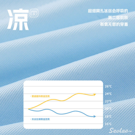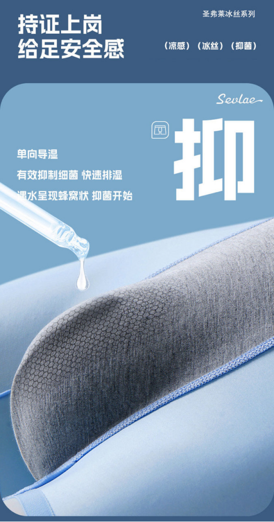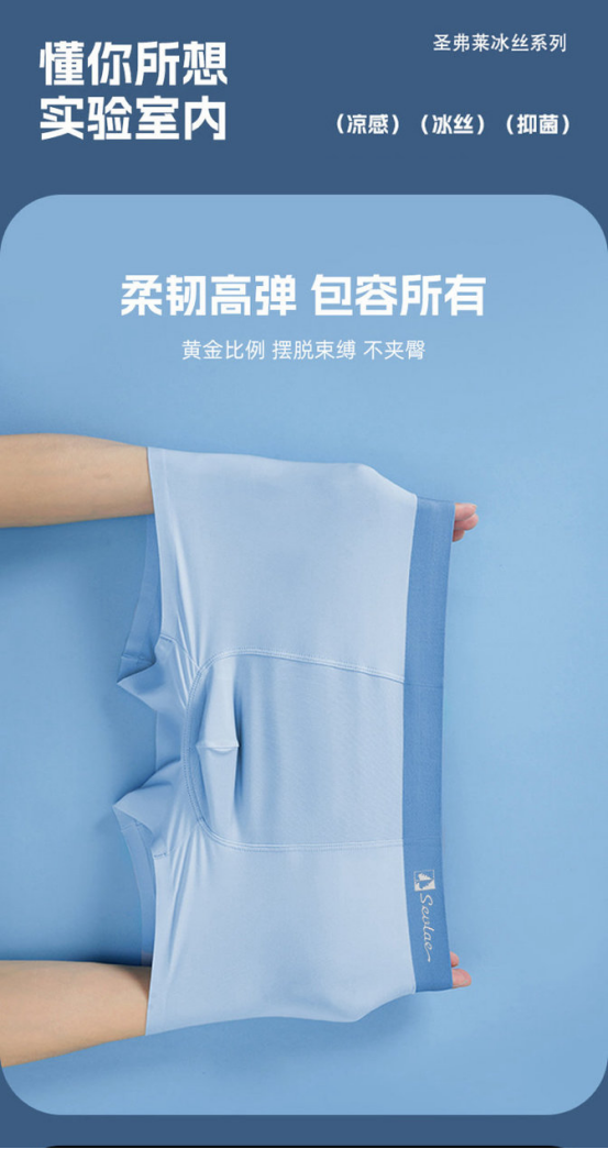 「圣弗莱Sevlae男士120支冰丝内裤」 炙热夏至,幸好有它 男士夏日好物 冰爽新体验 : 自带“空调”感的内裤 ▪超薄弹力冰感面料 穿上立降5℃! ▪7A抑菌 快速排湿 遇水现蜂窝状 抑菌开始 ▪无痕贴合工艺减少摩擦 U凸囊袋稳定支撑 ▪一片式立体裁剪 不易夹臀 让私处尽情享受头等舱体验