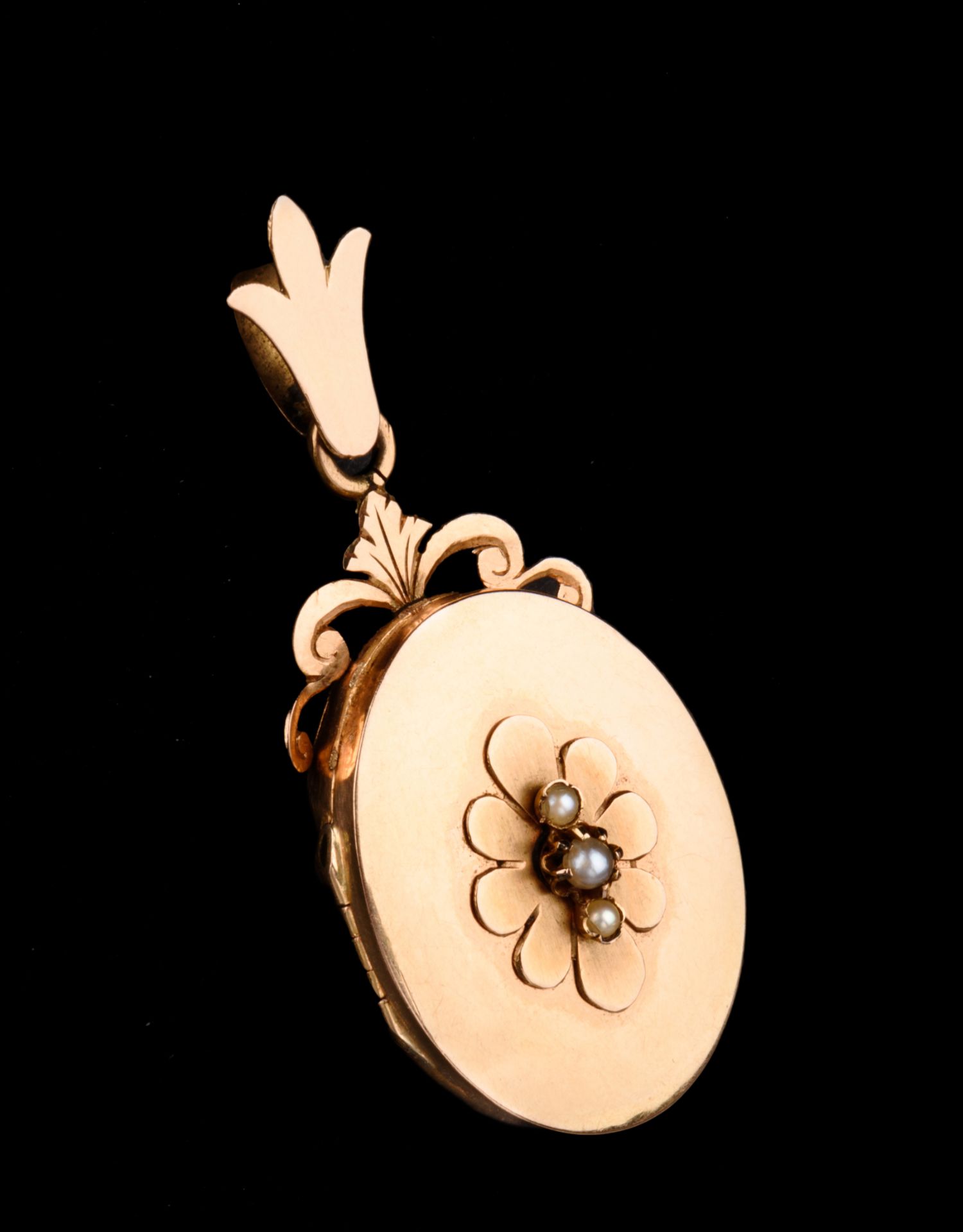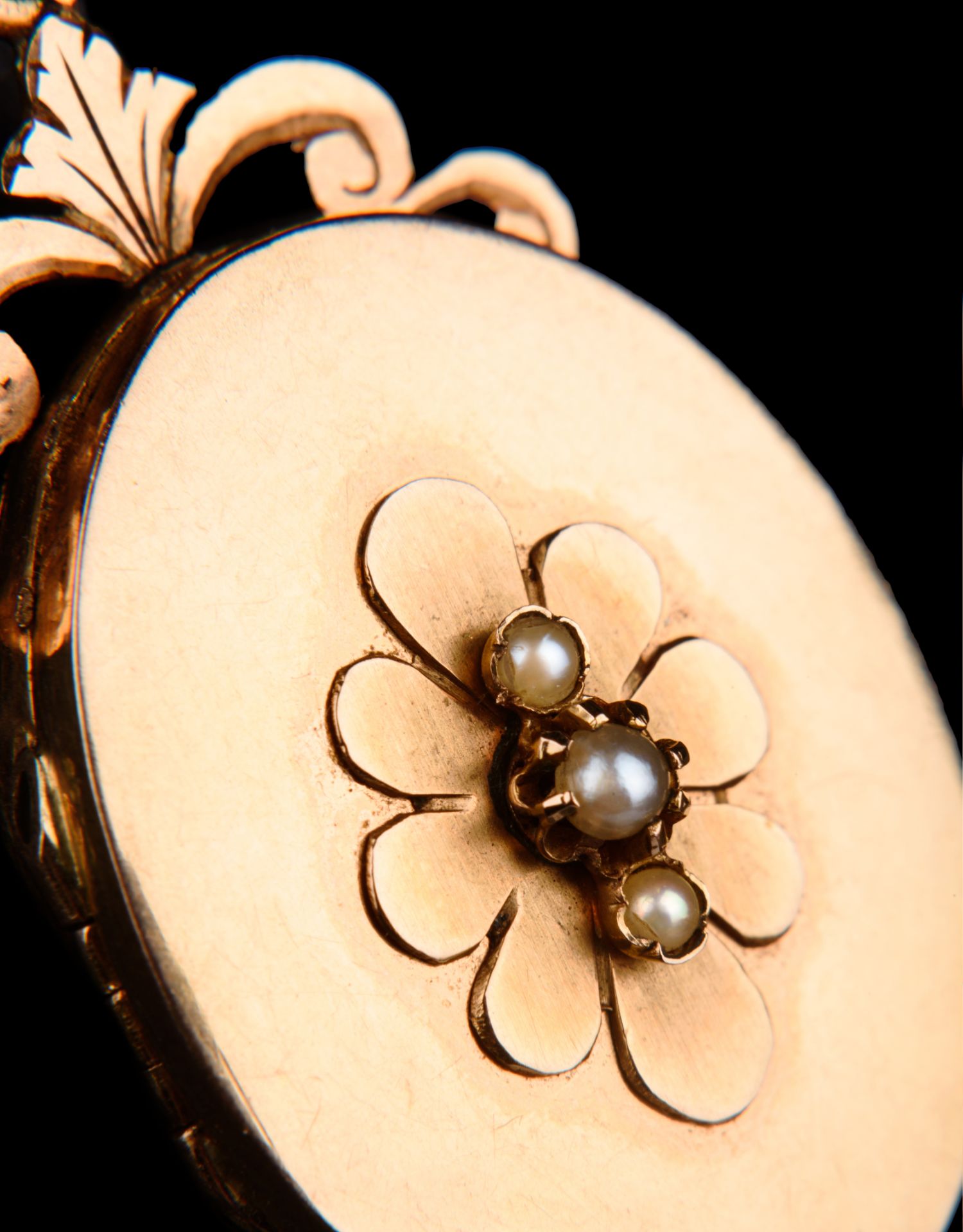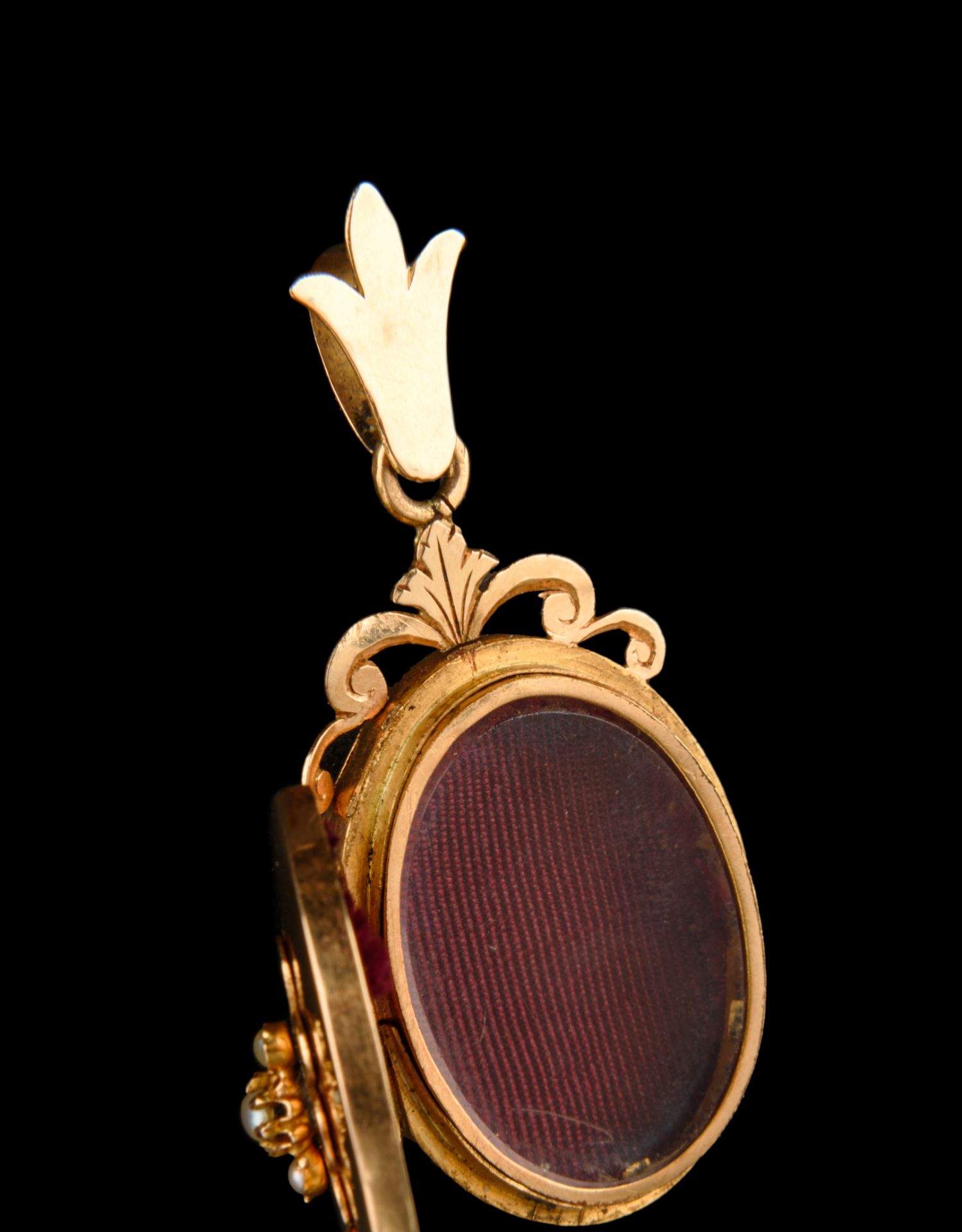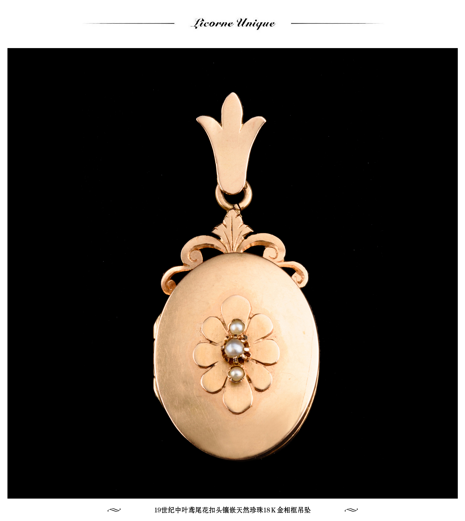 国内现货独角鹿西洋古董首饰鸢尾花扣头镶天然珍珠18k金相框吊坠