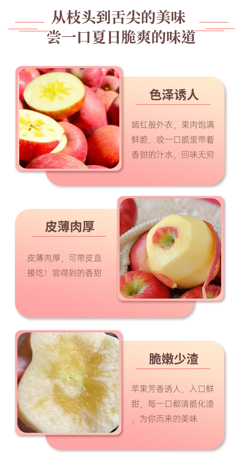 2.苹果表皮部分没有那么红是因为在树上受太阳照射的角度不一样,这是正常现象,不影响食用哟!