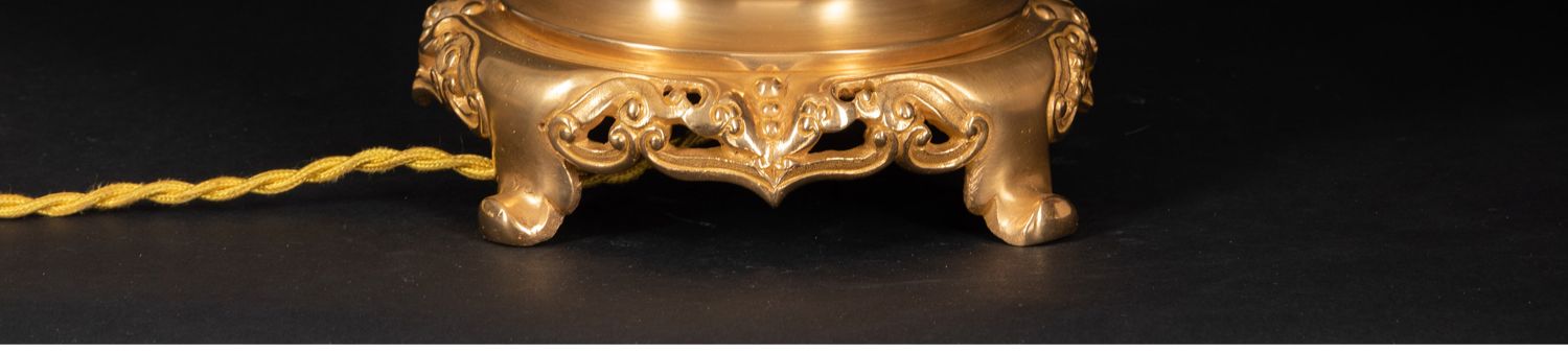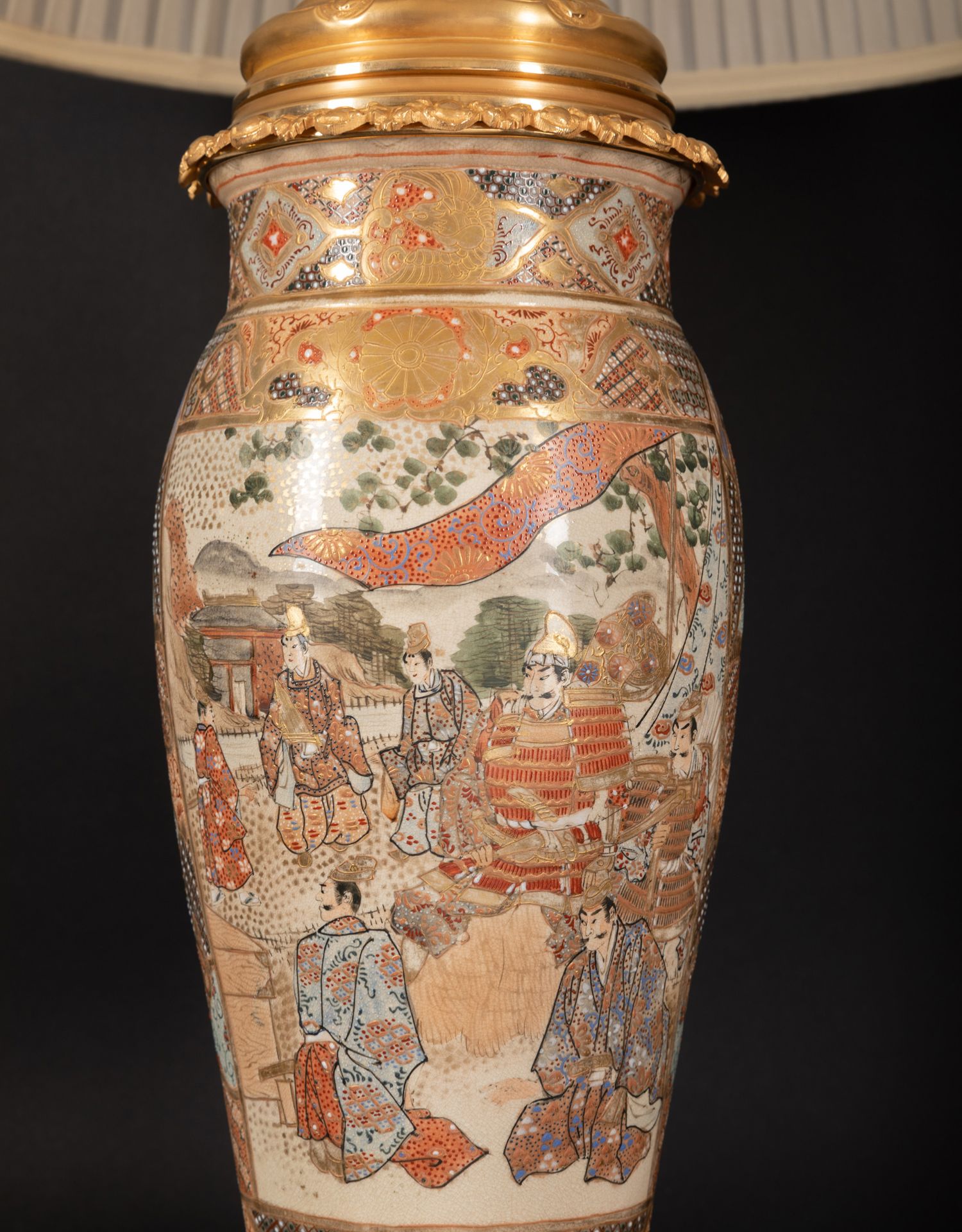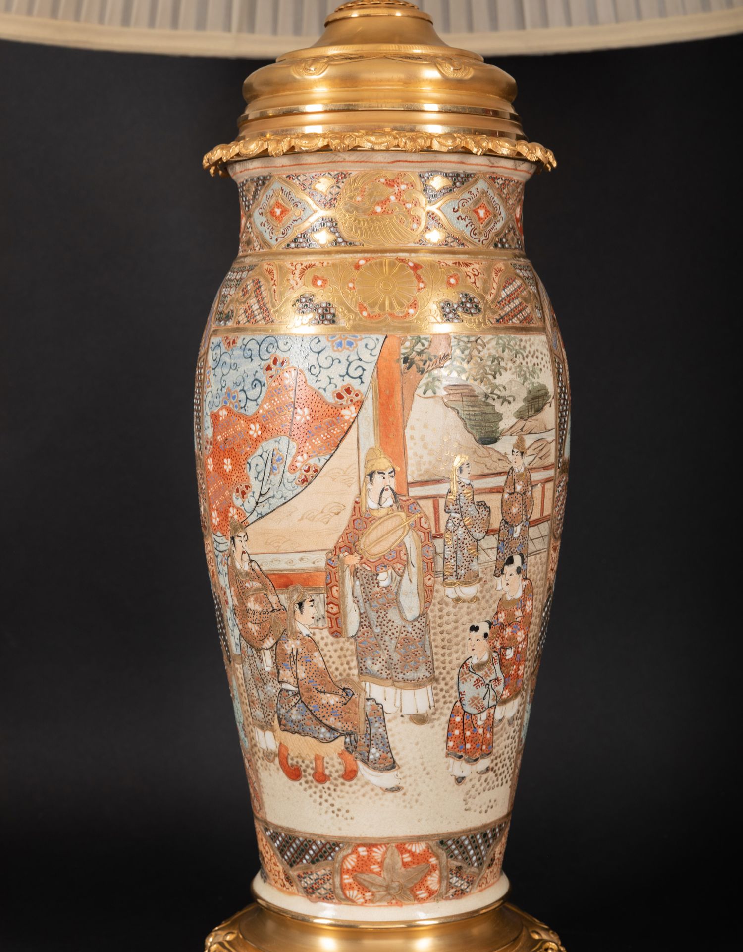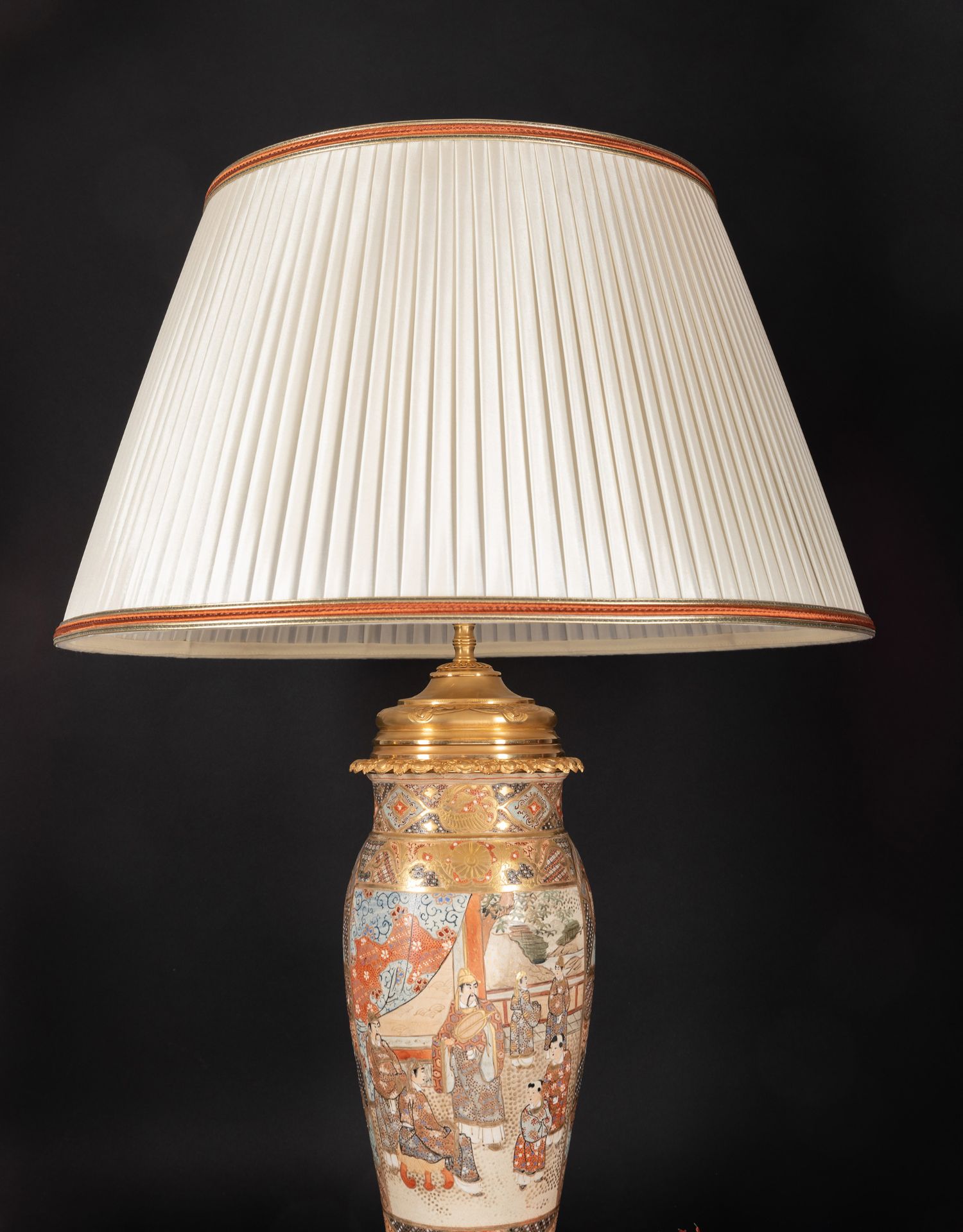 独角鹿西洋古董铜鎏金嵌东方人物萨摩烧瓷瓶手工缎面百褶灯罩台灯