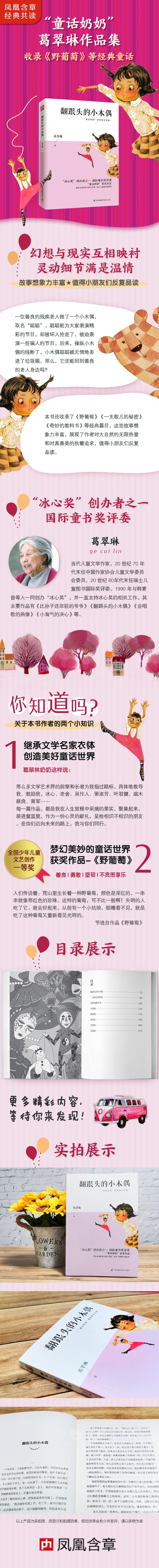 《翻跟头的小木偶》讲述了一位善良的残疾老人做了一个名叫“聪聪”的小木偶,它能为大家表演精彩的节目。但不幸的是聪聪被坏人抢走了,它被迫开始表演一些骗人的节目。后来,操纵小木偶的线断了,小木偶聪聪被无情地丢进了垃圾箱。那么,它还能回到善良的老人身边吗?本书还收录了《野葡萄》《一支歌儿的秘密》《奇妙的教科书》等经典篇目,这些故事想象力丰富,展现了作者对大自然的无限热爱和对真善美的执着追求,值得小朋友们反复品读。