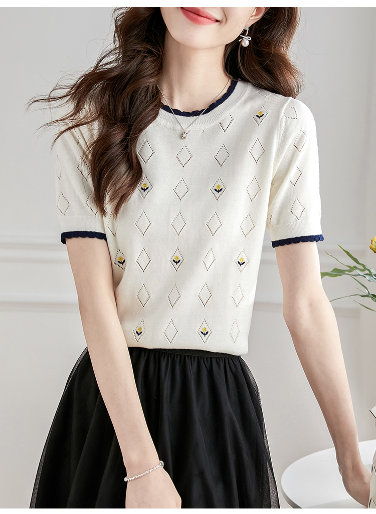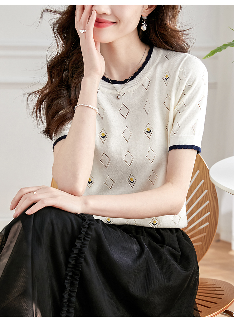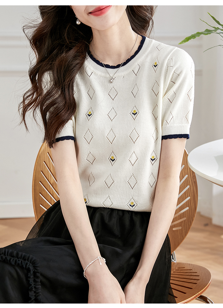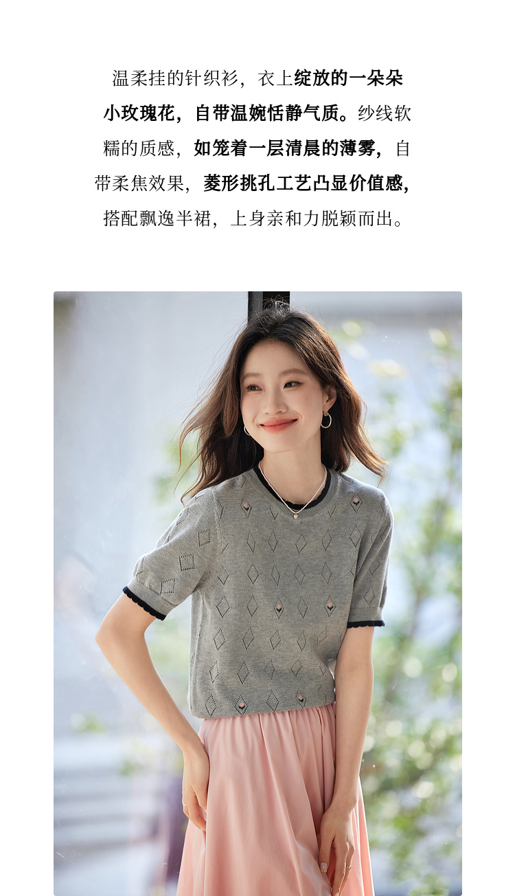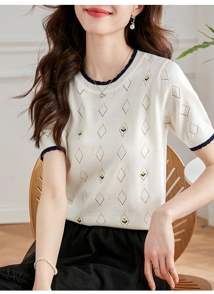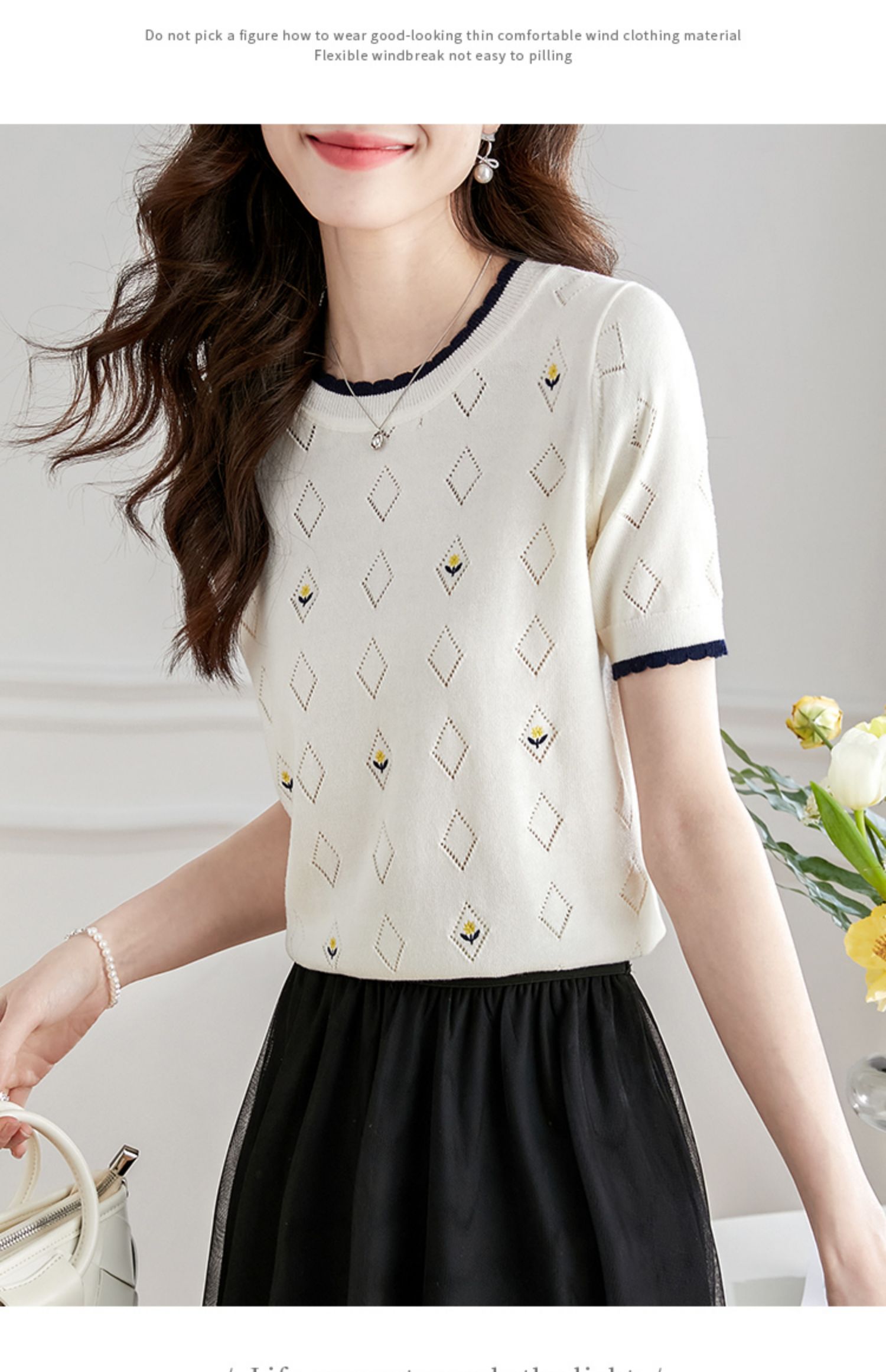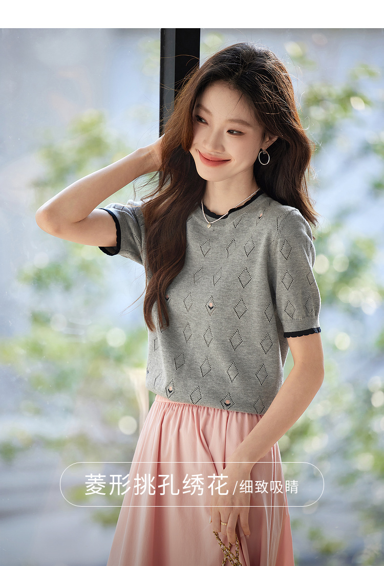 【专属特价】熙世界菱形镂空薄针织衫女短袖2025夏季新款复古刺绣半袖冰丝上衣