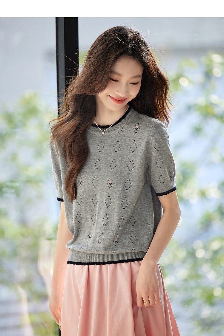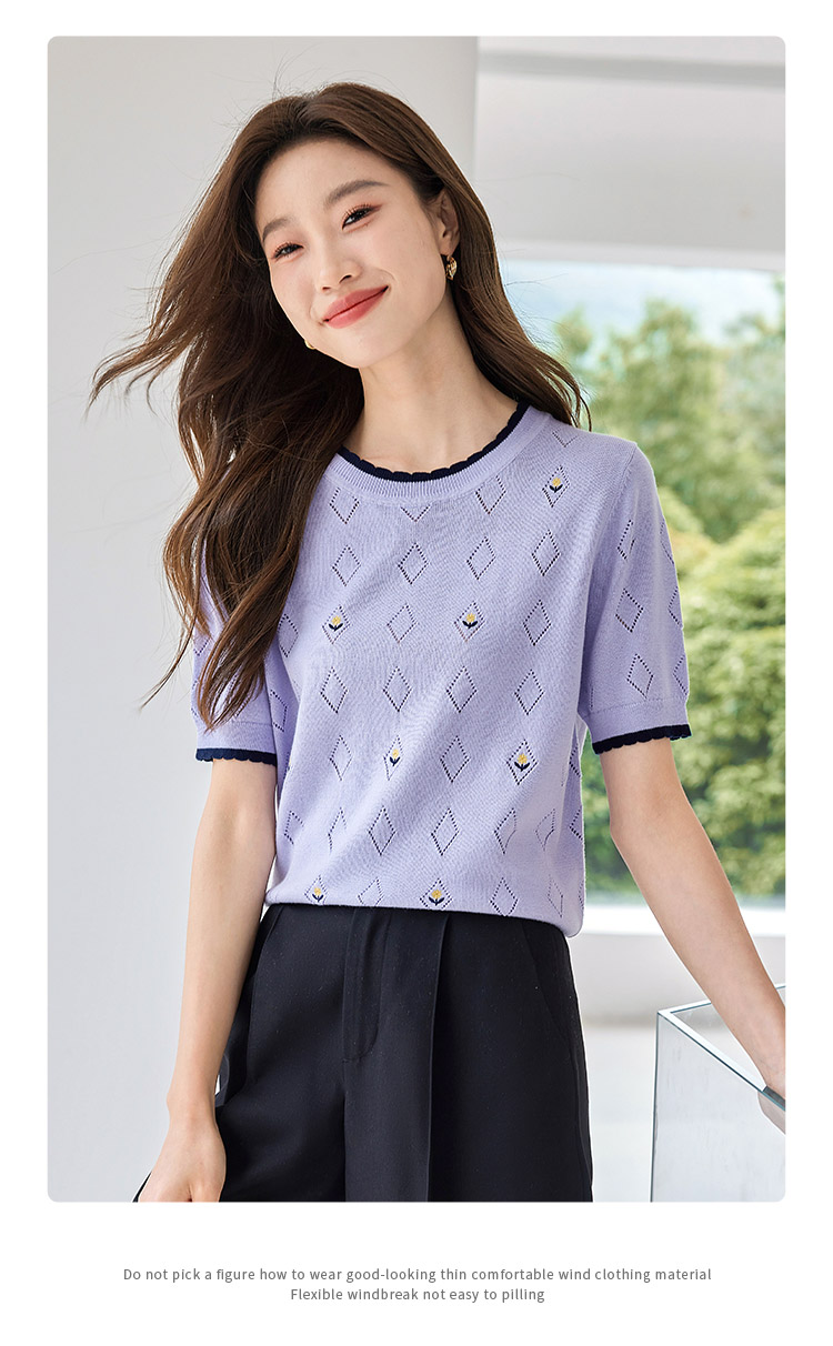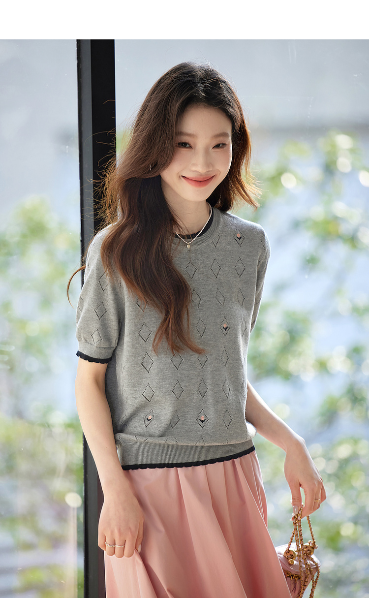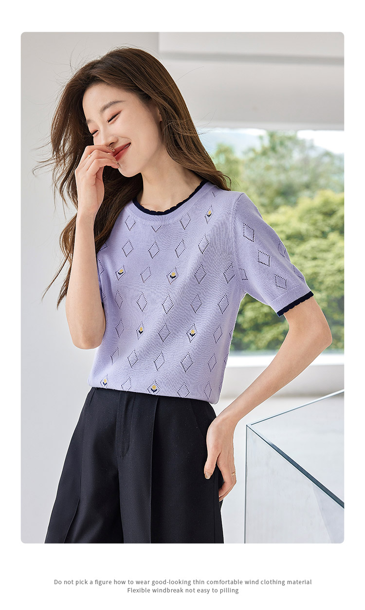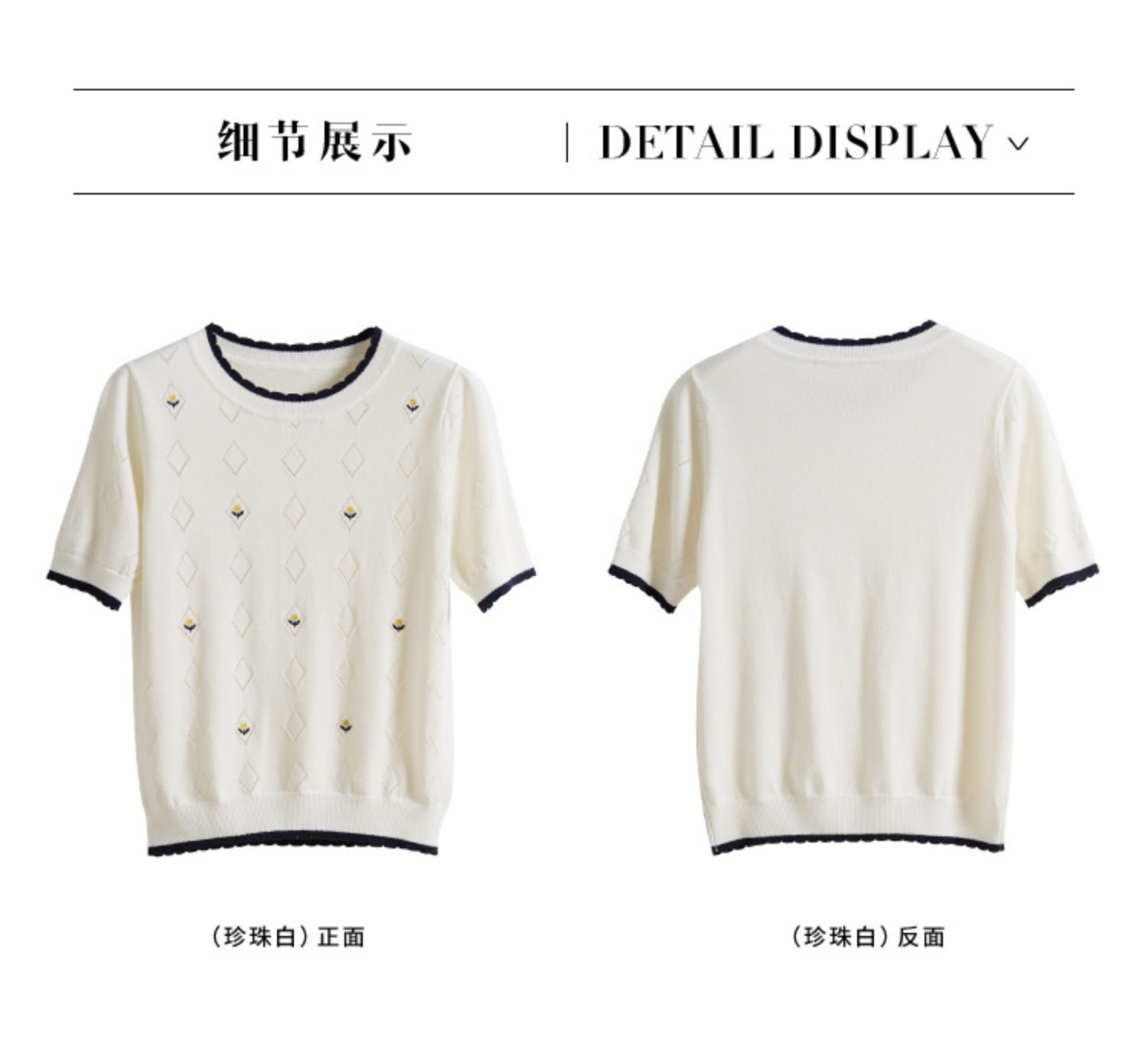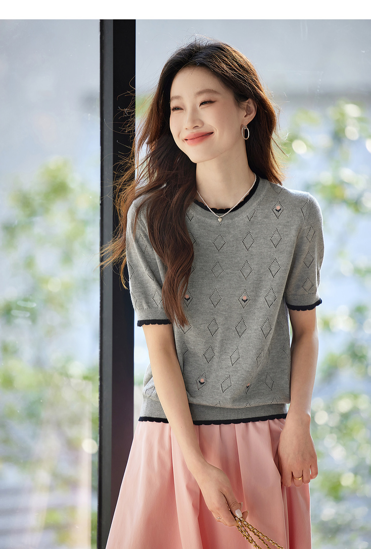 【专属特价】熙世界菱形镂空薄针织衫女短袖2025夏季新款复古刺绣半袖冰丝上衣