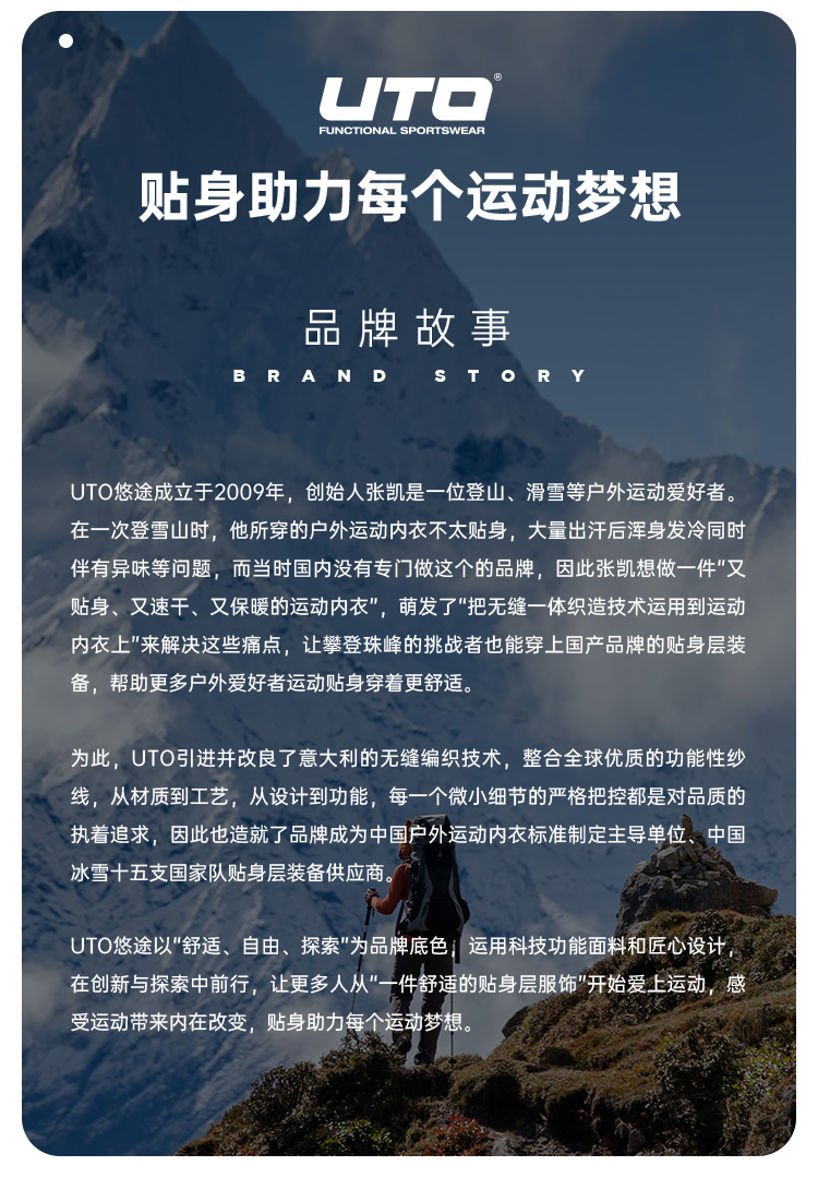 UTO悠途潜心于贴身运动装备的研发、设计和生产。从纤维到组织,从设计到工艺,在无缝贴身运动装备领域,树立国内标杆。 UTO着力于品牌互联网化,不断采集大量运动数据,为跑步、健身、滑雪等不同类型的运动爱