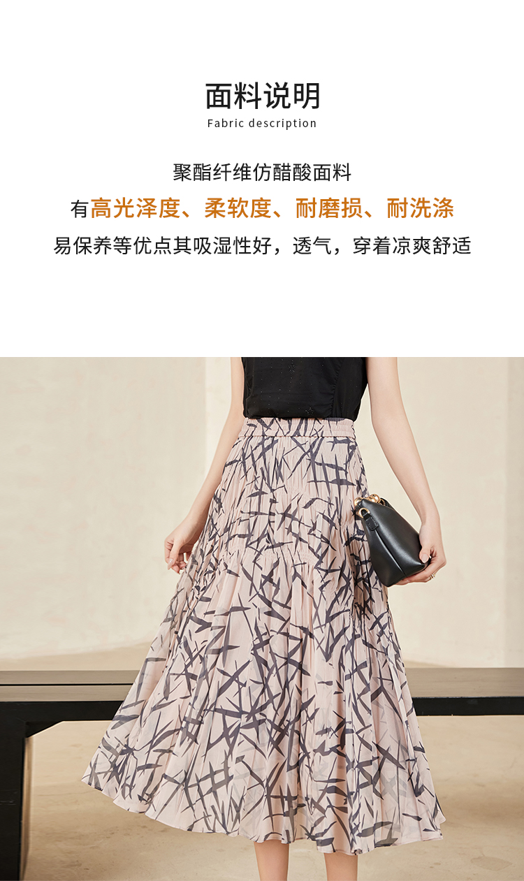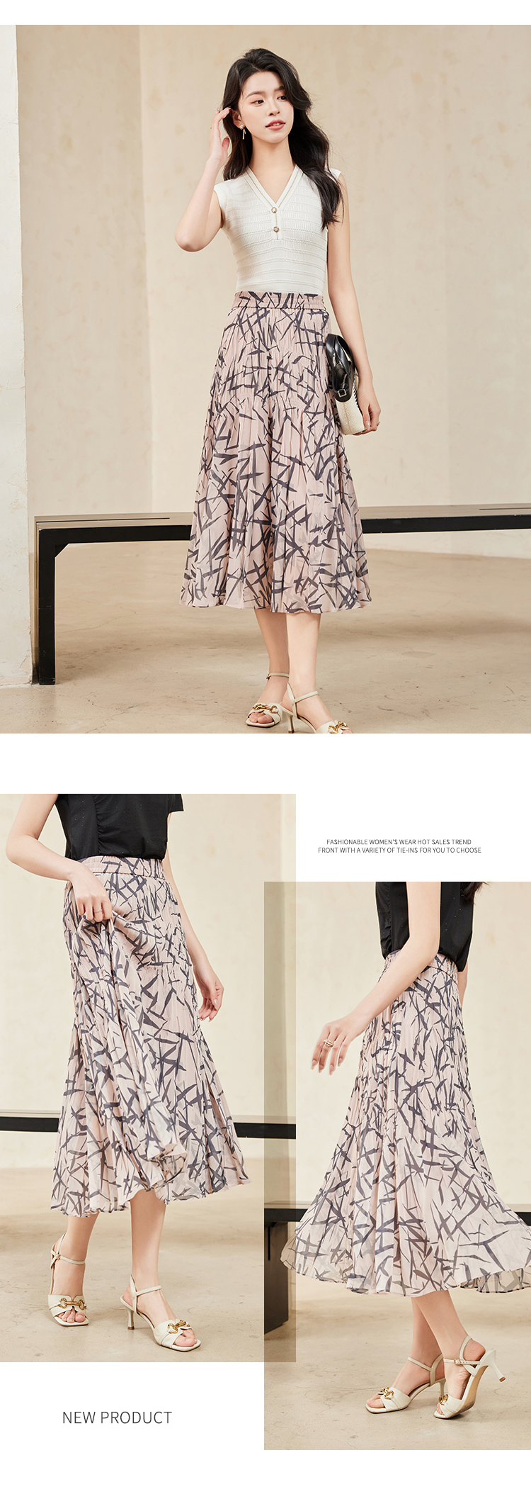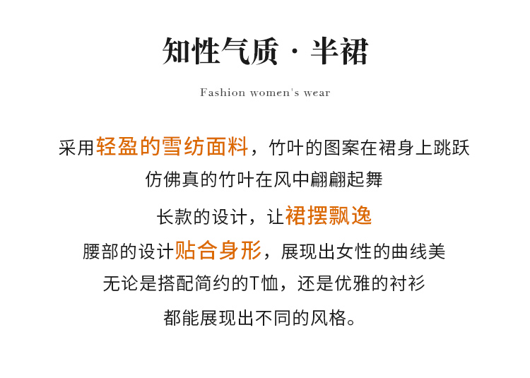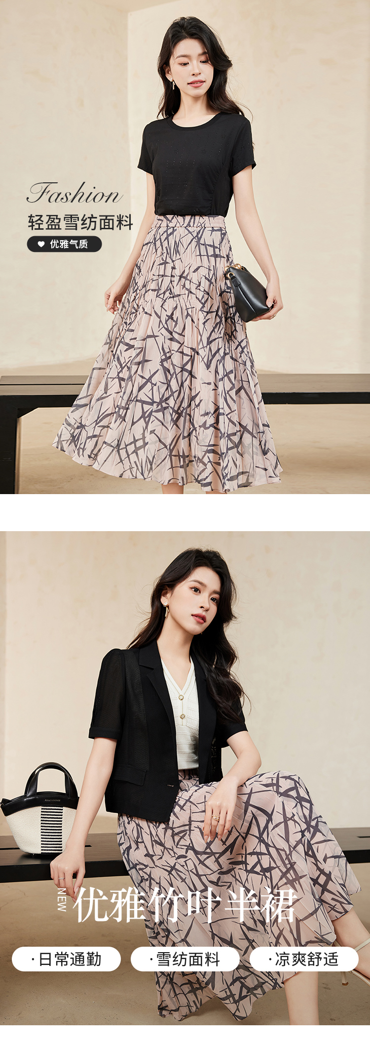 【商场同款】CJSJ428 “ 清新竹叶半裙 ” 低饱和粉色调 结合竹叶印花图案展现东方女性的淡然闲适、雅致韵味 塔裙结构设计 富有层次 显高显瘦 轻薄雪纺抗皱舒适