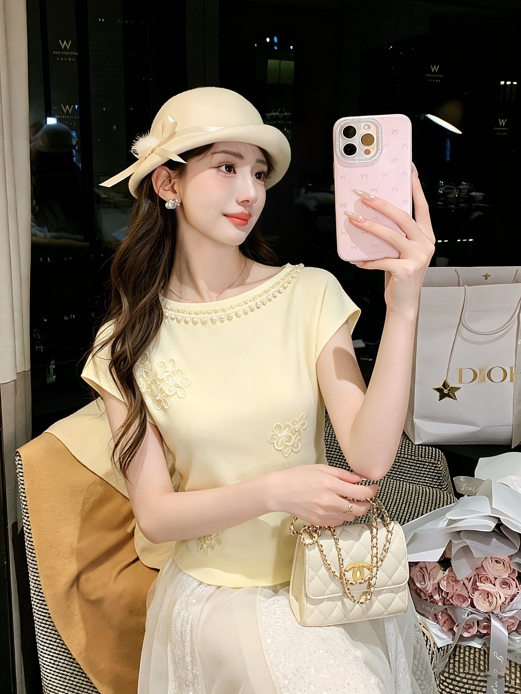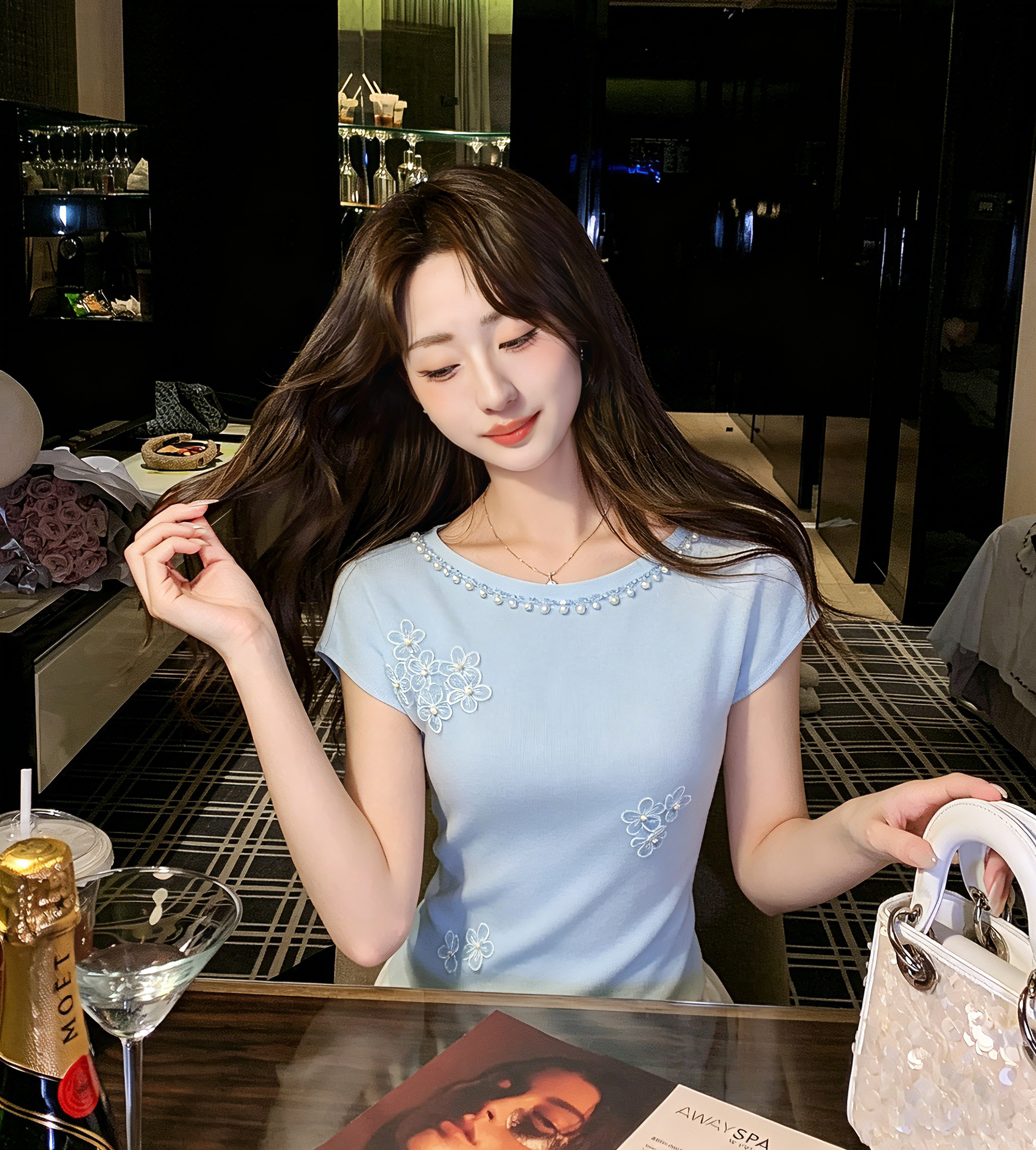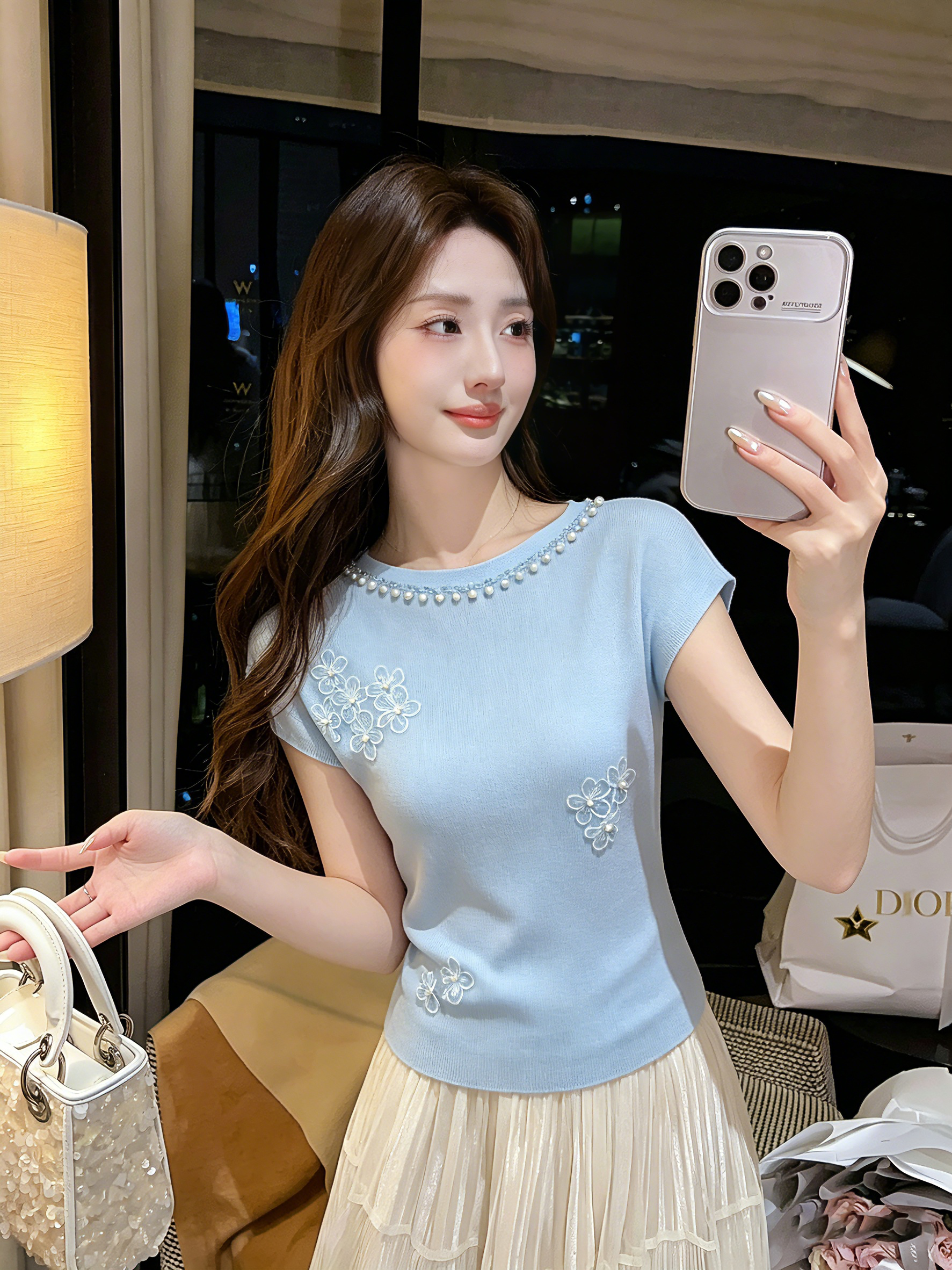 张心子【华丽共谋者】设计感钉珠立体花针织衫女夏新款法式绝美上衣 U2604013