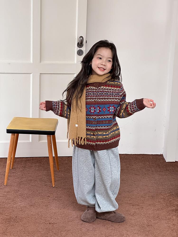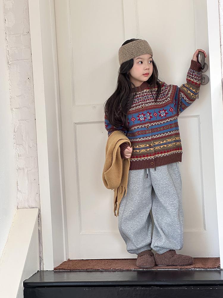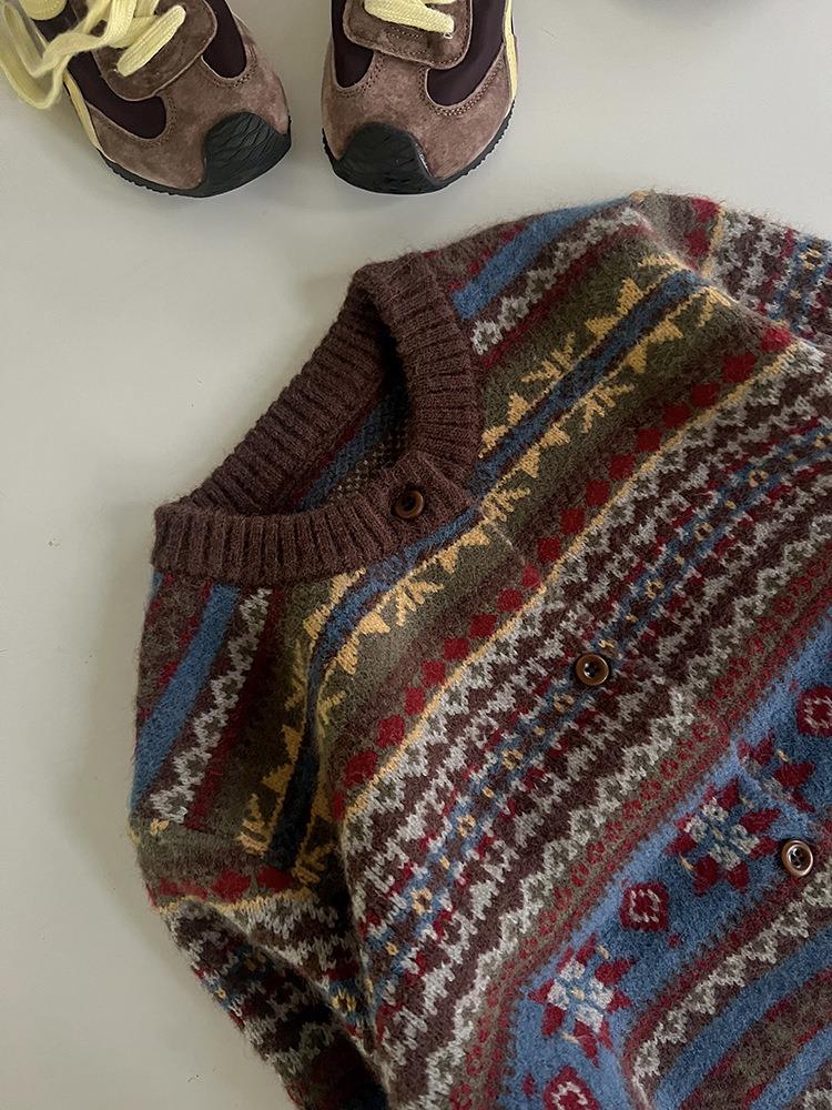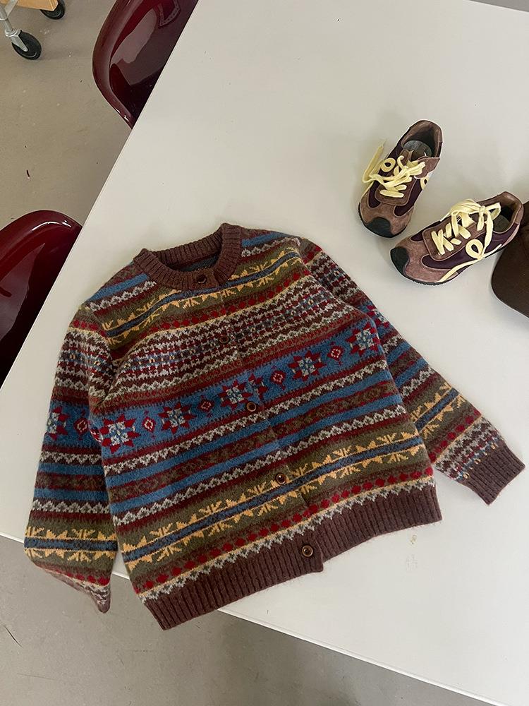 艾摩贝贝童装2025冬季女童复古浪漫费尔岛毛衣提花绵羊毛针织外套