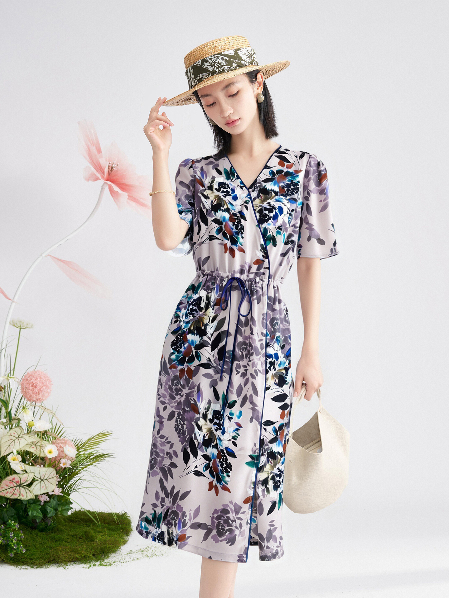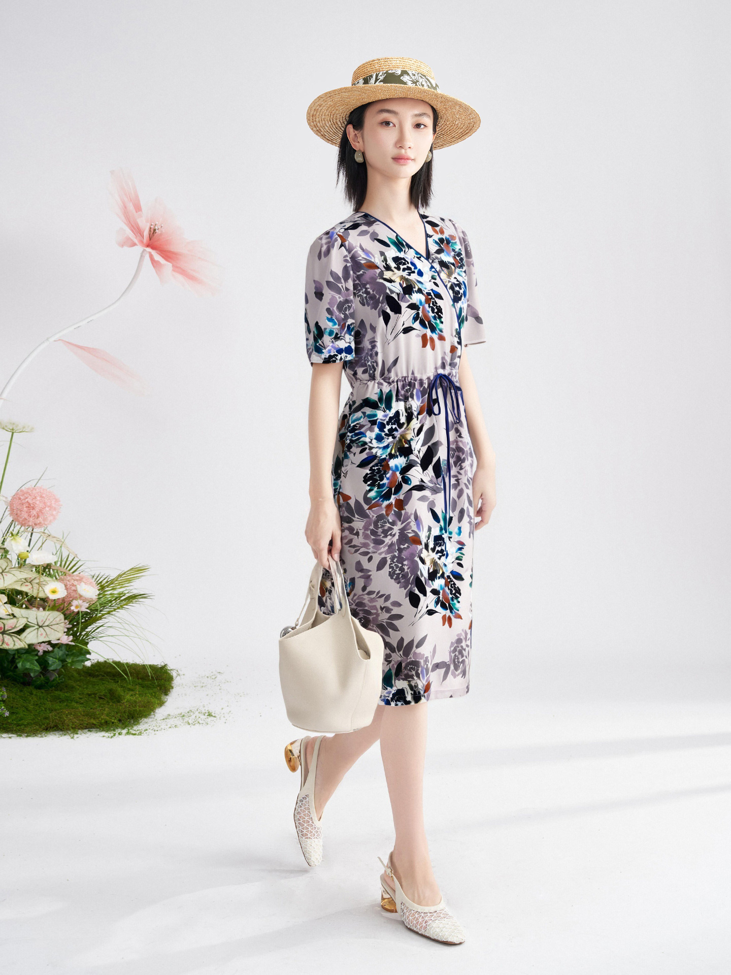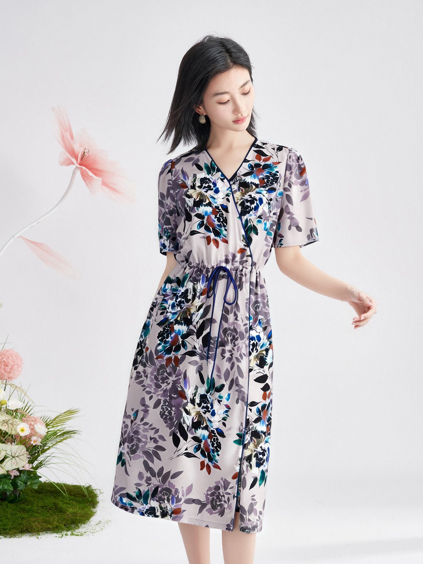 米思阳2025夏新品知性优雅花卉印花连衣裙系带收腰显瘦裙子女3686